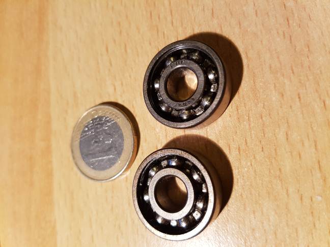 Ciao Giovanni, cuscinetti piccoli ci sono: nel foro centrale passano i cavi solidali alla parte interna del cuscinetto e al foro. L'esterno del cuscinetto viene fissato ad una parte fissa, in modo che ruoti solamente laparte interna. La girante è una sorta di guida-cavi che evita la torsione in un solo punto del cavo e lo sfregamento. P.S. la moneta da un €, è poco più grande dei due cuscinetti, l'immagine non lo fa notare. [;)]73 de