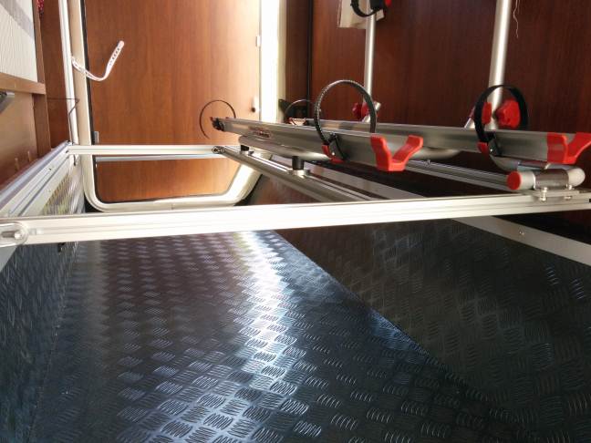 Se hai le bici pieghevoli, potresti sfruttare la piegabilità come ho deciso di fare sul nuovo camper: io ho fatto anche il doppiofondo, ma anche se non lo vuoi fare, in questo modo le due bici occupano in larghezza circa1/4 (o comunque meno di 1/3) del garage e a queste è dedicato il portello destro, mentre il resto del garage è vuoto e accessibile comodamente dall'altro portello. Tommaso IZ4DJI www.iz4dji.it