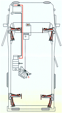 Il sistema Il sistema di stazionamento AMPLO consente di stabilizzare e di livellare il veicolo su quattro piedi idraulici sfruttando l'escursione dei gruppi sospensione-ammortizzatore. Questo garantisce stabilità, sicurezza e confort, evitando oscillazioni e rischi di movimenti indesiderati del veicolo. E' costituito da kit, disponibili in diverse versioni, composti da 2 oppure 4 cilindri pieghevoli che vengono fissati al telaio del veicolo. Sono a scomparsa completa in assetto di marcia. Essi vengono manovrati da una centralina idraulica, provvista di valvole di blocco per i cilindri e di una pompa di emergenza da usare in caso di avaria del sistema. Una centralina elettronica con comando a distanza consente di azionare con la massima comodità ed in assoluta sicurezza 4 cilindri per posizionare il sistema, e 2 cilindri alla volta per livellare il mezzo, evitando di concentrare lo sforzo su un solo punto del telaio. Con il telecomando è infine possibile correggere 1 cilindro alla volta in casi estremi. Il comando manuale resta azionabile dalla scatola ricevitore. Un controllore di bordo verifica la posizione in fase di discesa del cilindro e controlla lo stato dello stabilizzatore in assetto di marcia, con led visivi ed un cicalino di segnalazione. Su richiesta, è disponibile un sistema elettronico di autolivellamento.