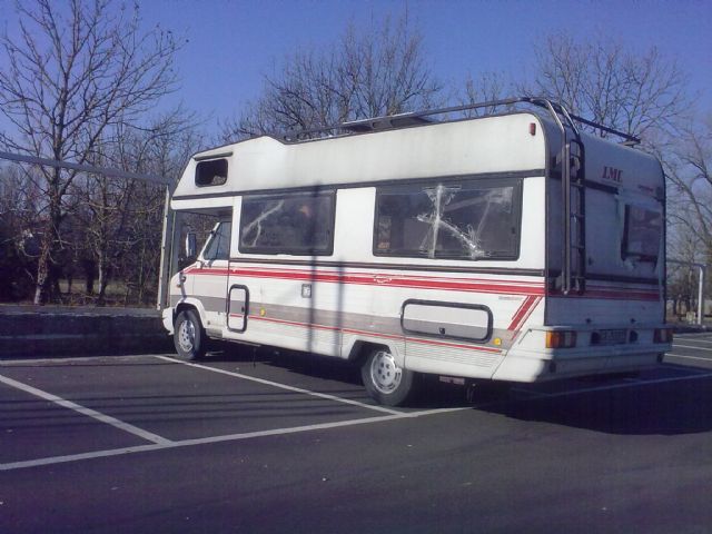 Ha la finestra della dinette sinistra spaccata ed aperta. Il veicolo sembra abbandonato. |