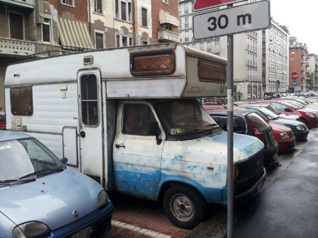E' parcheggiato da alcuni mesi, ha scritte 'Biella Camper' e 'Coatto', l'assicurazione è scaduta a novembre 2004: sembra proprio abbandonato. |