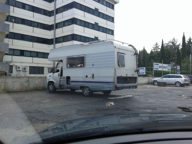 Ha una grande finestra posteriore (dinette a U posteriore, probabilmente). Sono due volte consecutive che lo incrocio, provenendo dalla direzione opposta, verso le 9.00. E' in mano a nomadi: che sia diretto in uno dei campi nomadi della zona? |