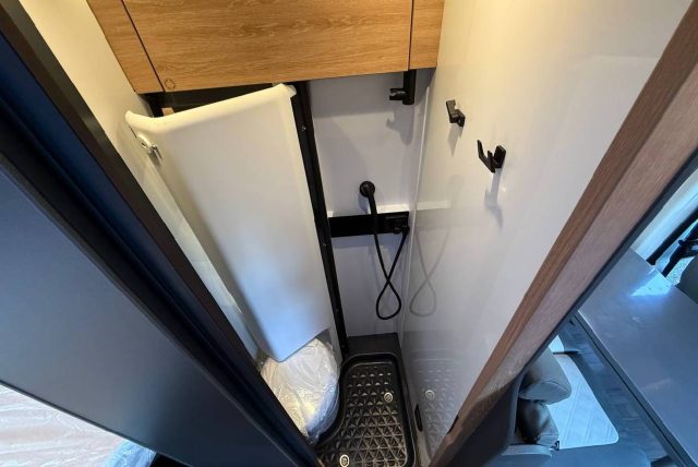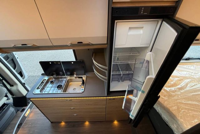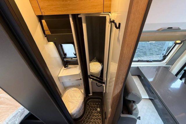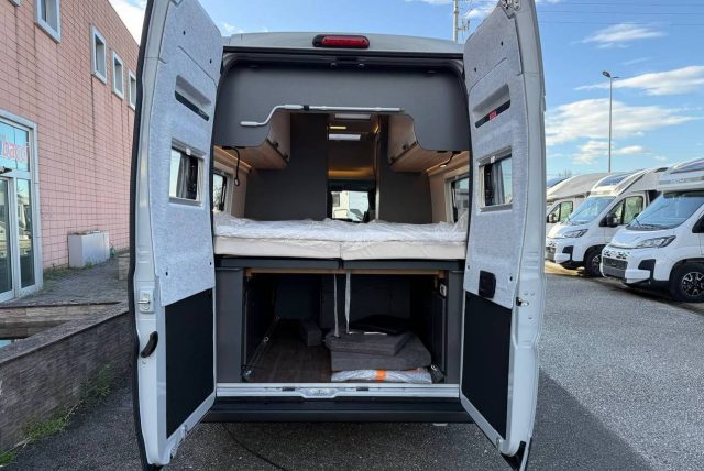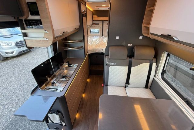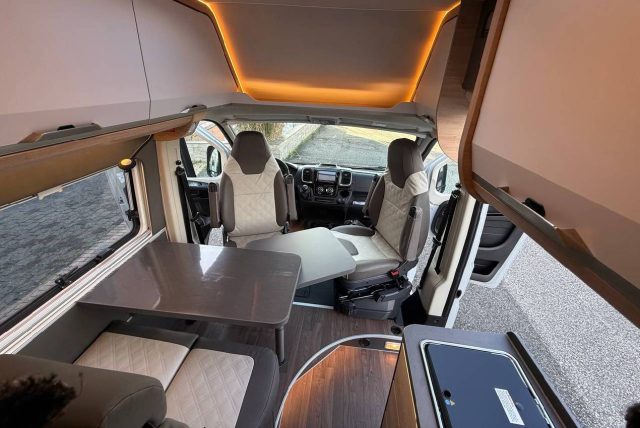 Van con letti singoli gemelli con sottostante gavone garage nella zona posteriore, bagno con doccia e cucina con frigo a compressore da 84 l nella zona centrale, semidinette con sedili anteriori girevoli..