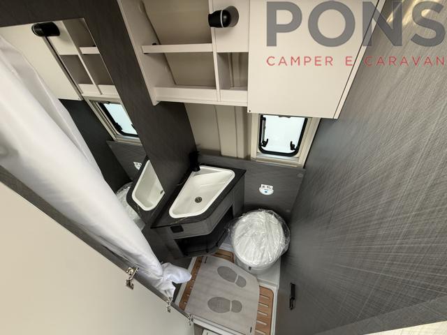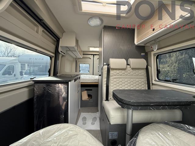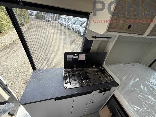 Sviluppato su una lunghezza di soli 5,41mt, accedendo al veicolo ci si affaccia su una luminosa dinette con sedili cabina girevoli e tavolo con piano d?appoggio supplementare orientabile, cucina composta da piano cottura a due fuochi e lavello oltre a un comodo piano di appoggio, non manca il frigorifero con relativo scomparto freezer.