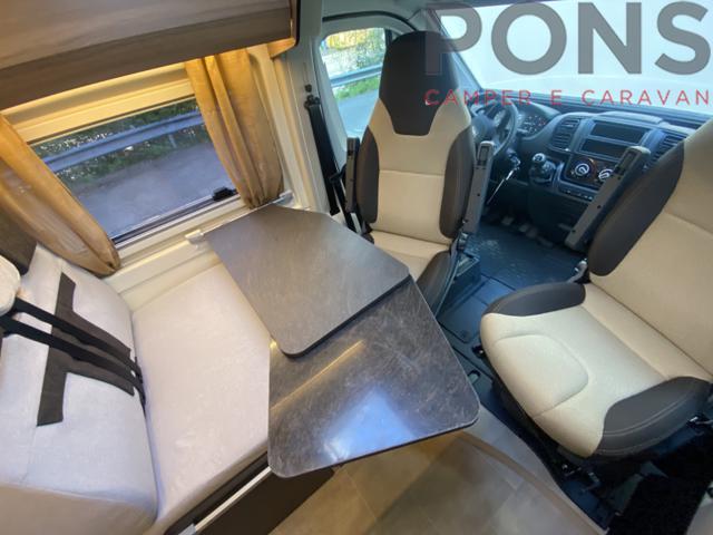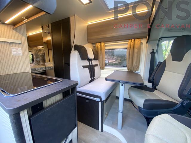 Cucina attrezzata con piano cottura a 2 fuochi, frigorifero a colonna e ampi spazi di stivaggio. Bagno con doccia, e una comoda dinette con tavolo dotato di prolunga ruotabile e sedili cabina girevoli.