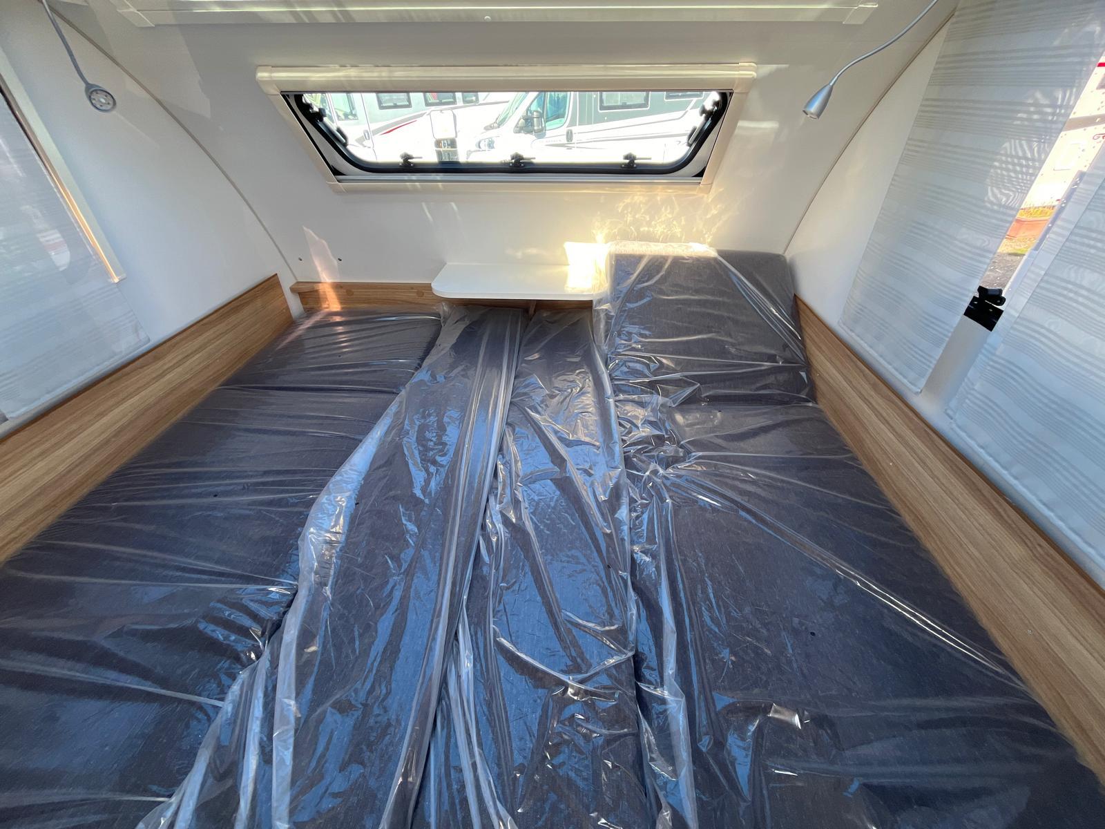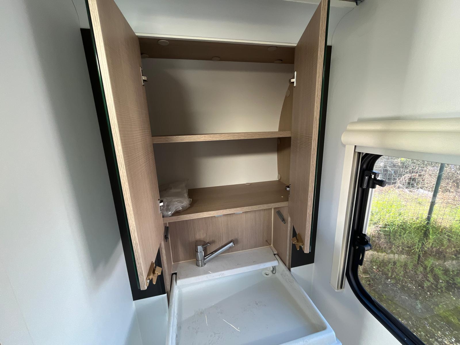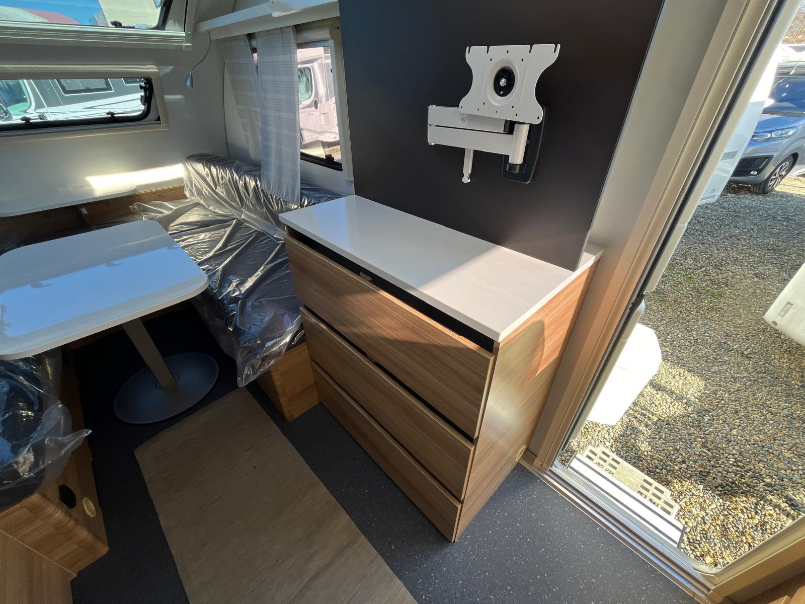Ampia dinette, 3 posti letto, letti gemelli, tavolo regolabile in altezza e gamba telescopica che li trasforma in maxi letto matrimoniale, Zanzariera scorrevole porta ingresso, con porta a scuderia, Riscaldamento TRUMA con canalizzazione, BOILER TRUMA THERME (5 lt), Cucina con fornello a 3 fuochi, coperchio di vetro e lavello in acciaio, Frigorifero 140 l, Forno a microonde, Amplificatore bluetooth, Altoparlanti e preinstallazione bluetooth, Porta TV .
