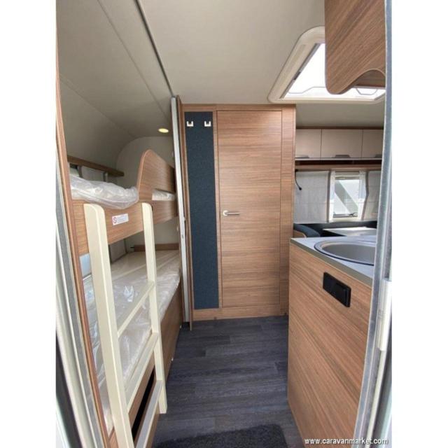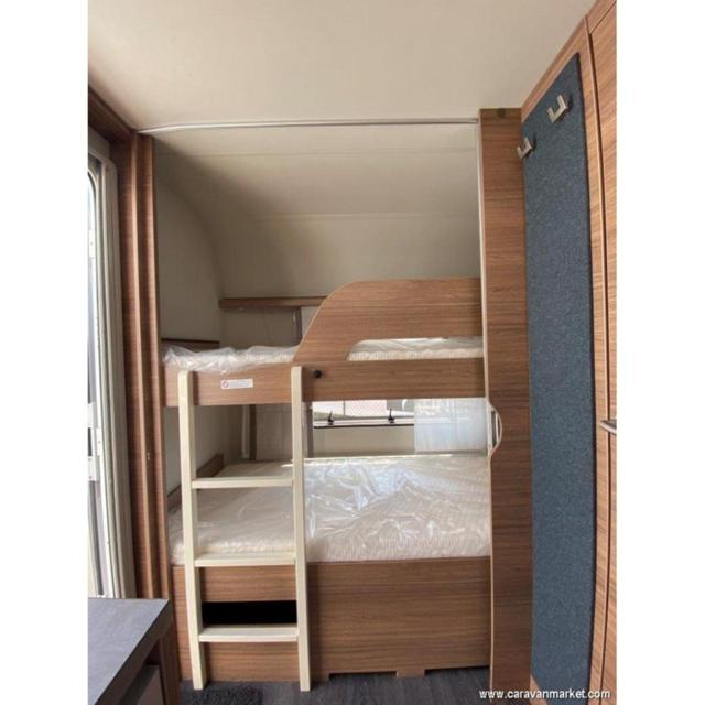 LA SUA DISPOSIZIONE PREVEDE LETTO MATRIMONIALE TRASVERSALE, BAGNO CON LAVADINO E BOX DOCCIA SEPARATO, DINETTE CLASSICA TRASFORMABILE IN LETTO, CUCINA CON FRIGO ampia A COLONNA, LETTO A CASTELLO IN CODA E AMPIO ARMADIO. Caratteristiche di Serie &, Dotazioni di Serie Tetto in Vetroresina Spessori: Tetto (mm.): 31 Pareti (mm.): 31 Pavimento (mm.): 38