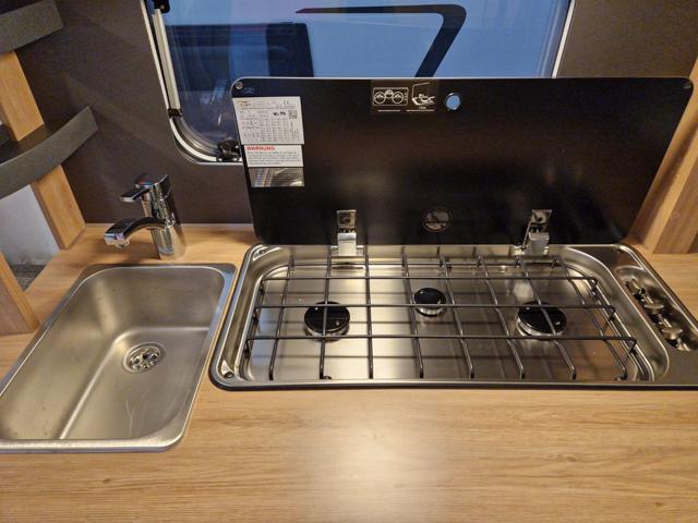 Fornello a 3 fuochi con ripiano di copertura in vetro, lavello in acciaio inox