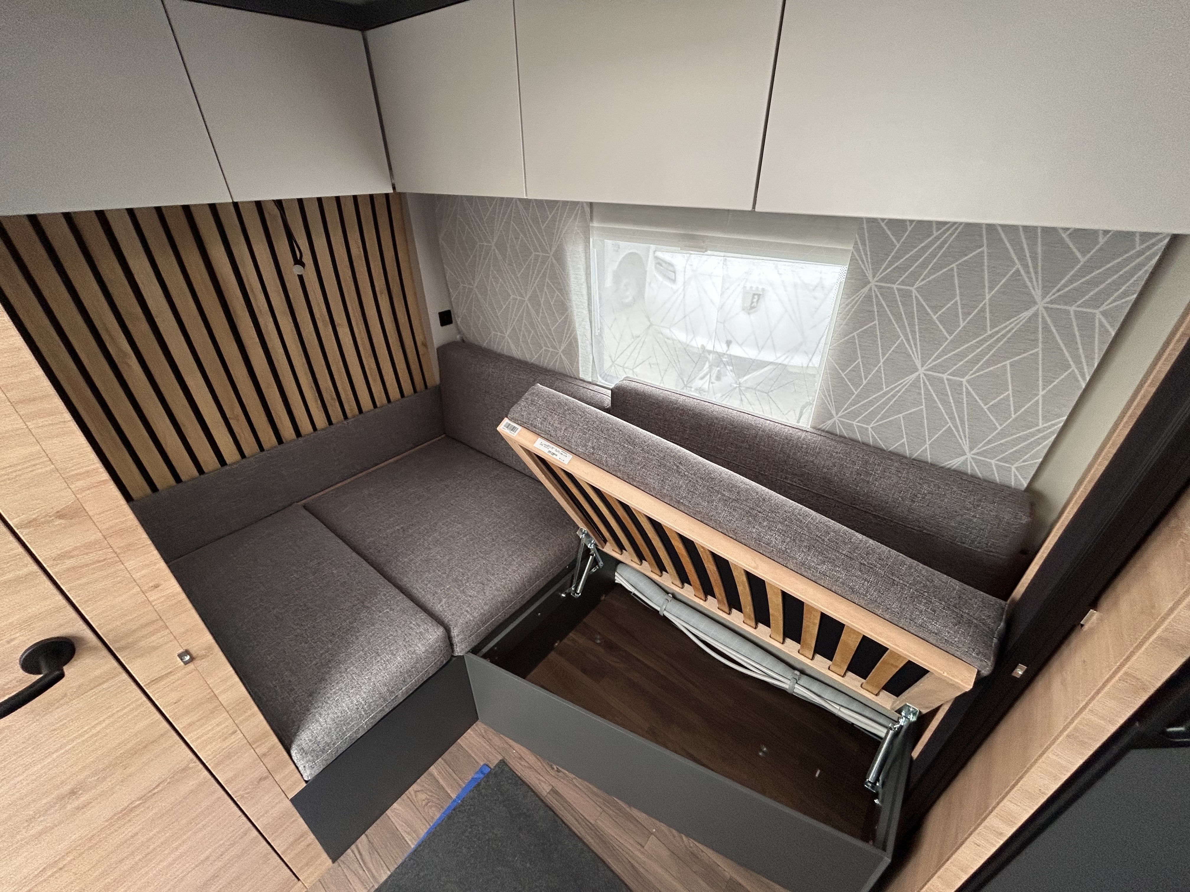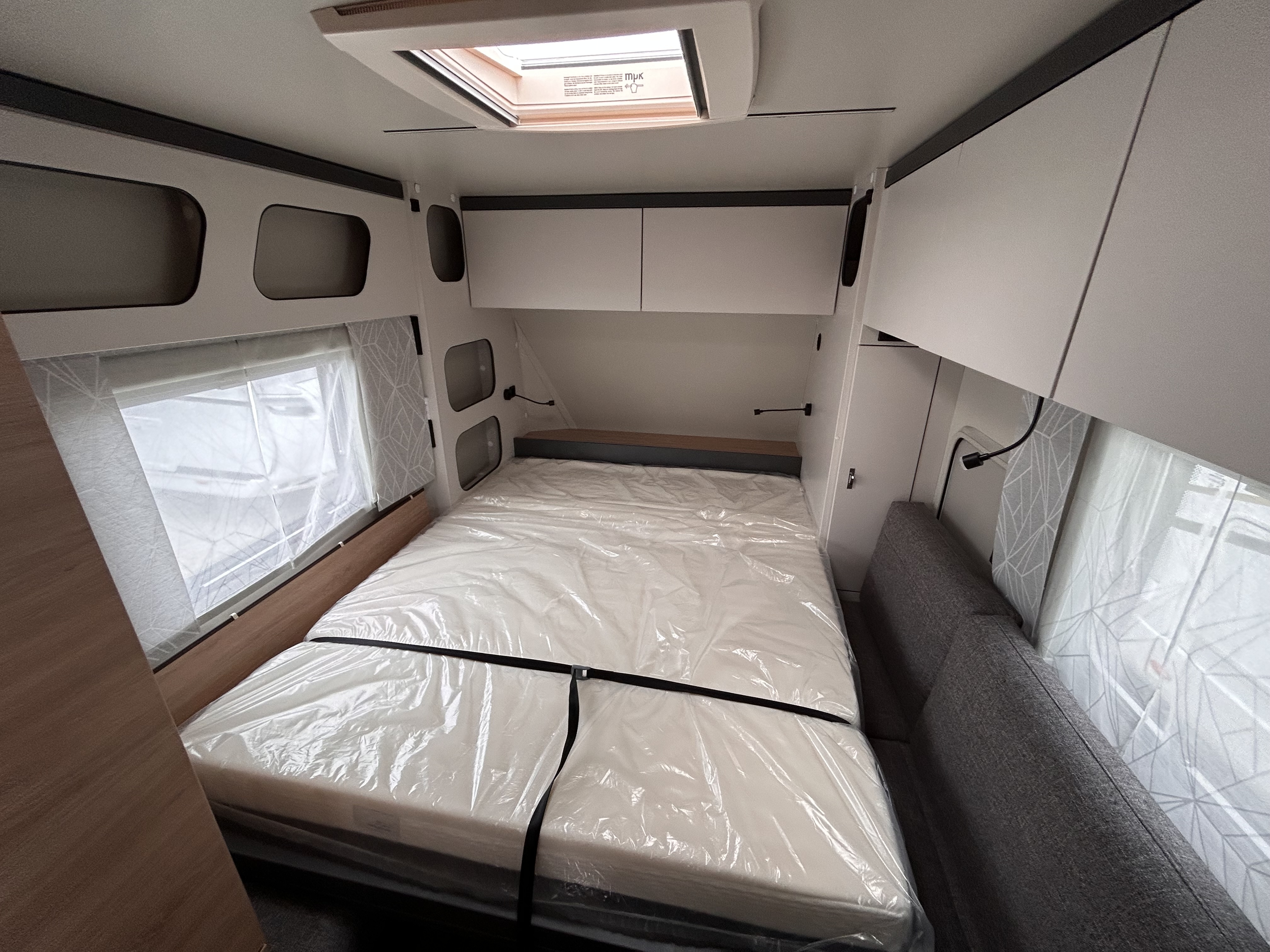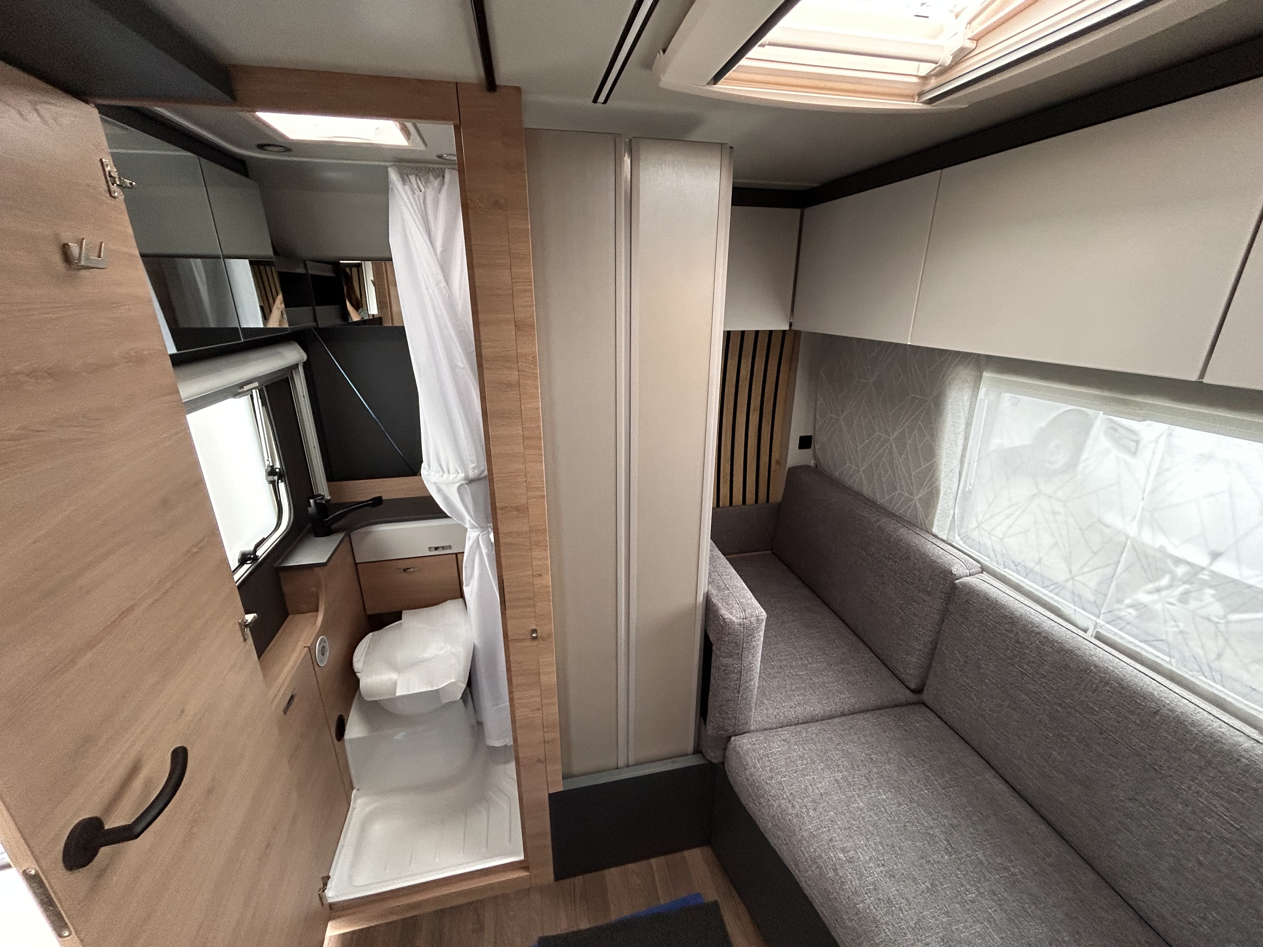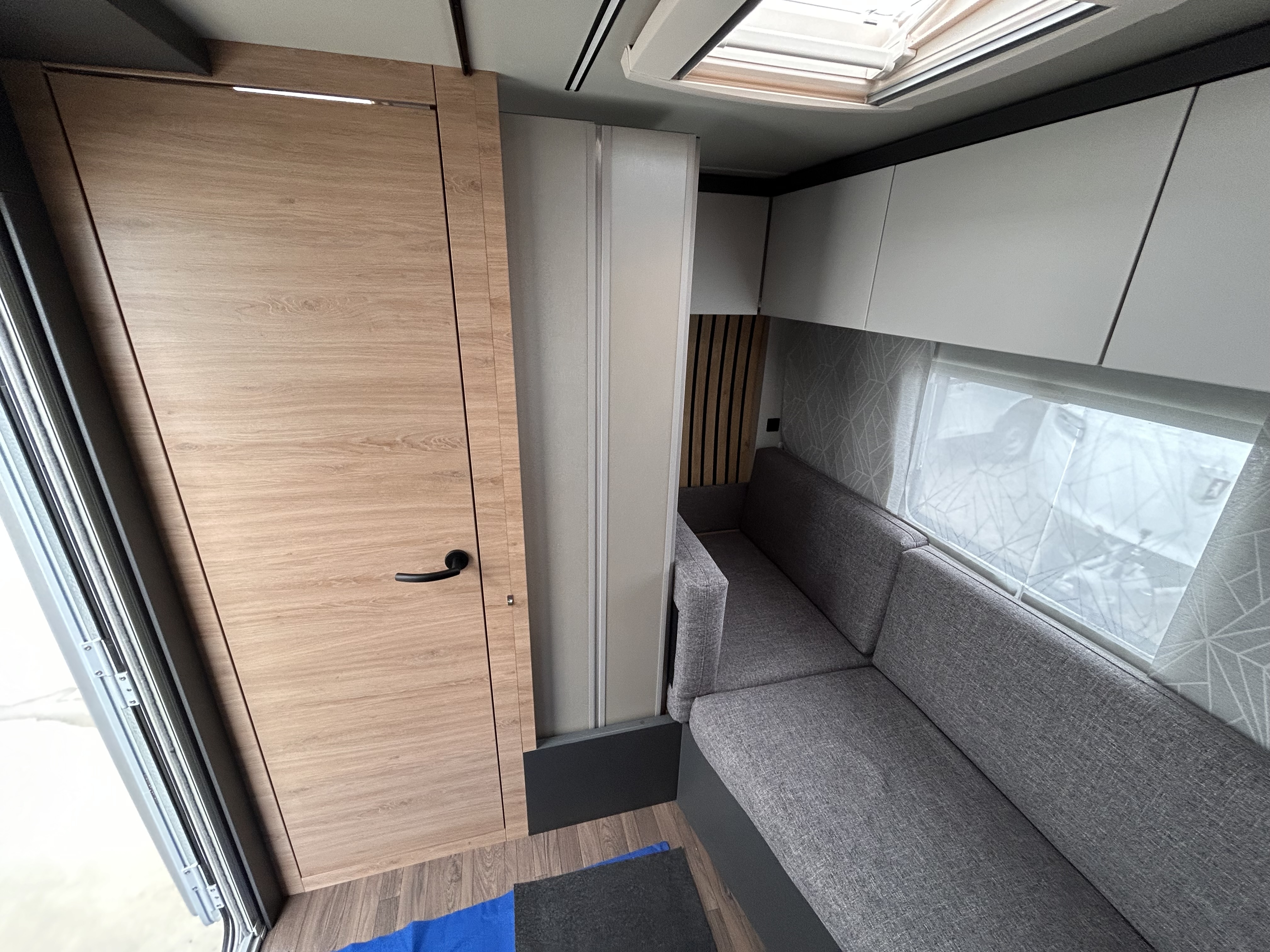 PACCHETTO TRASPORTO : Sportello di servizio 70 x 30,5 cm, posteriore dx – Sportello di servizio 70 x 30,5 cm, posteriore sx – Portellone garage 62,5 x 110 cm, dx – Occhielli di ancoraggio e binari di ancoraggio nella zona giorno – Dinette variabile per il trasporto di biciclette