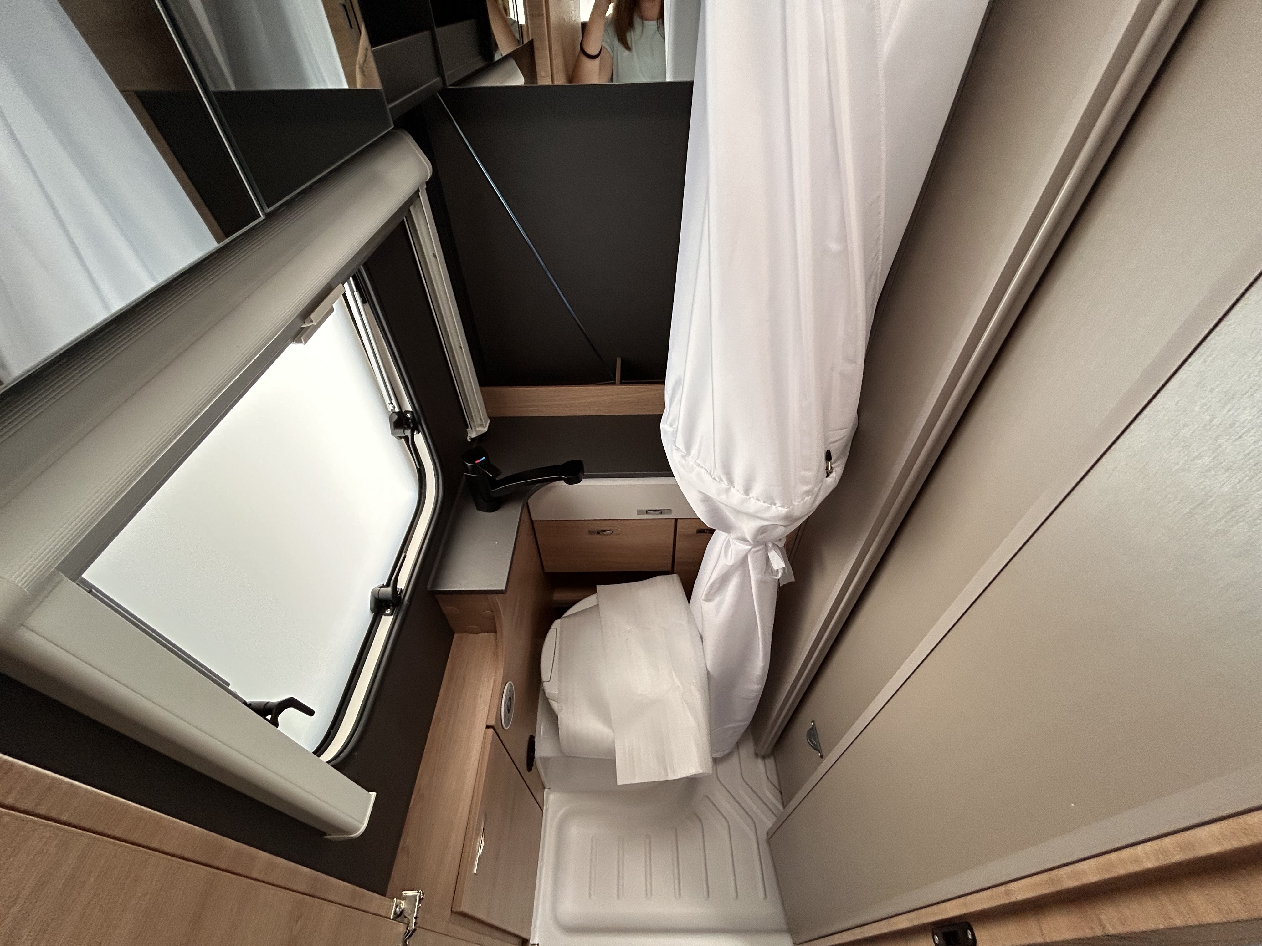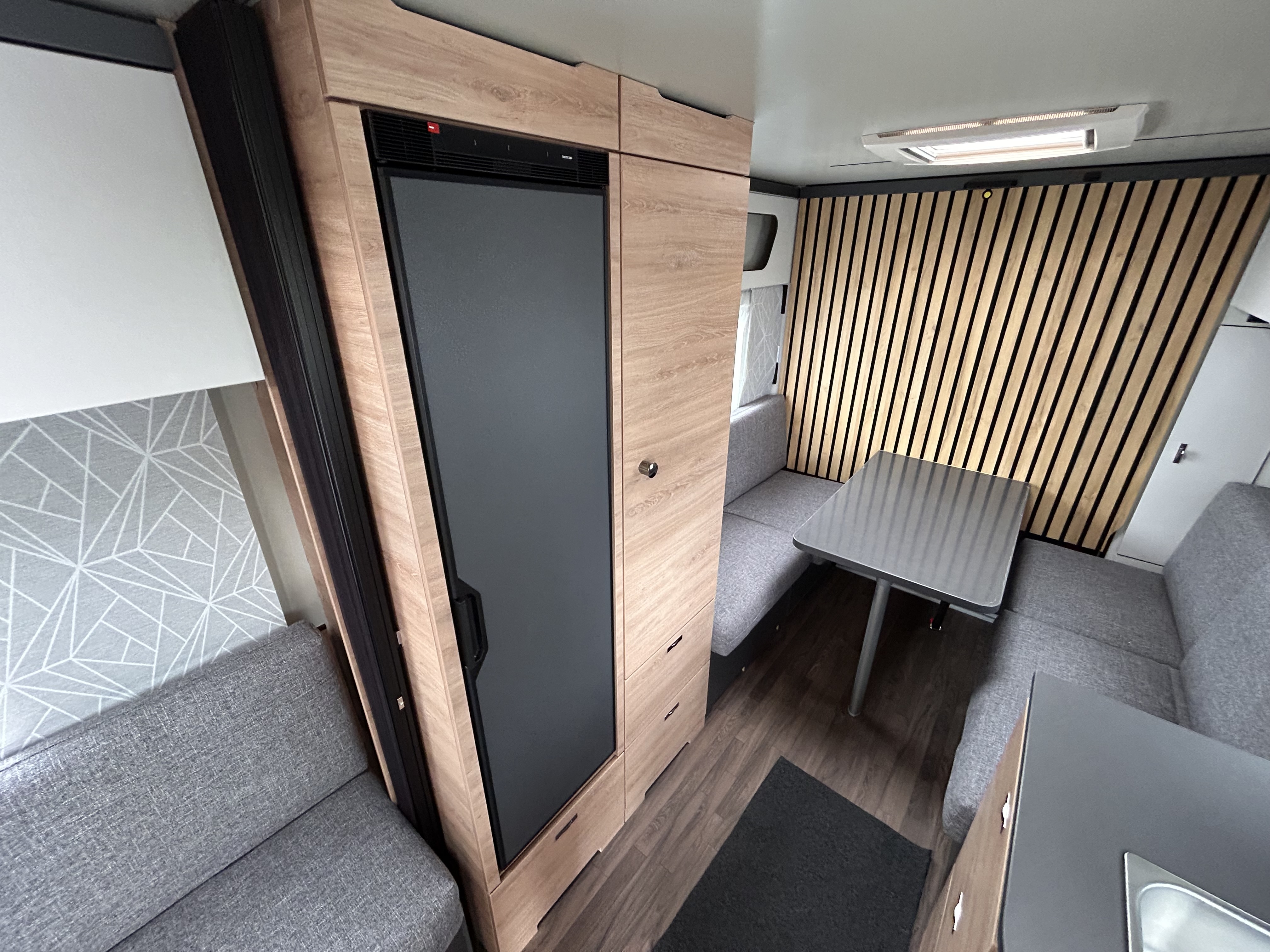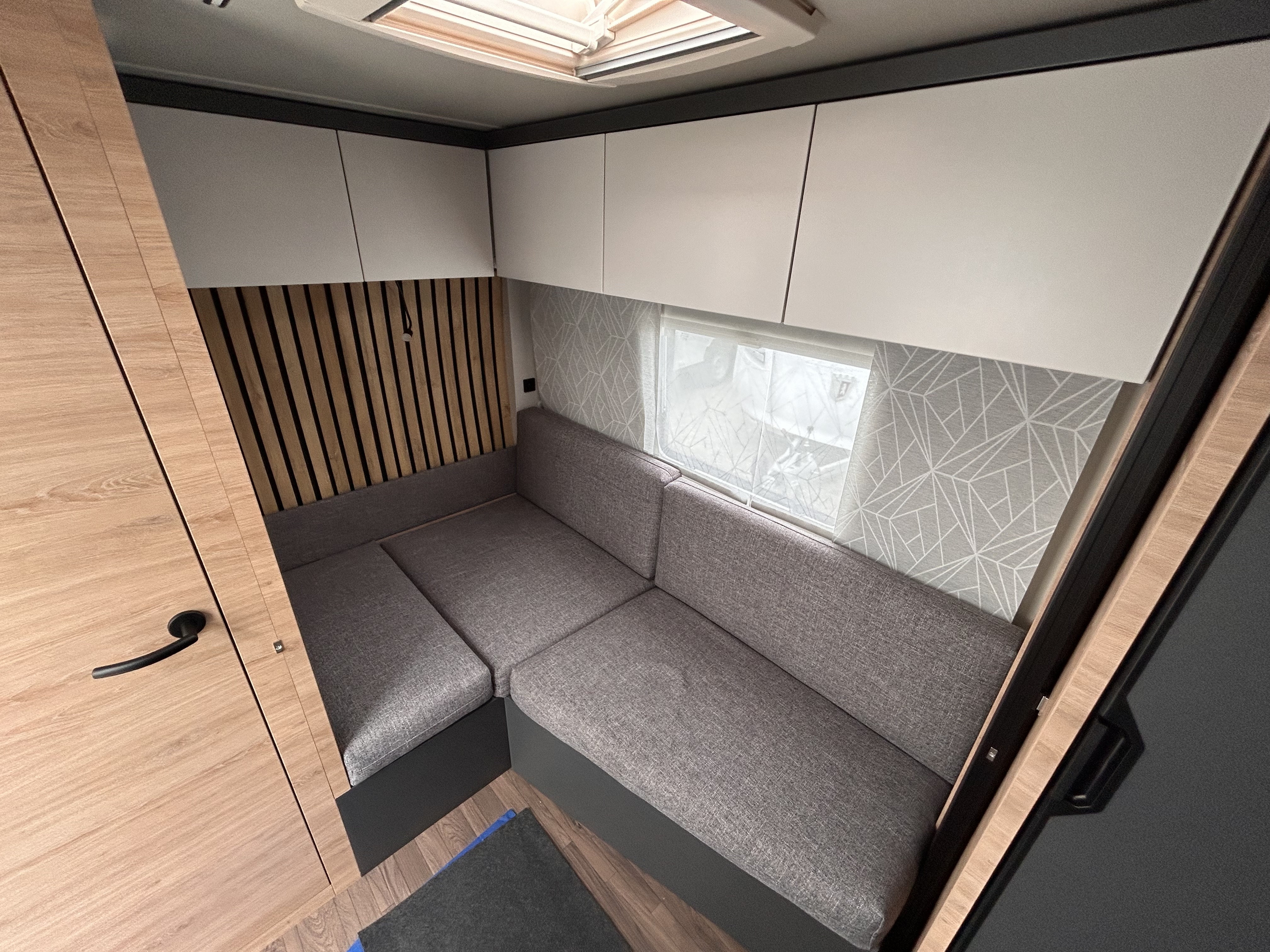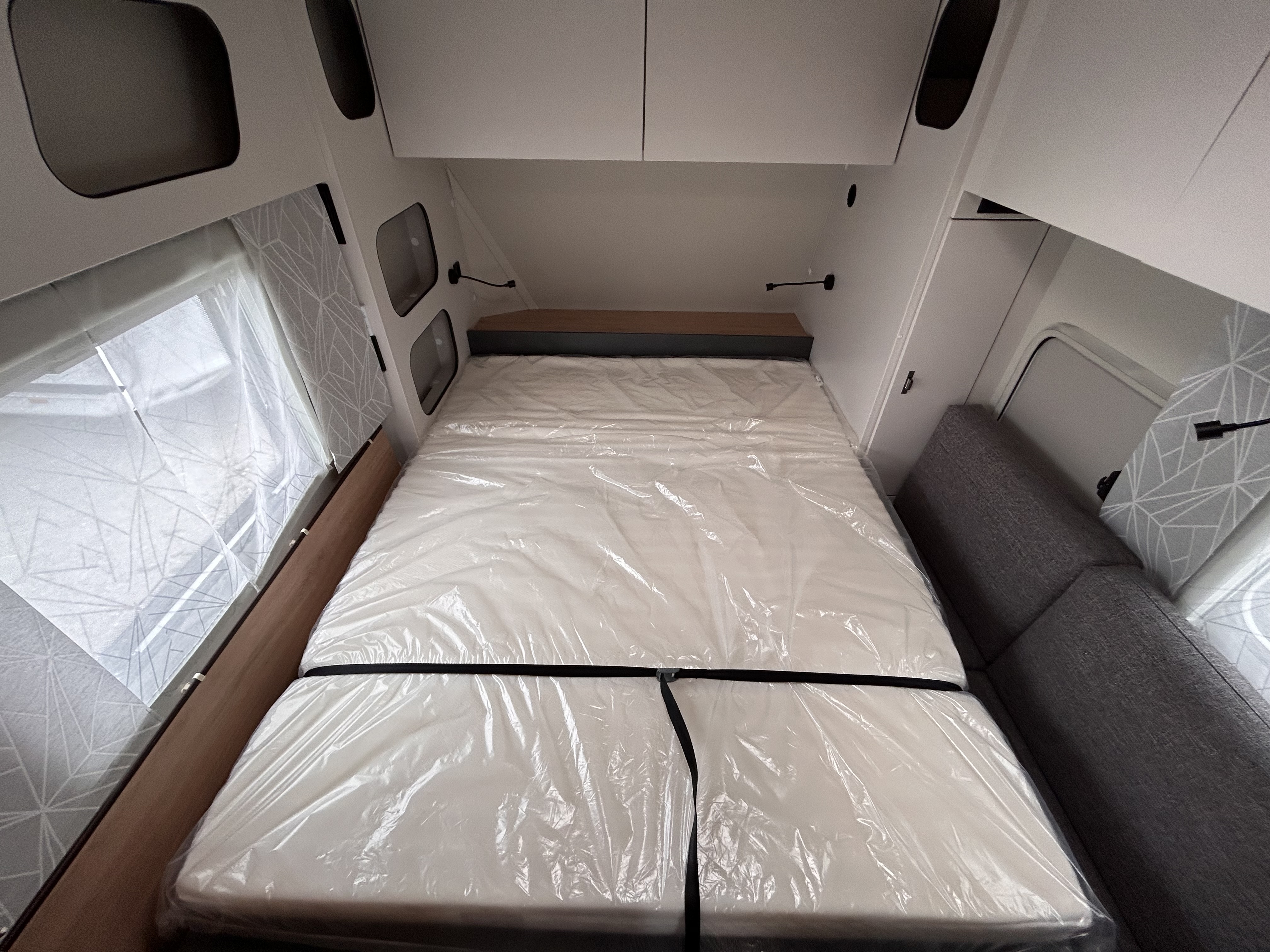 PACCHETTO TRASPORTO : Sportello di servizio 70 x 30,5 cm, posteriore dx – Sportello di servizio 70 x 30,5 cm, posteriore sx – Portellone garage 62,5 x 110 cm, dx – Occhielli di ancoraggio e binari di ancoraggio nella zona giorno – Dinette variabile per il trasporto di biciclette