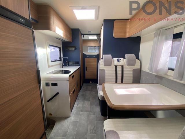 Disposto su una lunghezza di 6,97m, il veicolo è omologato 5 posti e dispone di 4 posti letto grazie alla mansarda nella parte anteriore e al letto trasversale in coda.