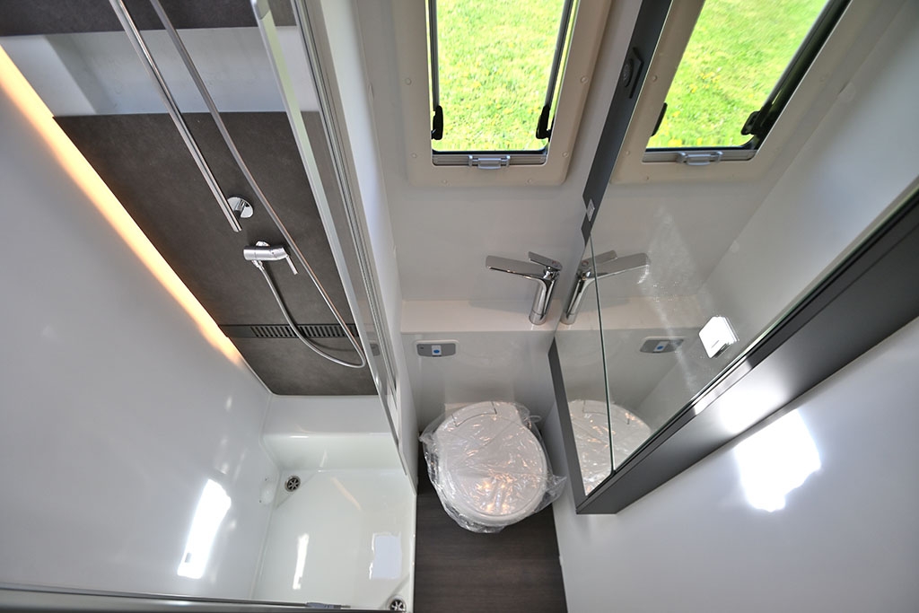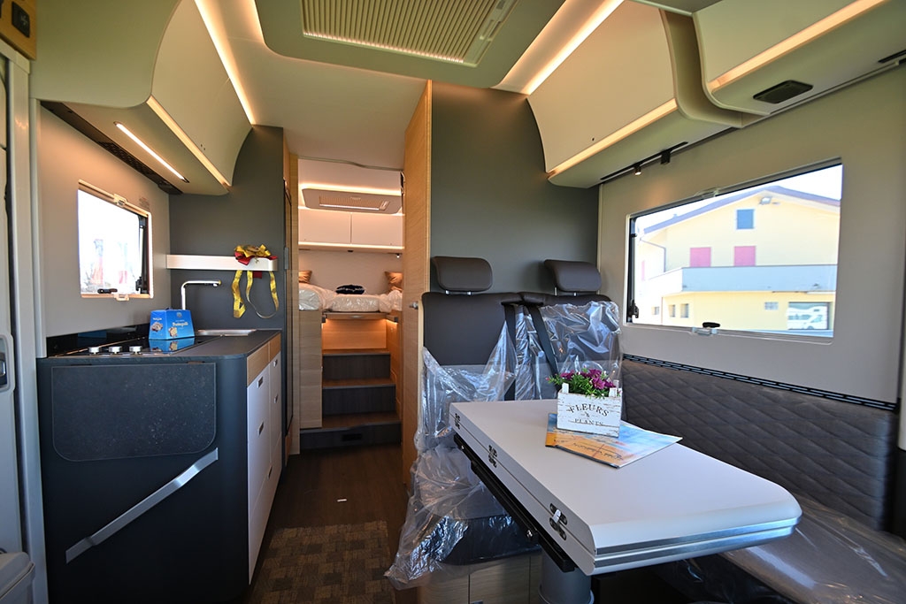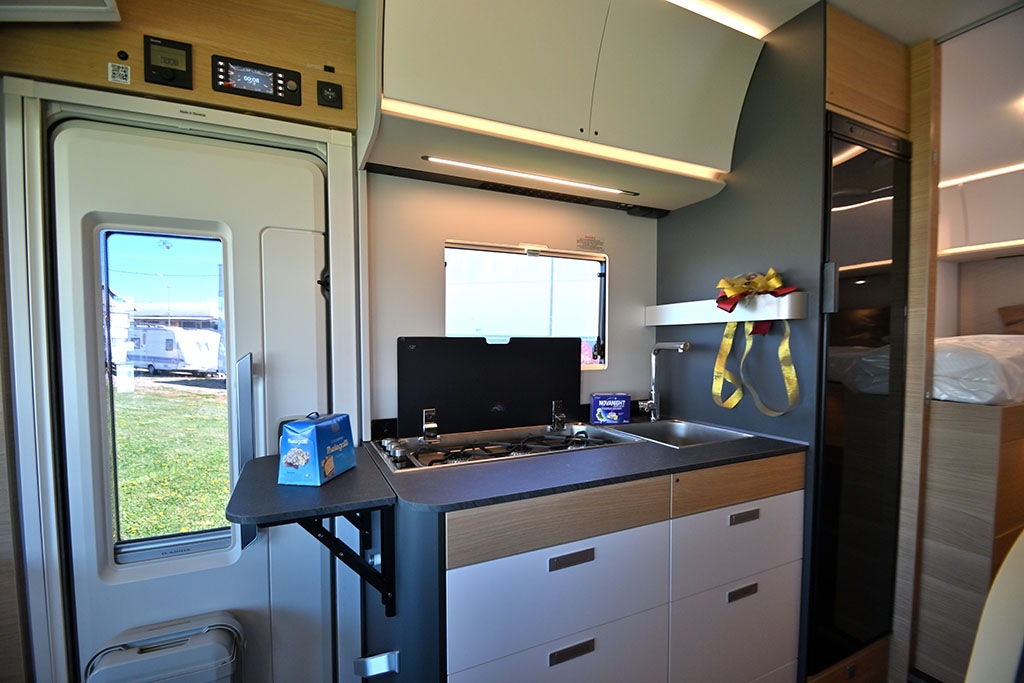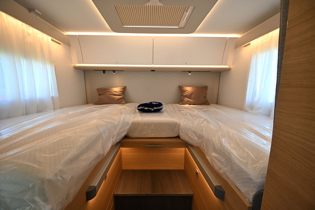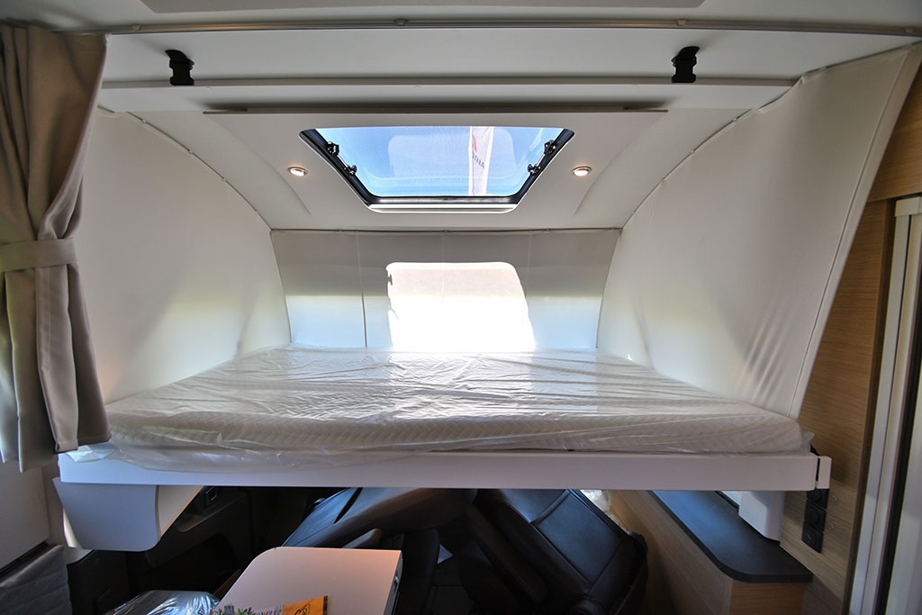 ESC, Traction+, Hill Holder, Hill Descent Control, Climatizzatore manuale in cabina, Cruise Control, Airbag passeggero, Cerchi in lega da 16, Specchietti retrovisori elettrici e riscaldabili, Volante e pomello del cambio rivestiti in pelle, Fendinebbia, Luci diurne a LED, Fanaleria anteriore a LED, Sedili cabina rivestiti in coordinato con tappezzeria, Oscuranti plissettati in cabina, Porta cellula XL con finestra, zanzariera e chiusura centralizzata, Sensori di parcheggio posteriori, Sky-Roof sopra letto basculante, Letto basculante anteriore elettrico, Cappa aspirante in cucina, Valvola elettrica scarico serbatoio acque grigie, Serbatoio di recupero coibentato e riscaldato, Regolatore di pressione gas Truma MonoControl CS