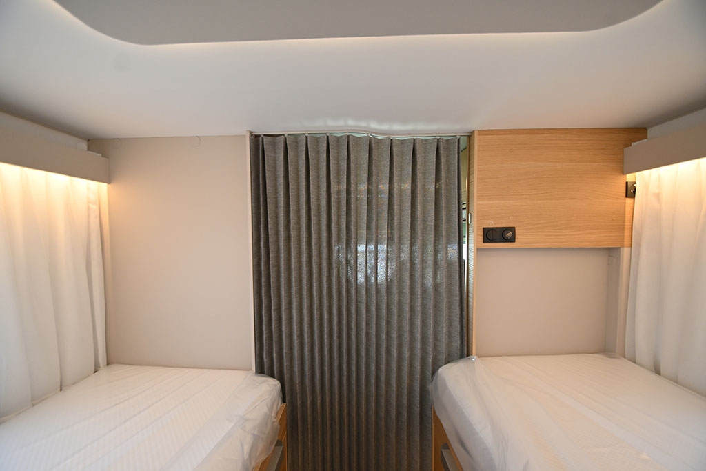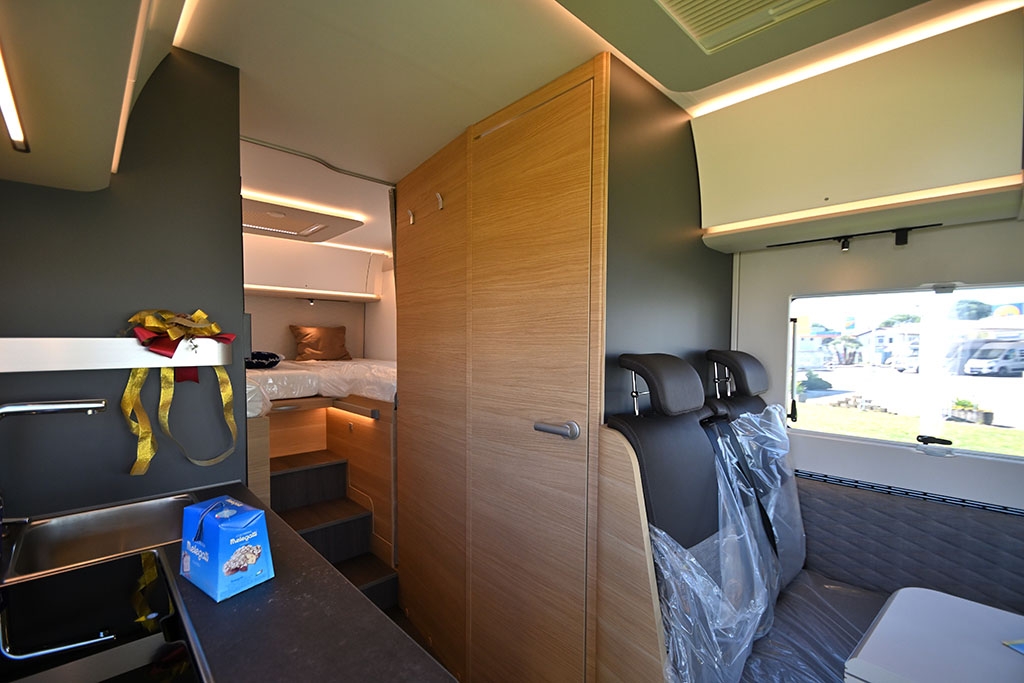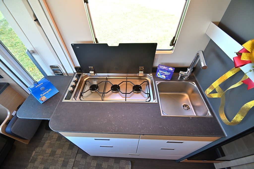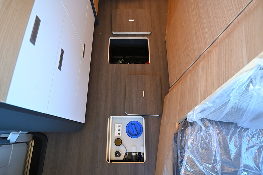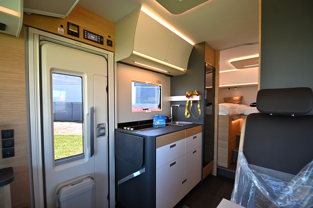 ESC, Traction+, Hill Holder, Hill Descent Control, Climatizzatore manuale in cabina, Cruise Control, Airbag passeggero, Cerchi in lega da 16, Specchietti retrovisori elettrici e riscaldabili, Volante e pomello del cambio rivestiti in pelle, Fendinebbia, Luci diurne a LED, Fanaleria anteriore a LED, Sedili cabina rivestiti in coordinato con tappezzeria, Oscuranti plissettati in cabina, Porta cellula XL con finestra, zanzariera e chiusura centralizzata, Sensori di parcheggio posteriori, Sky-Roof sopra letto basculante, Letto basculante anteriore elettrico, Cappa aspirante in cucina, Valvola elettrica scarico serbatoio acque grigie, Serbatoio di recupero coibentato e riscaldato, Regolatore di pressione gas Truma MonoControl CS