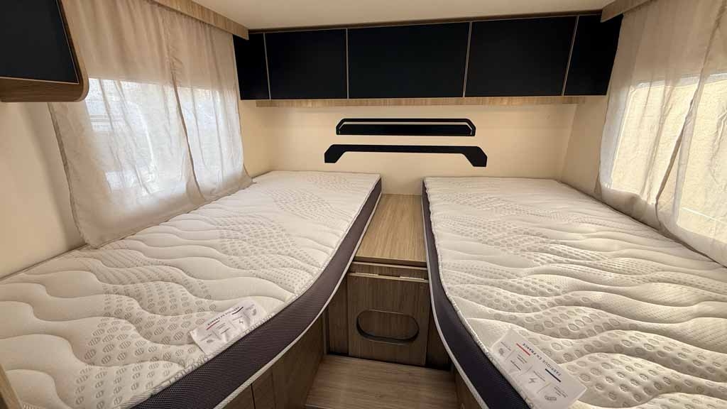 La zona notte è composta da letti gemelli in coda che offrono grande versatilità, con la possibilità di trasformarli rapidamente in un maxi letto matrimoniale.