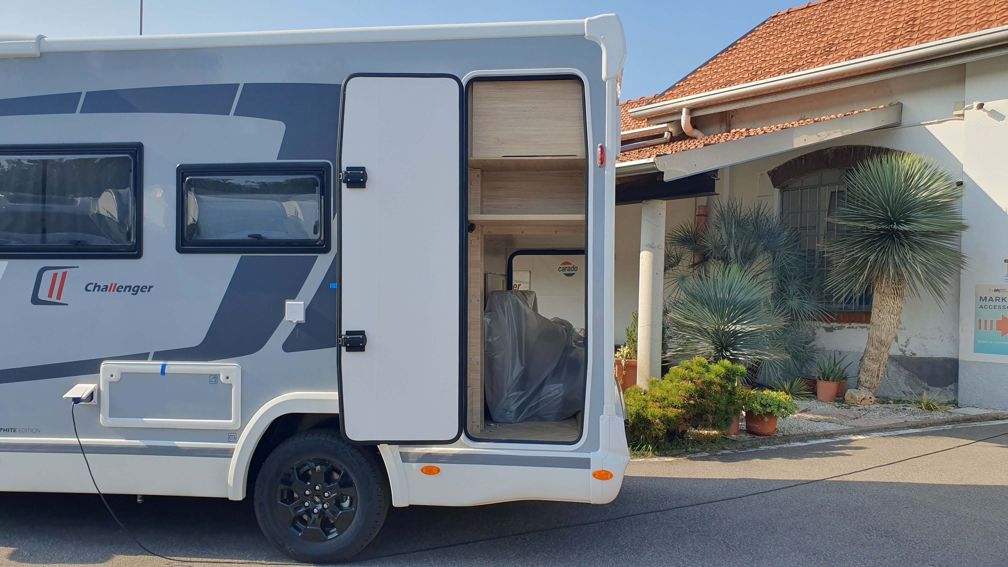 Pack Accessori P che include tendalino esterno, pannello solare da 140W, zanzariera per la porta e oscuranti cabina