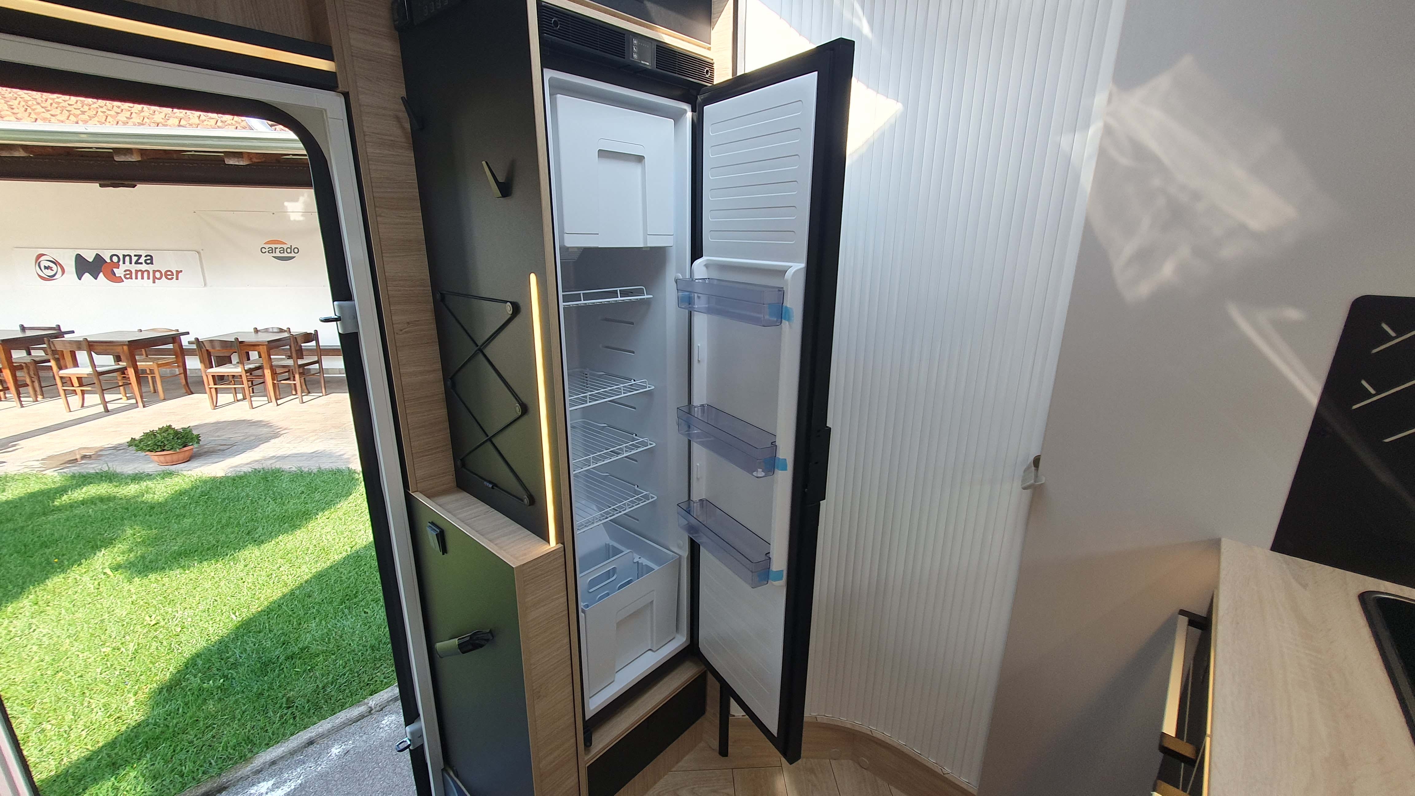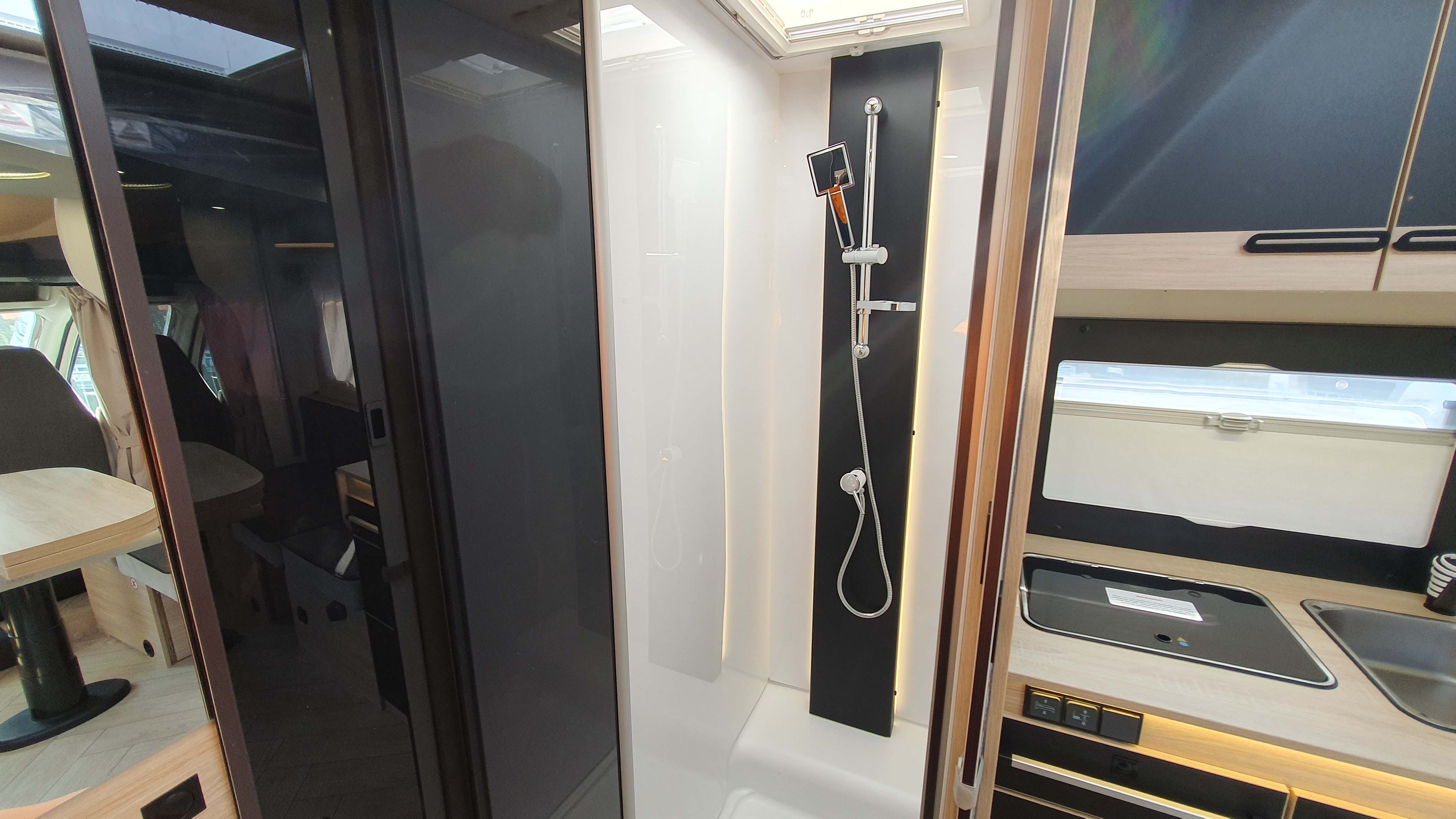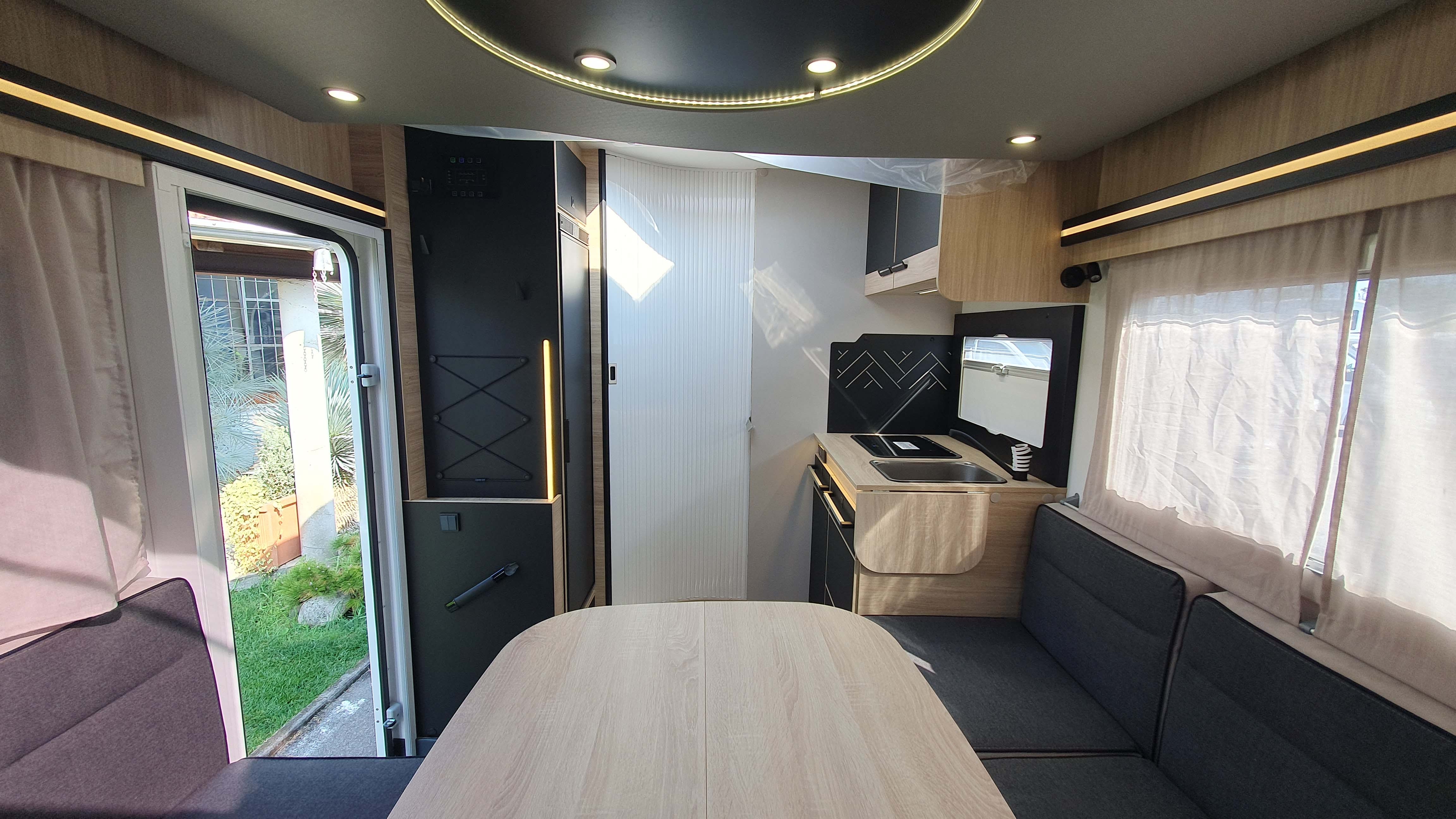 La cucina, moderna e funzionale, è dotata di due fuochi a gas, un lavandino e un frigorifero trivalente da 145 litri, ideale per conservare le provviste durante i soggiorni più lunghi. Nella parte posteriore si trova il bagno, ampio e ben organizzato, con una comoda doccia separata e un armadio spazioso, perfetto per riporre tutto ciò che serve.