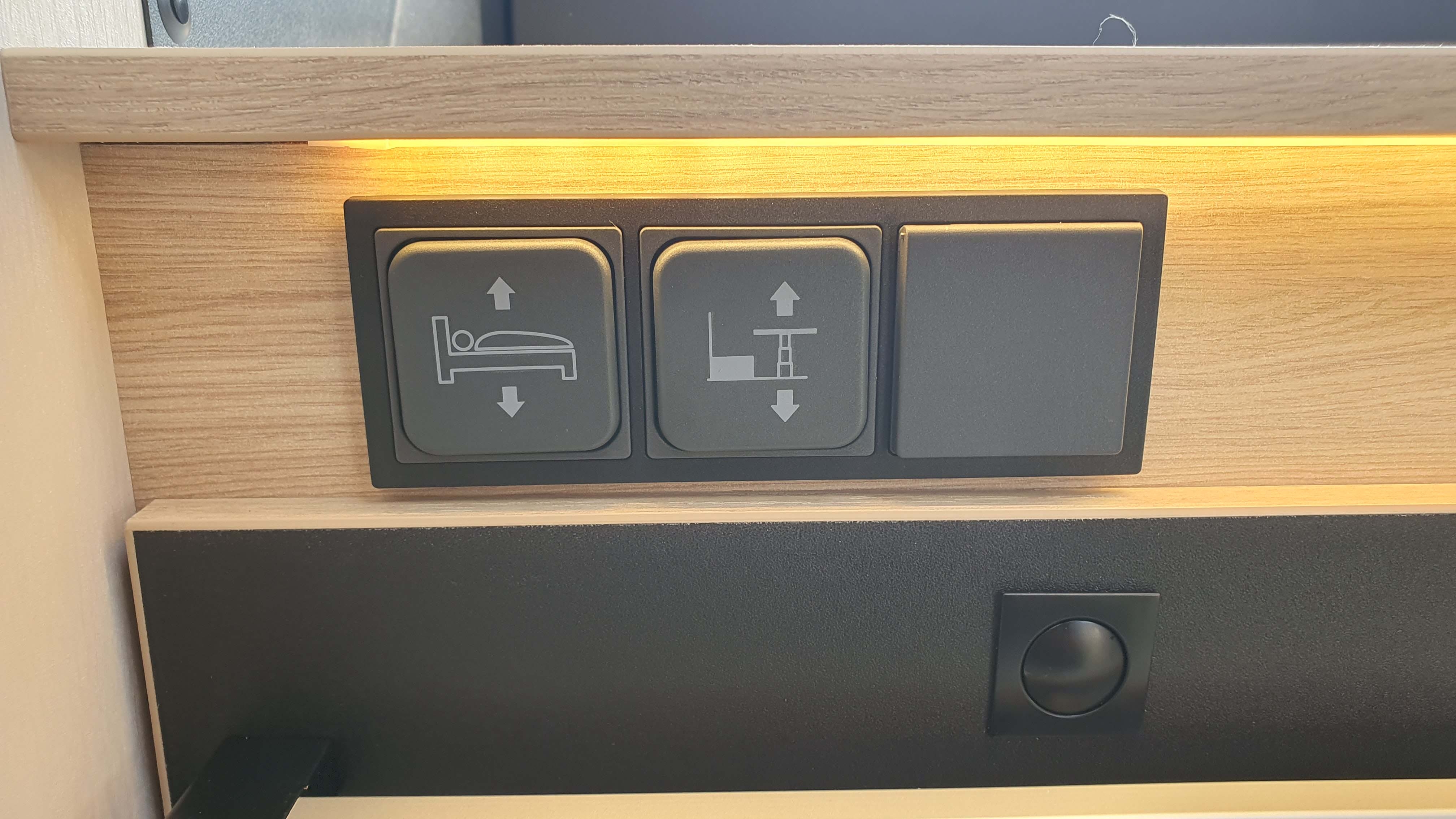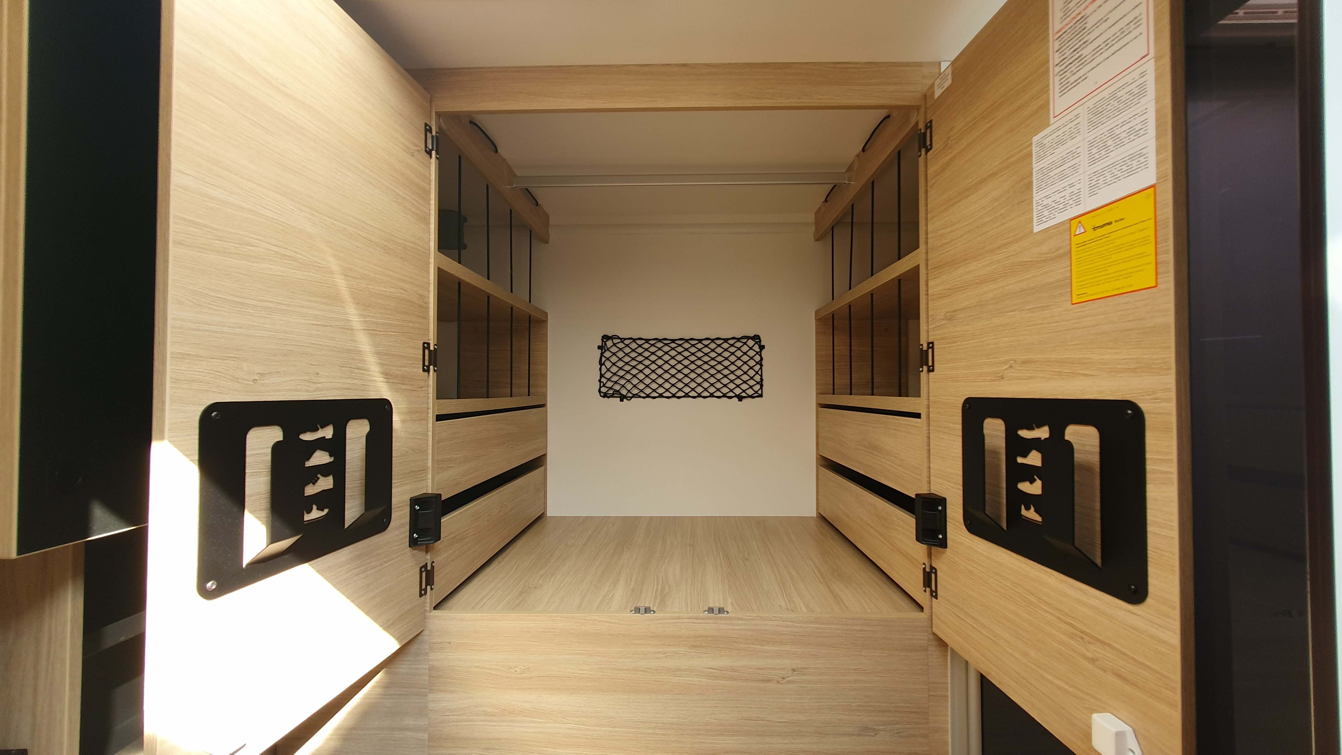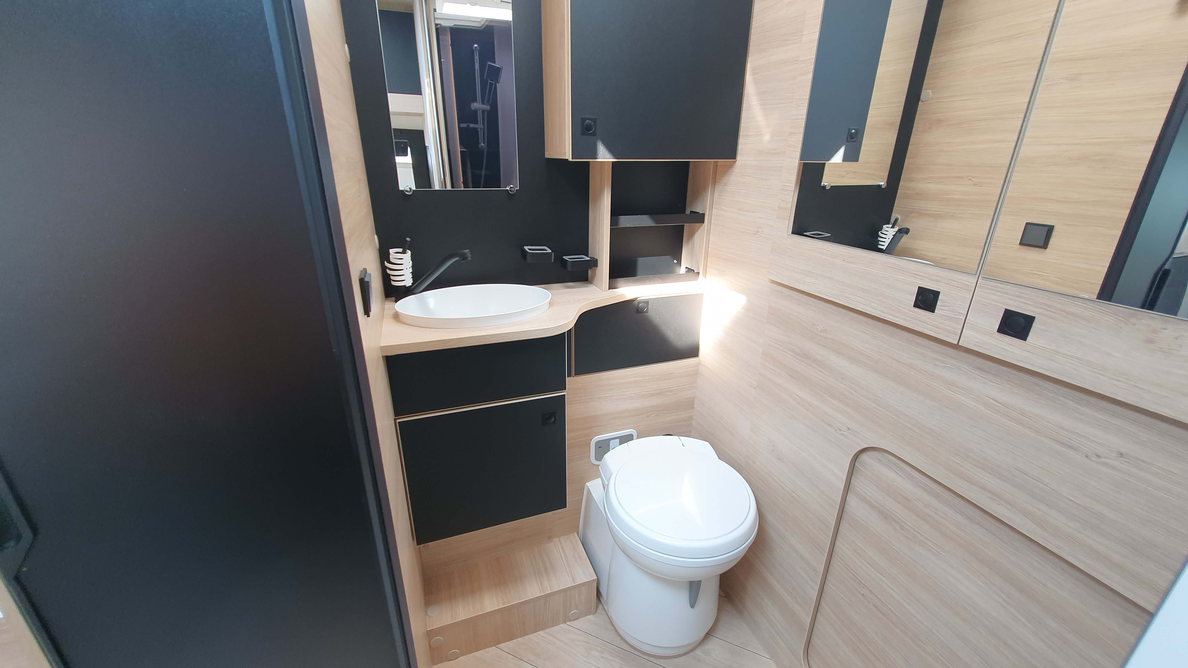 La cucina, moderna e funzionale, è dotata di due fuochi a gas, un lavandino e un frigorifero trivalente da 145 litri, ideale per conservare le provviste durante i soggiorni più lunghi. Nella parte posteriore si trova il bagno, ampio e ben organizzato, con una comoda doccia separata e un armadio spazioso, perfetto per riporre tutto ciò che serve.