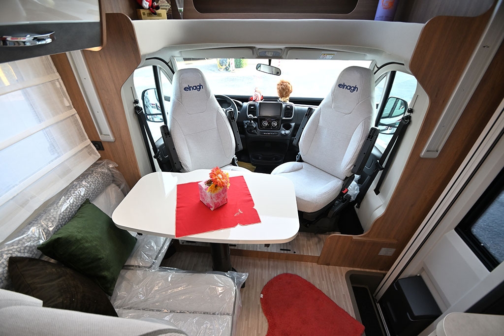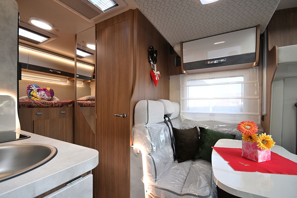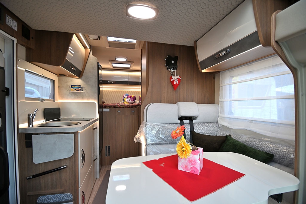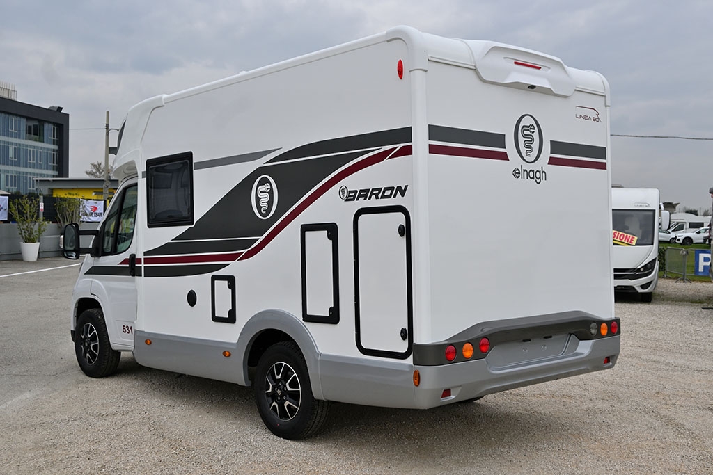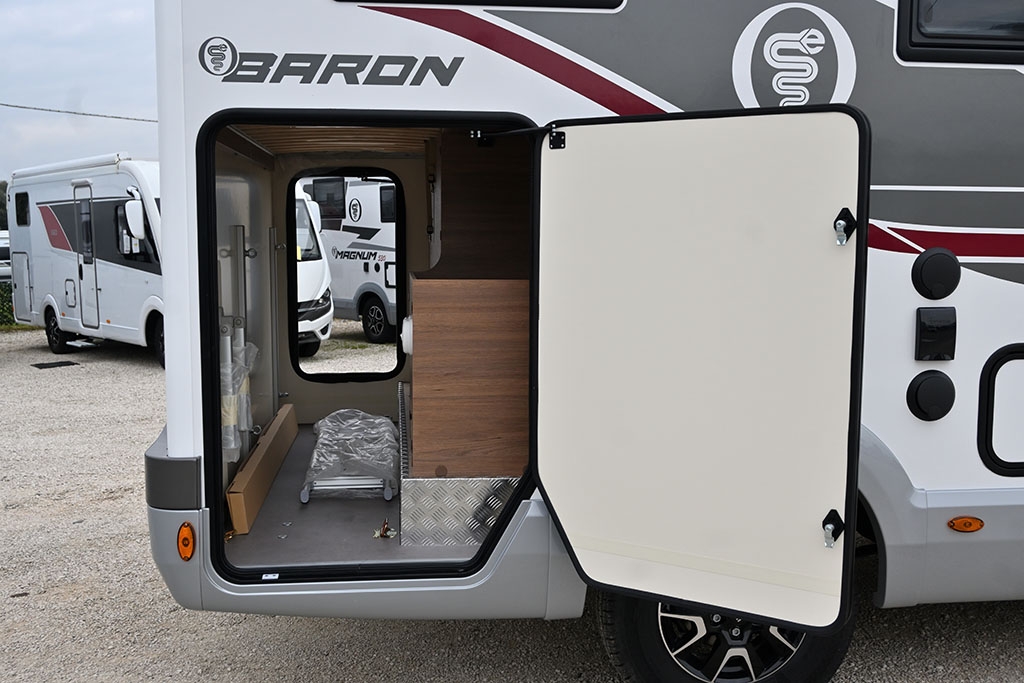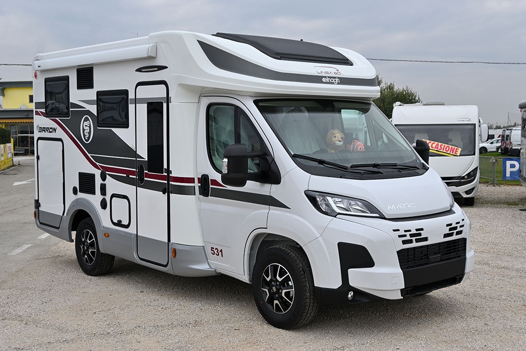 Pacchetto Baron (Pannello solare, stazione multimediale da 9 con Car Play, telecamera retromarcia, fendinebbia, freno di stazionamento elettrico, cerchi in lega da 16, sensori di pressione degli pneumatici, oscuranti plissettati in cabina, paraurti anteriore verniciato in tinta, volante e pomello del cambio rivestiti in pelle, cruscotto in design Techno), ESP, Traction+, Hill Holder, Hill Descent Control, Climatizzatore manuale in cabina, Cruise Control, Airbag passeggero, Specchietti retrovisori elettrici e riscaldabili, Sistema Start & Stop, Porta cellula con finestra, zanzariera e chiusura centralizzata, Winter Pack, Comando digitale Truma CP Plus, Sky-Roof su cupolino anteriore, Supporto TV, Isofix in dinette, Fodere coprisedili cabina in coordinato con tappezzeria, Sistema di riscaldamento Truma Combi 4D a gasolio