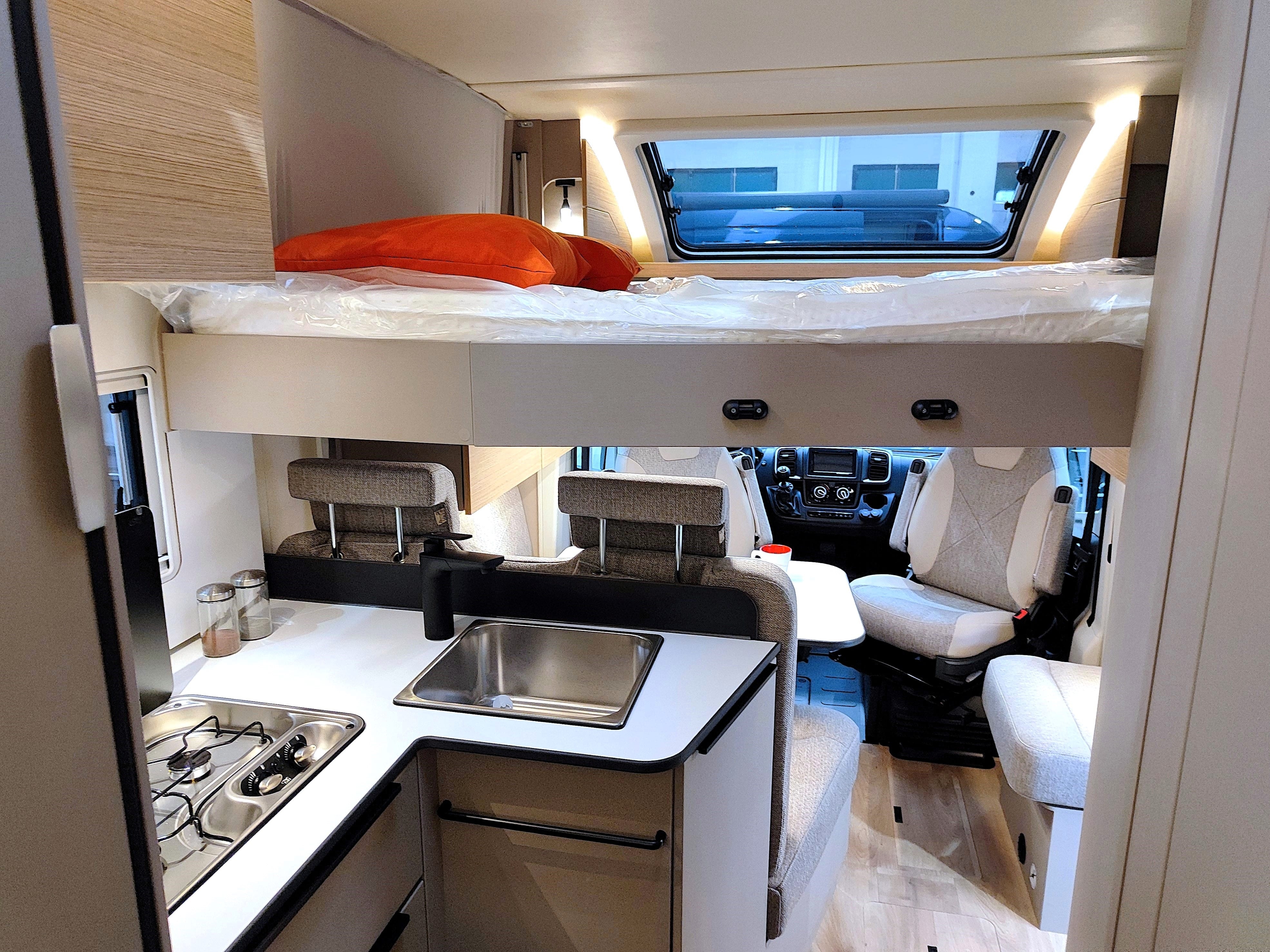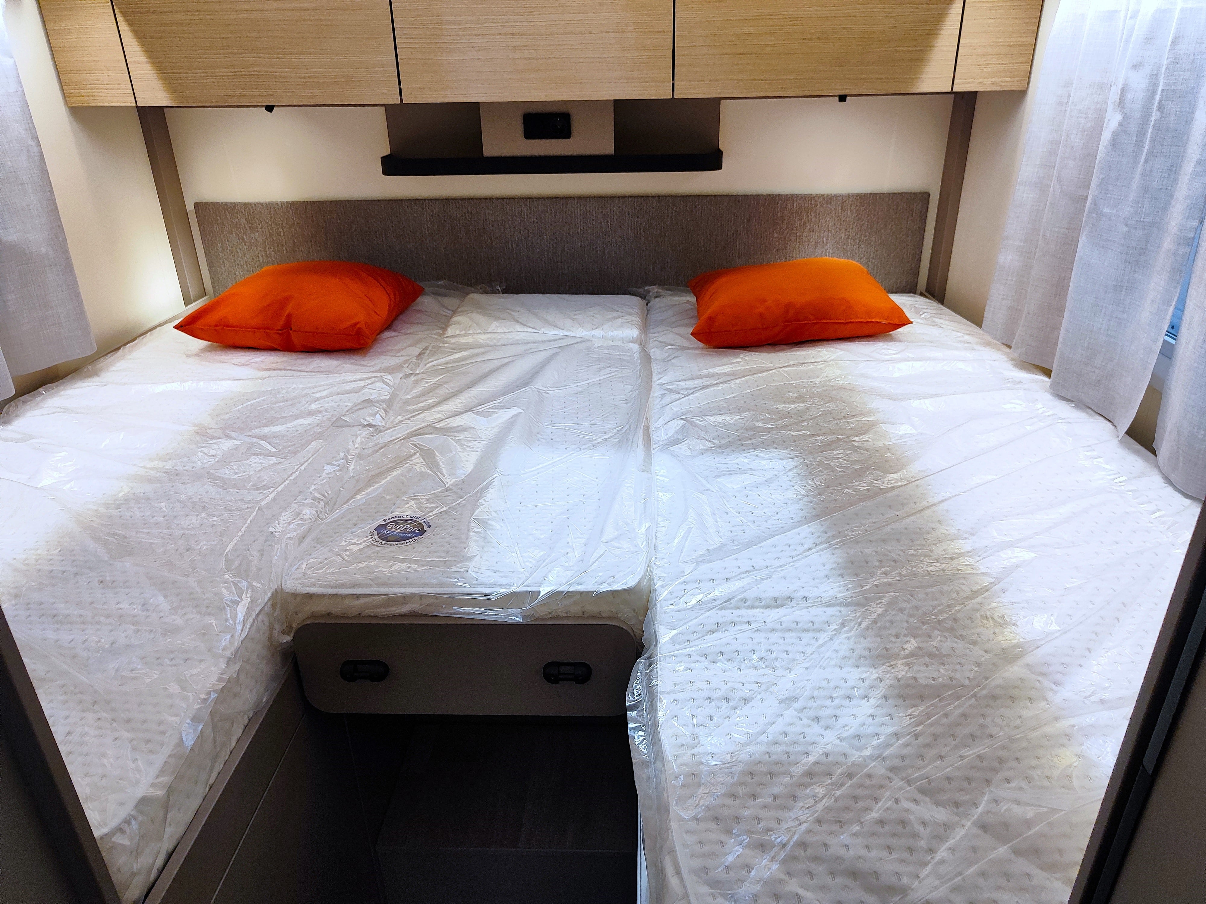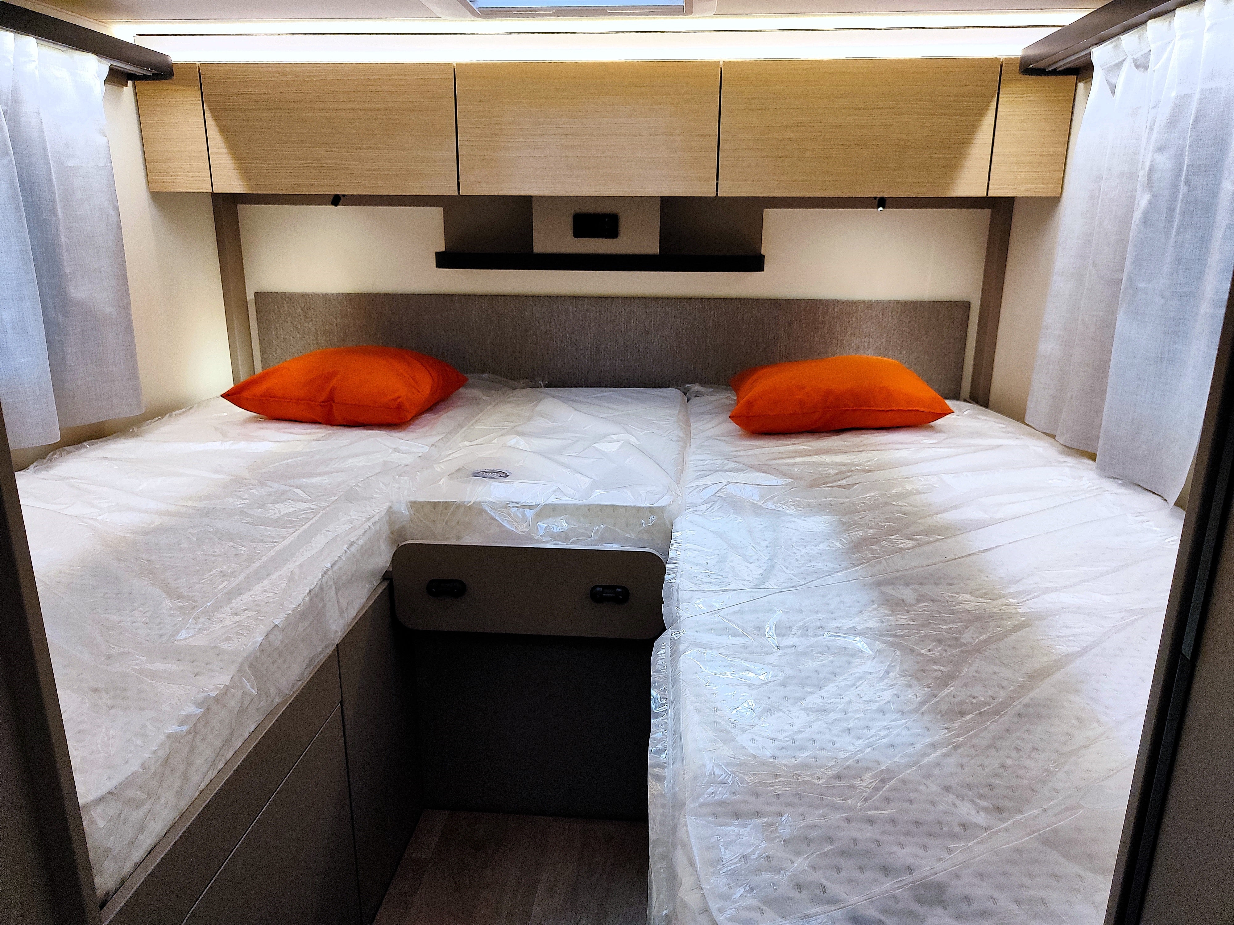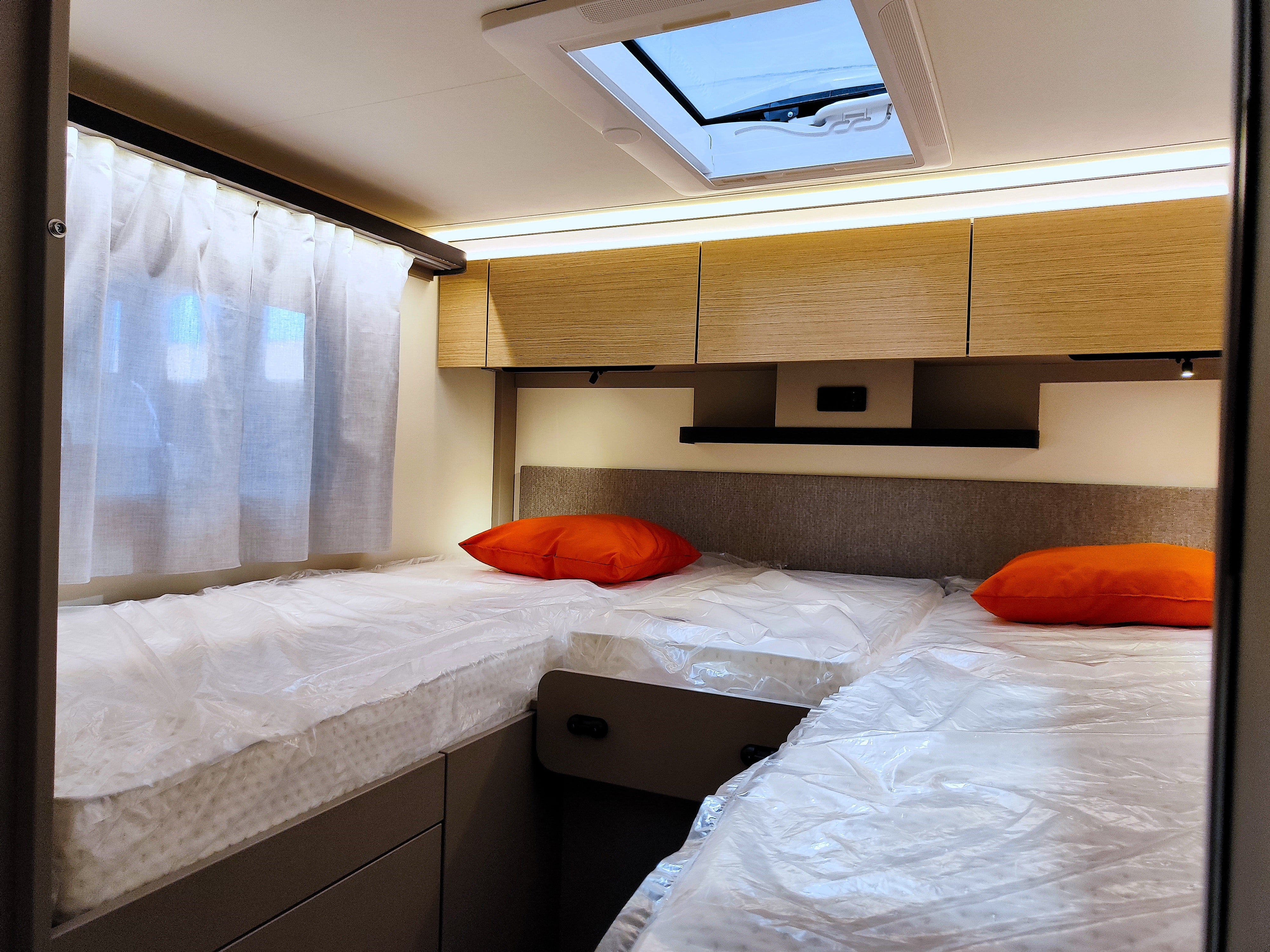 Piantina con letti gemelli e letto basculante, doppio pavimento e garage. Adatto sia alle coppie che alle vacanze di famiglia. Da VR Camper a Druento.
