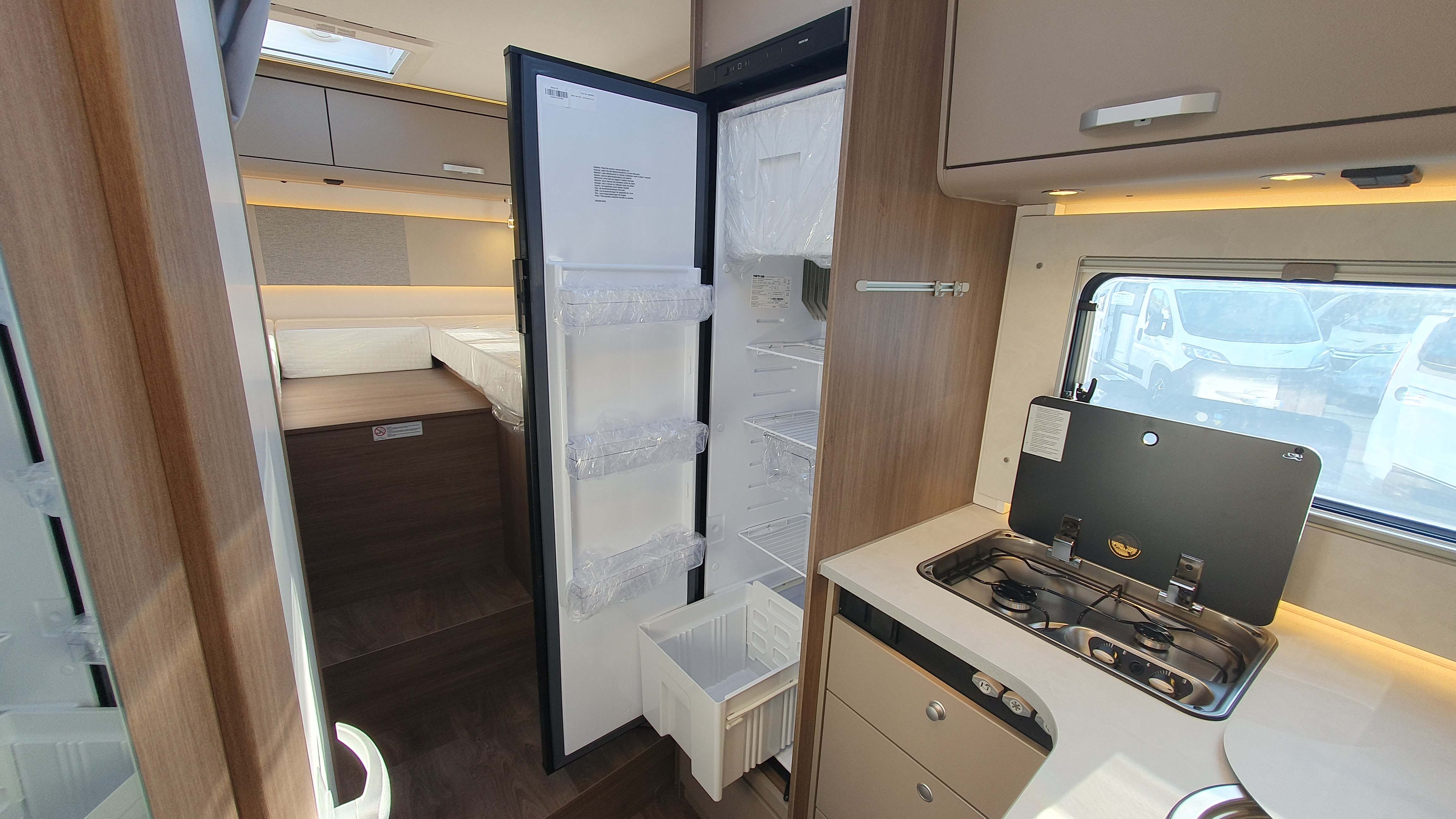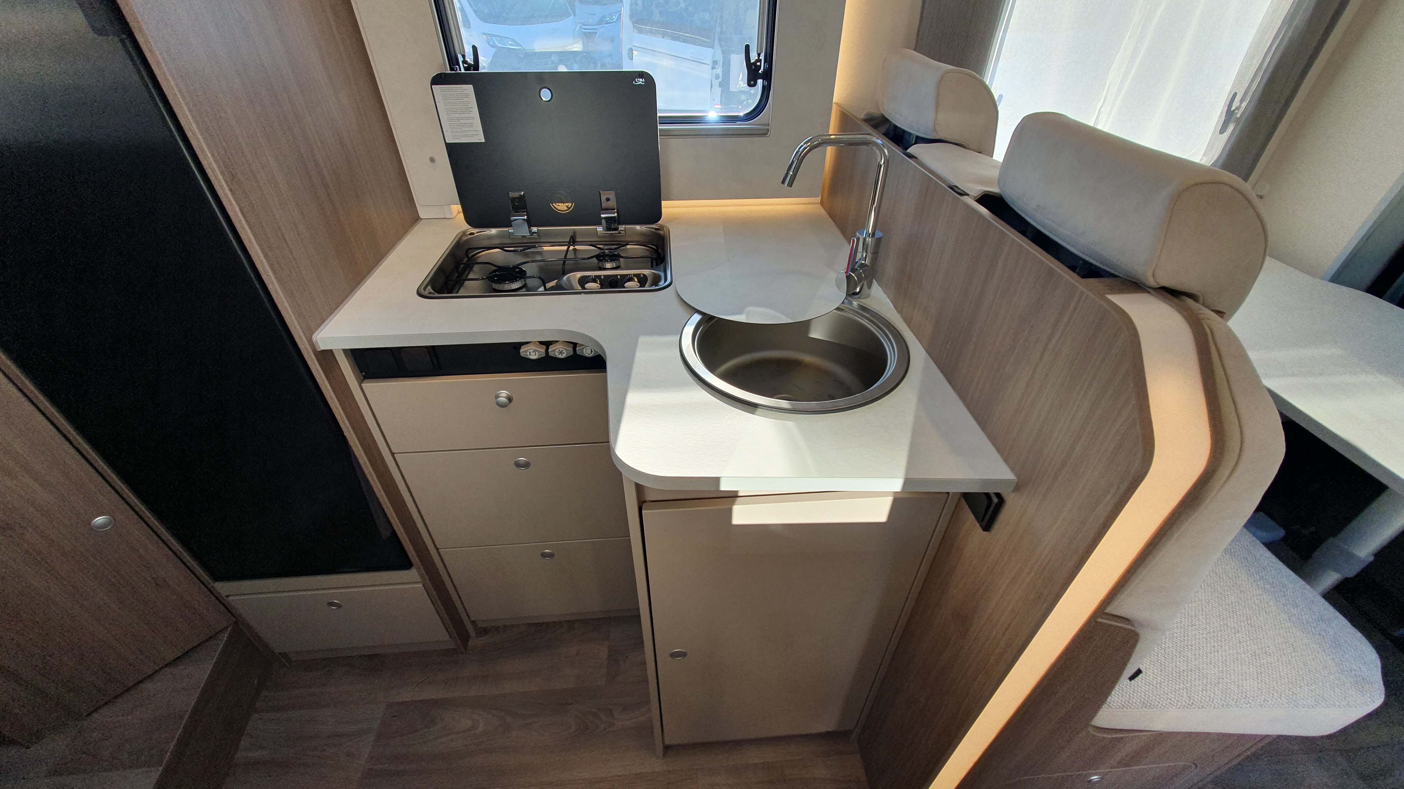 La cucina a gas è completa di due fuochi, lavandino e frigorifero trivalente da 167 litri con freezer da 29 litri, perfetta per preparare ogni pasto anche in viaggio.