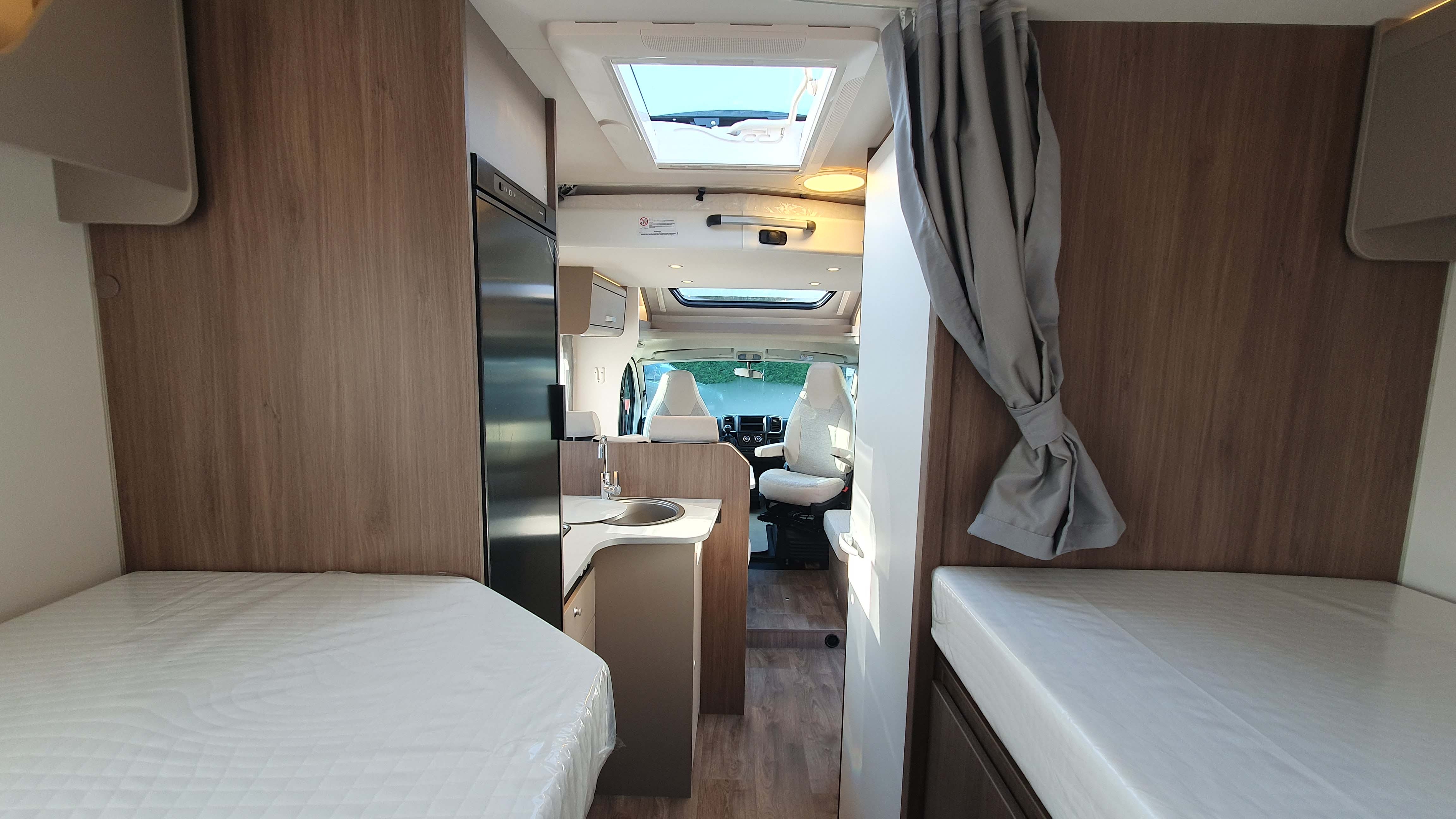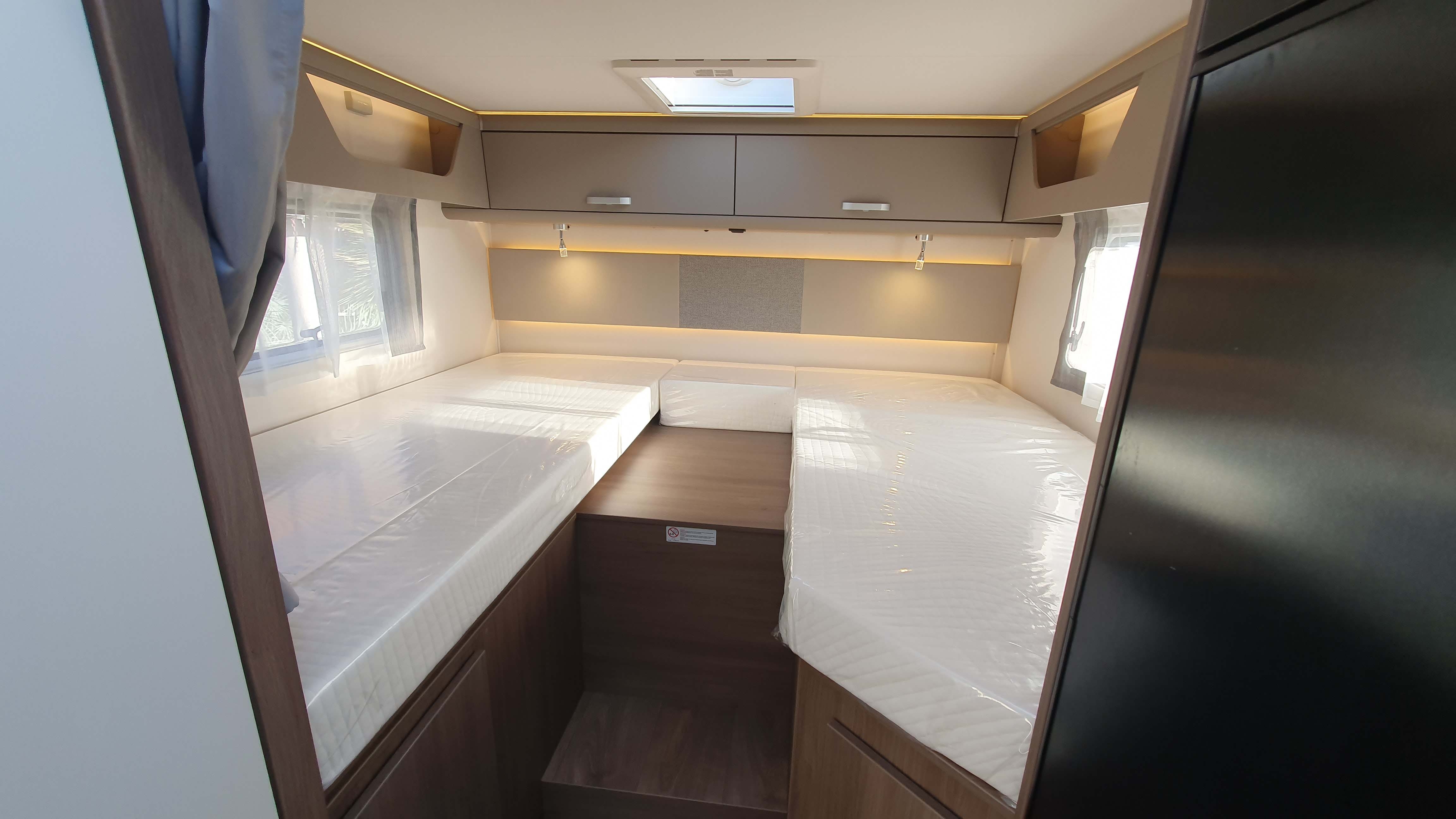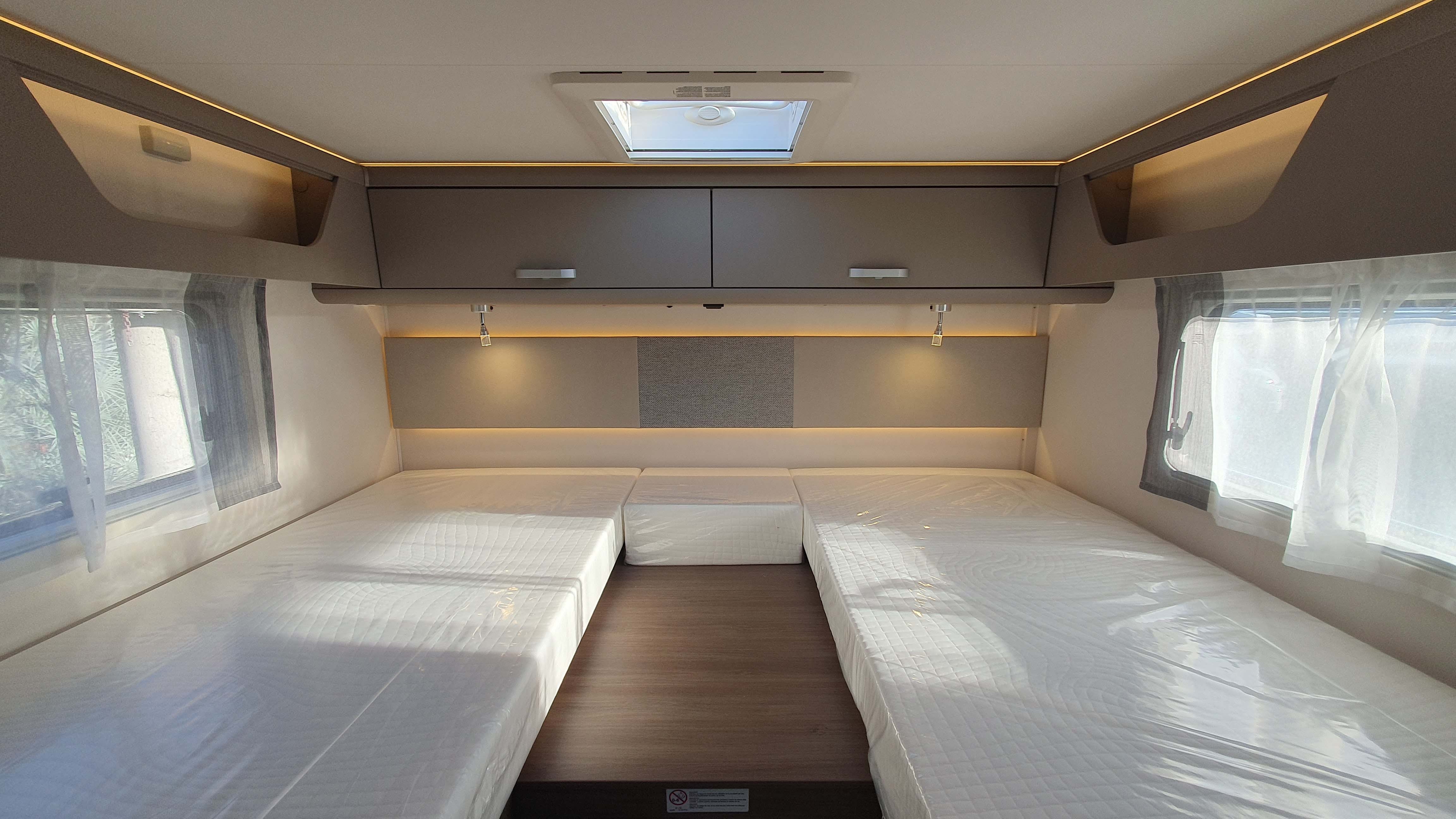 un letto matrimoniale basculante manuale si trova sopra la dinette, mentre nella parte posteriore ci sono due letti gemelli sopra al garage.