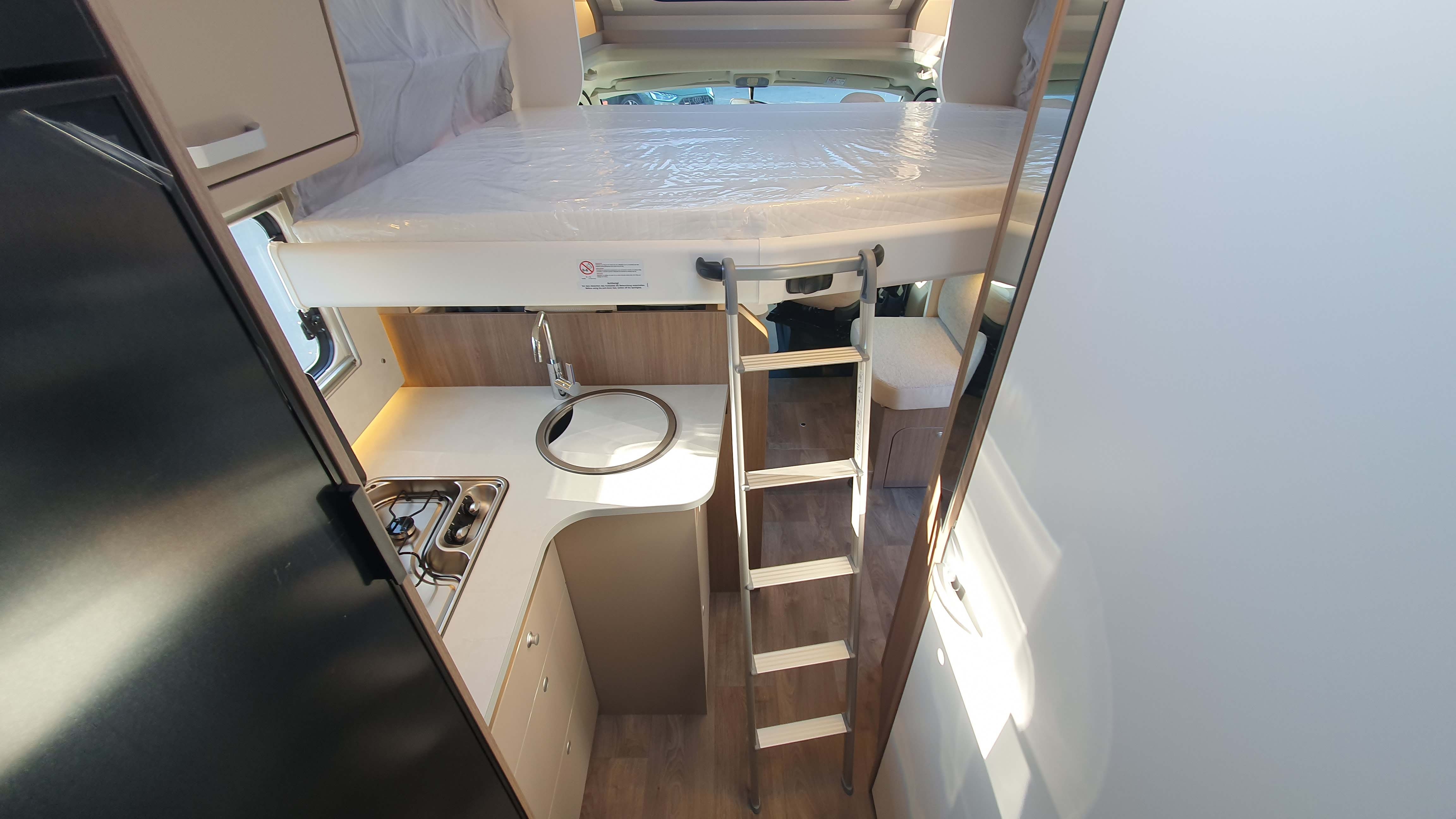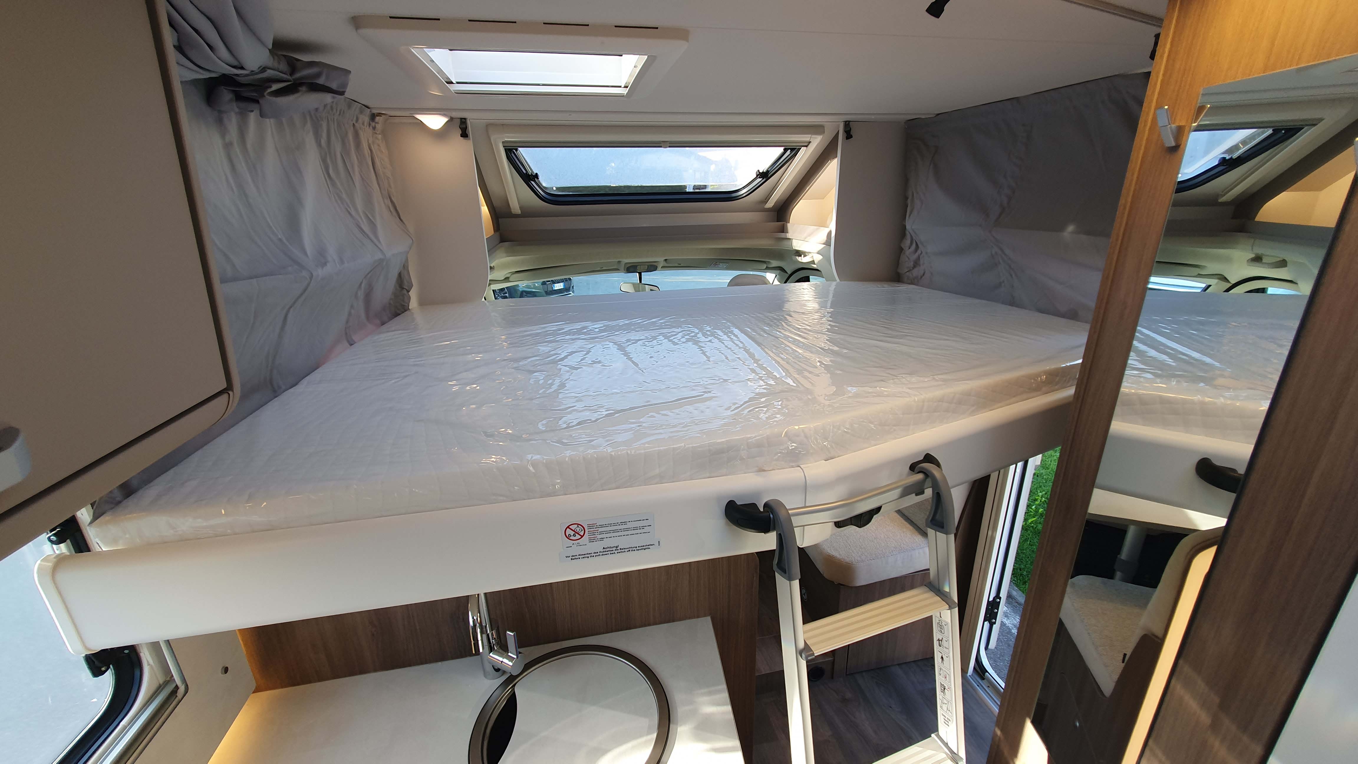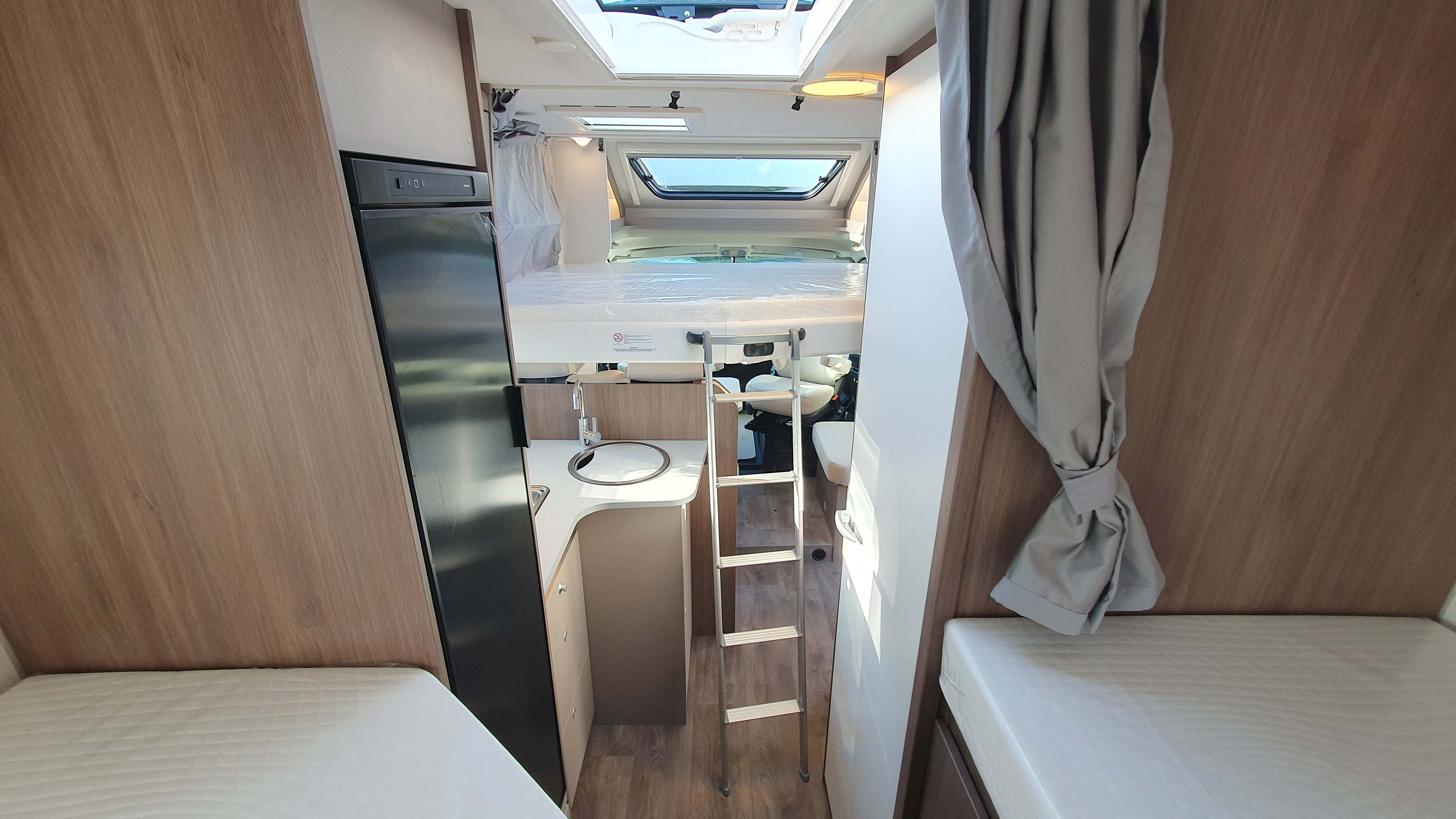 un letto matrimoniale basculante manuale si trova sopra la dinette, mentre nella parte posteriore ci sono due letti gemelli sopra al garage.