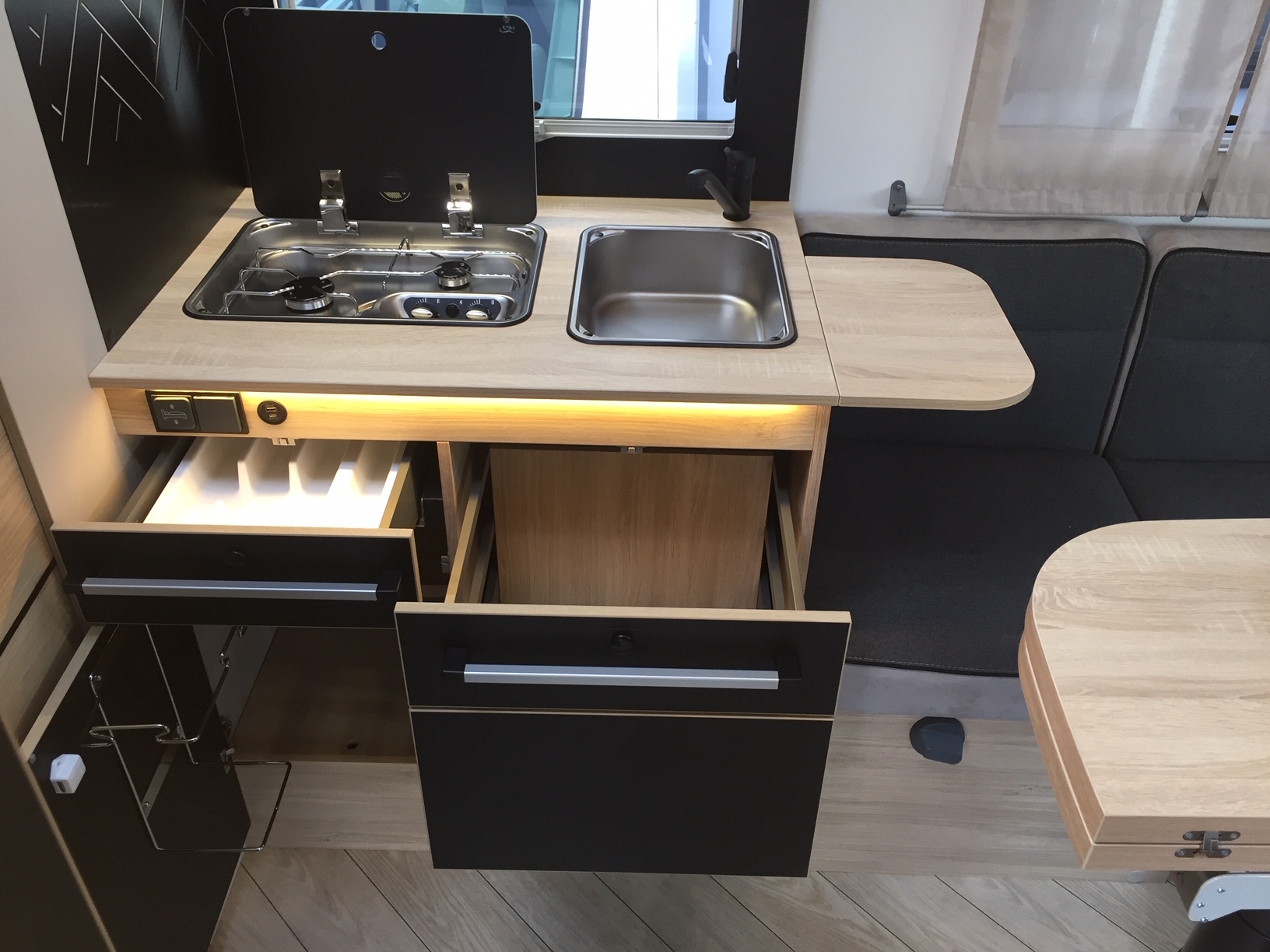 Riscaldamento Truma Combi a gasolio utilizzabile anche in marcia, sensori di parcheggio anteriori, chiusura centralizzata, presa esterna gas, presa esterna acqua.
