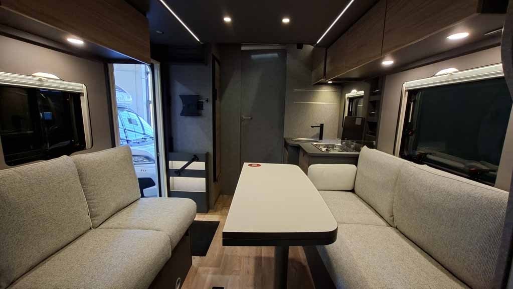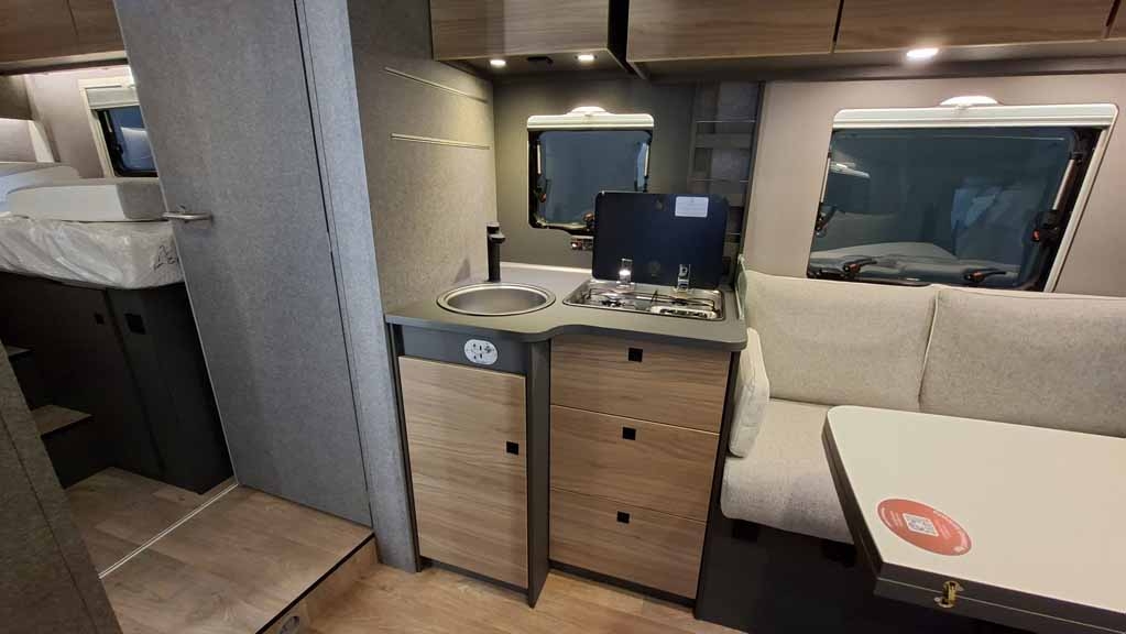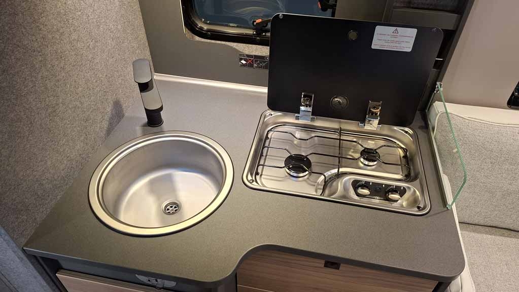 La cucina a L a due fuochi, completa di lavandino e frigorifero trivalente da 137 litri, ti permette di preparare e conservare i pasti durante i tuoi viaggi senza alcun problema.