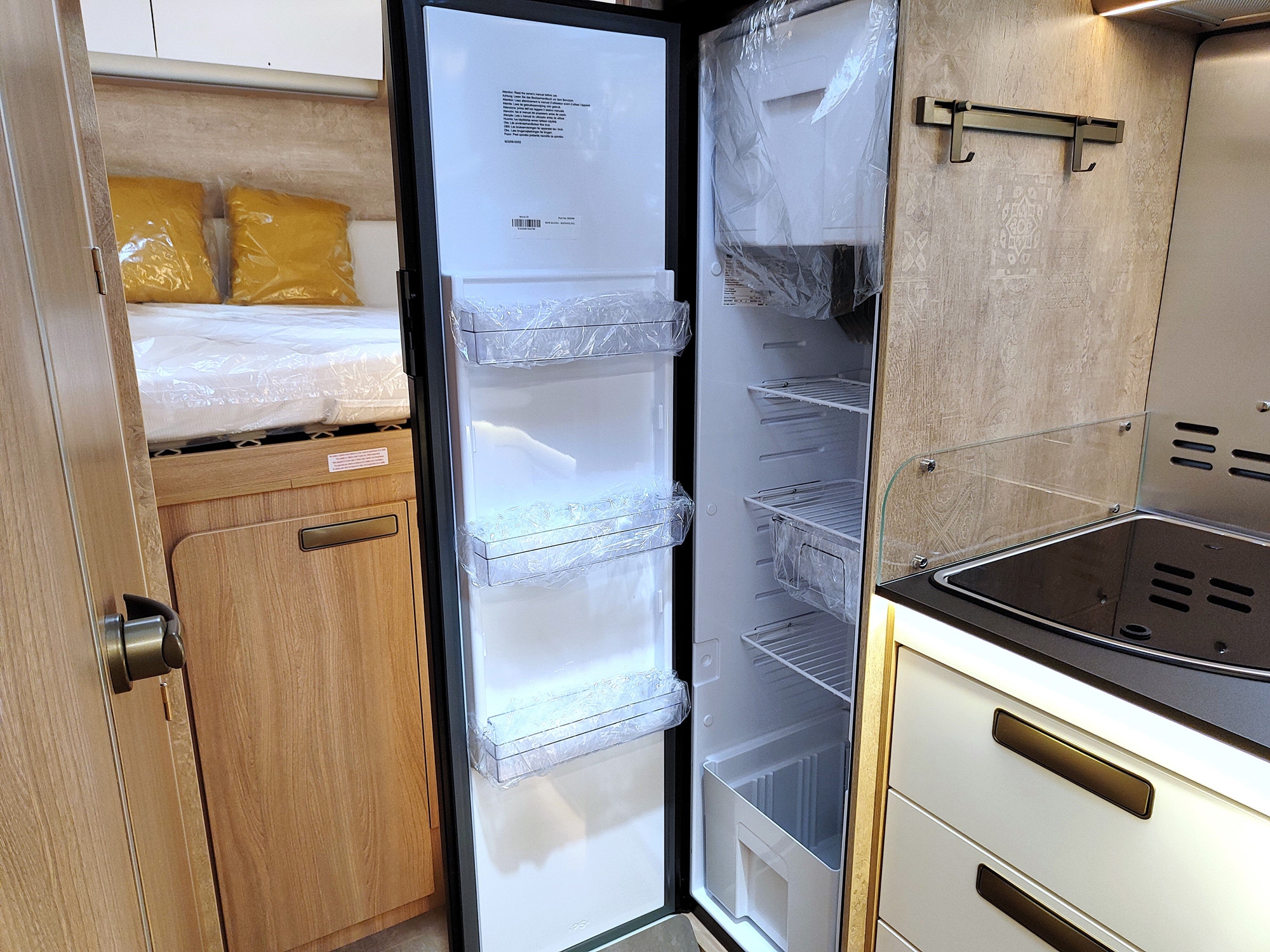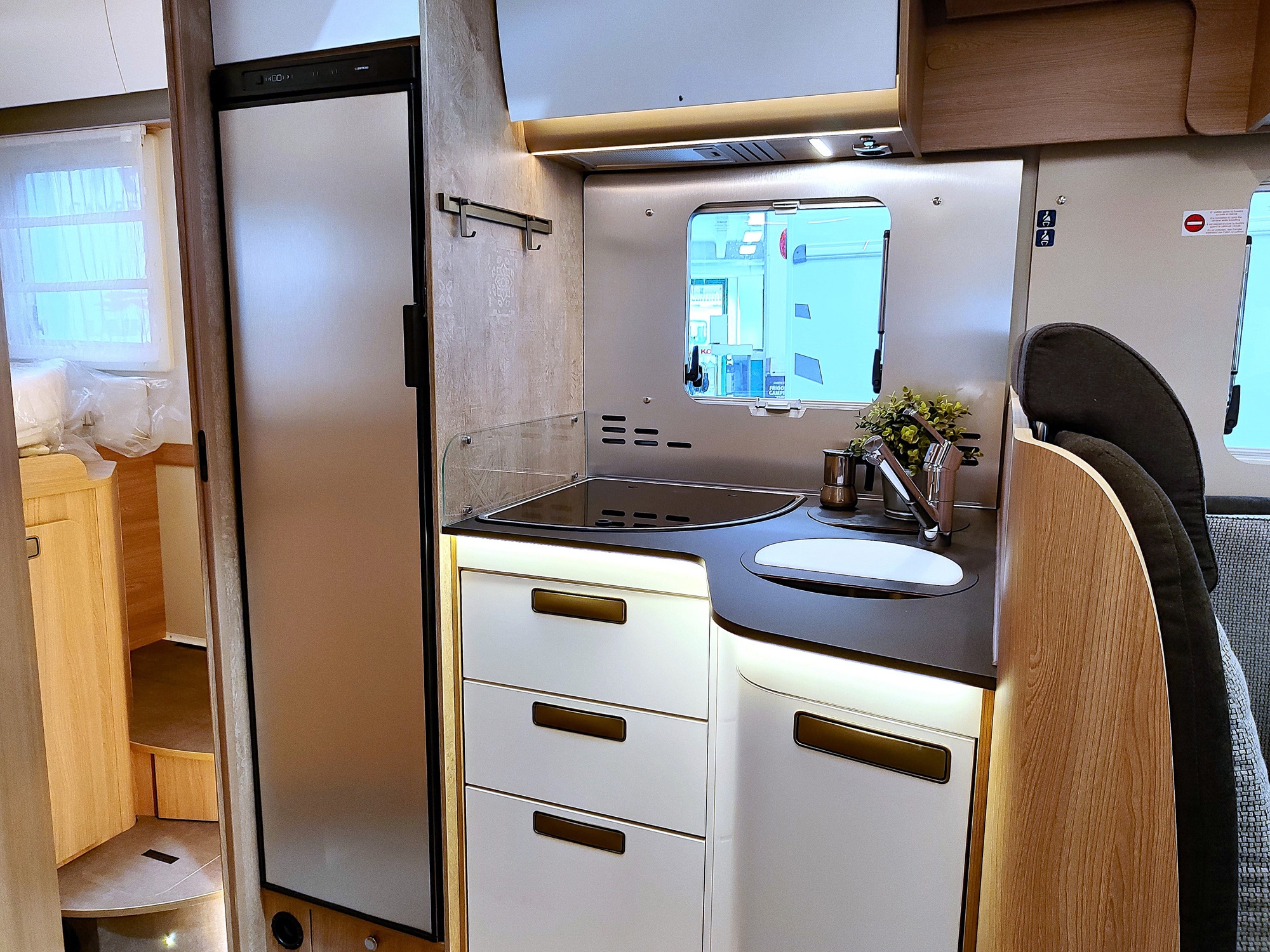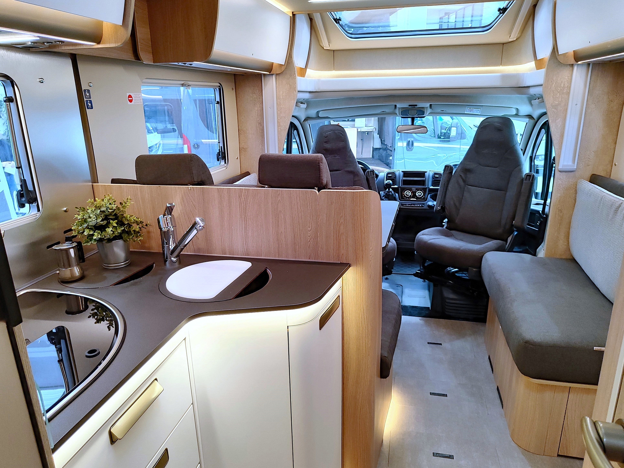 Camper nuovo semintegrale Laika, con letto matrimoniale trasversale posteriore, ampia dinette e cucina a L. Design ricercato e materiali selezionati.
