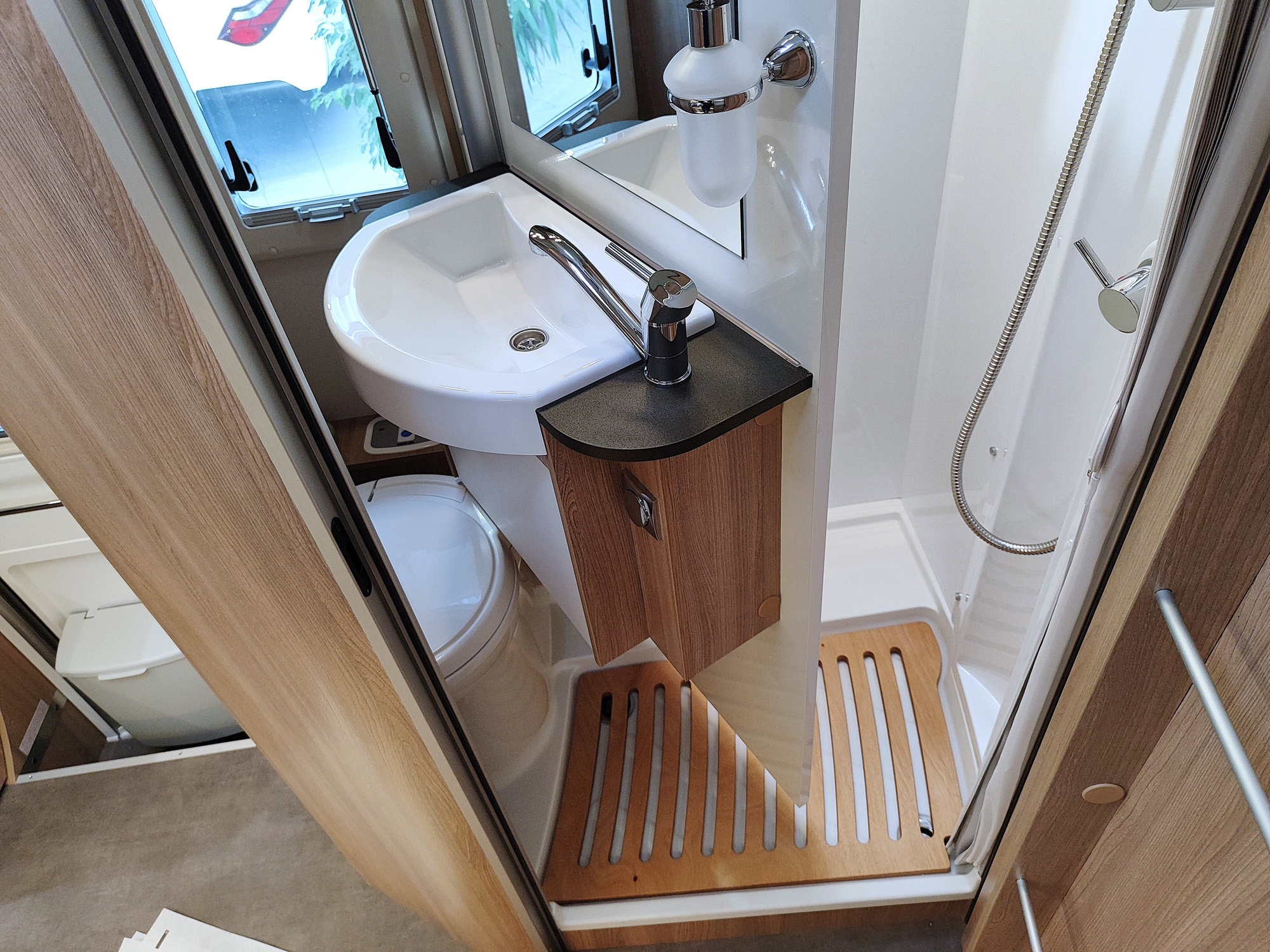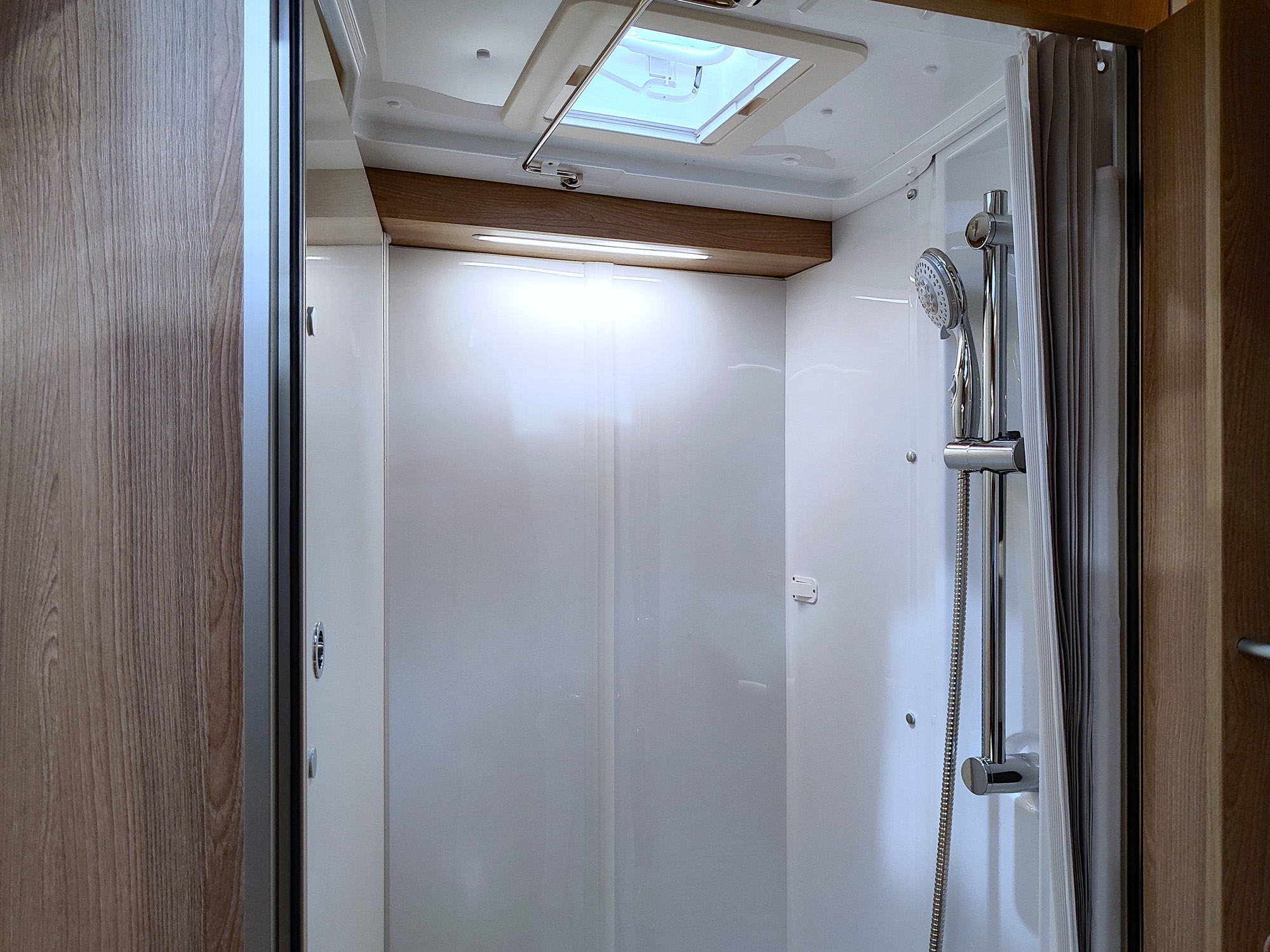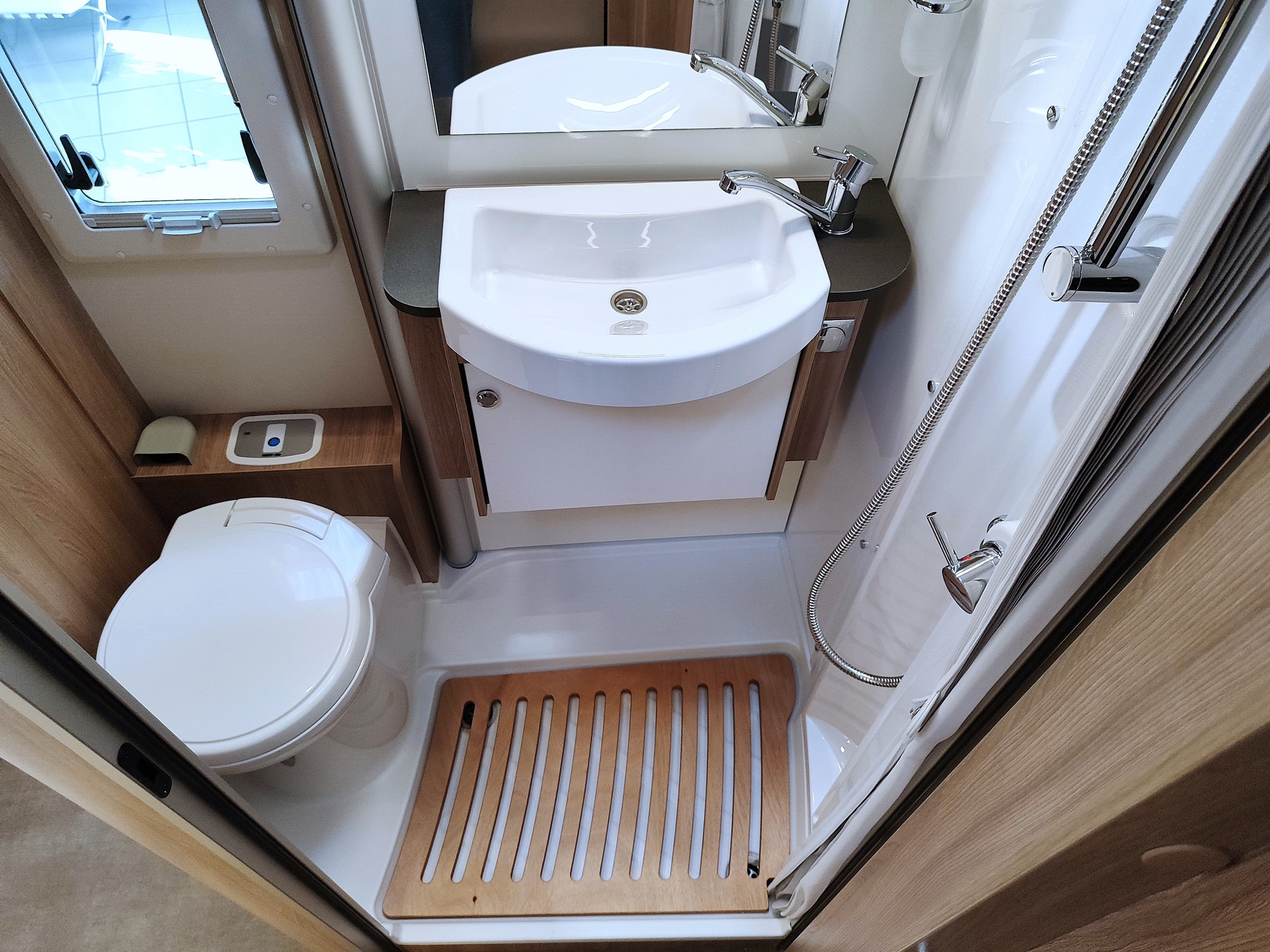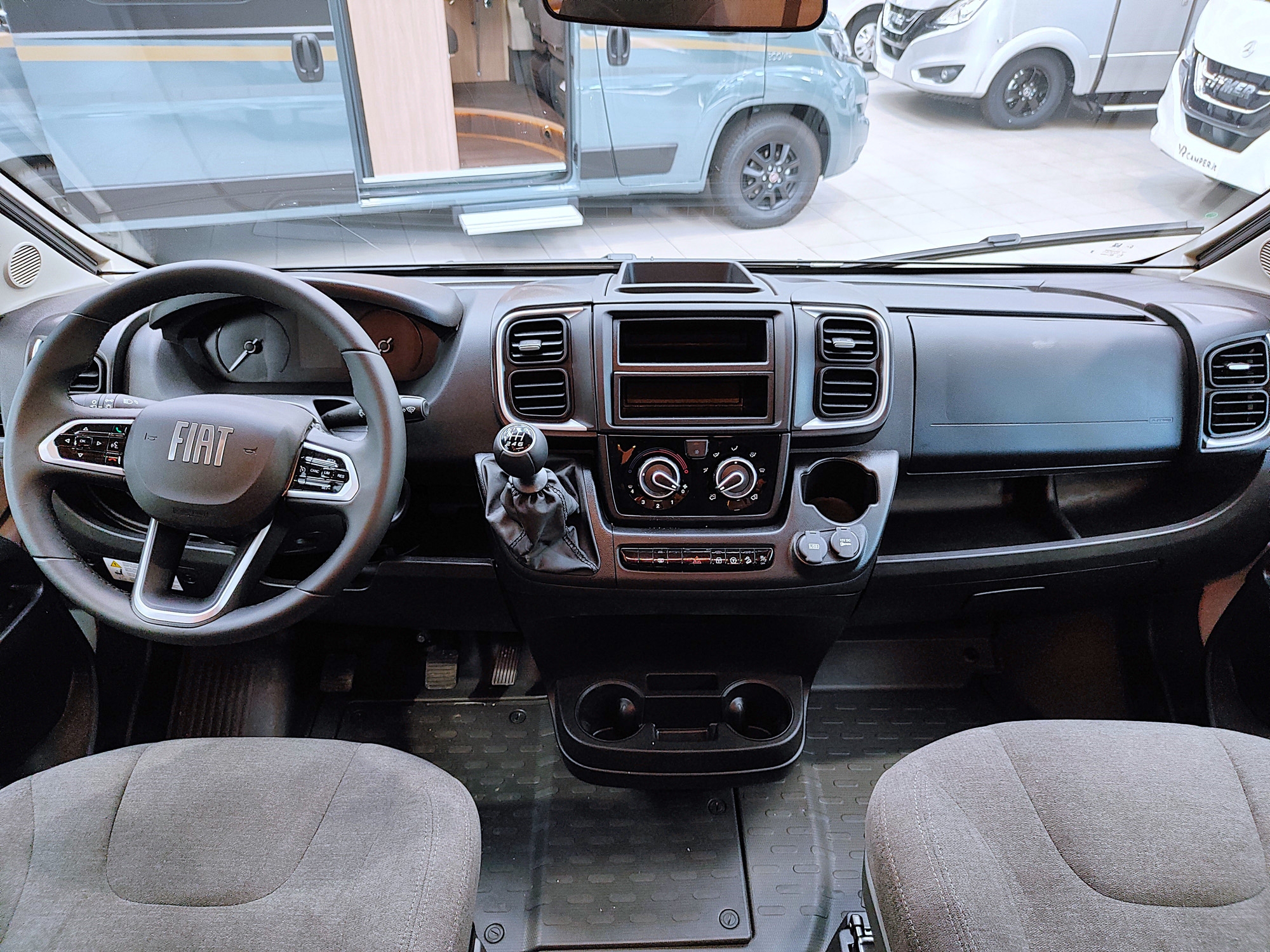 Pacchetto Comfort Ecovip L (Precablaggio per retrocamera, Pedana doccia, Moquette in cabina, Finestra in bagno, Oscuranti interni plissettati in cabina guida per parabrezza); Letto basculante elettrico, Messa su strada.