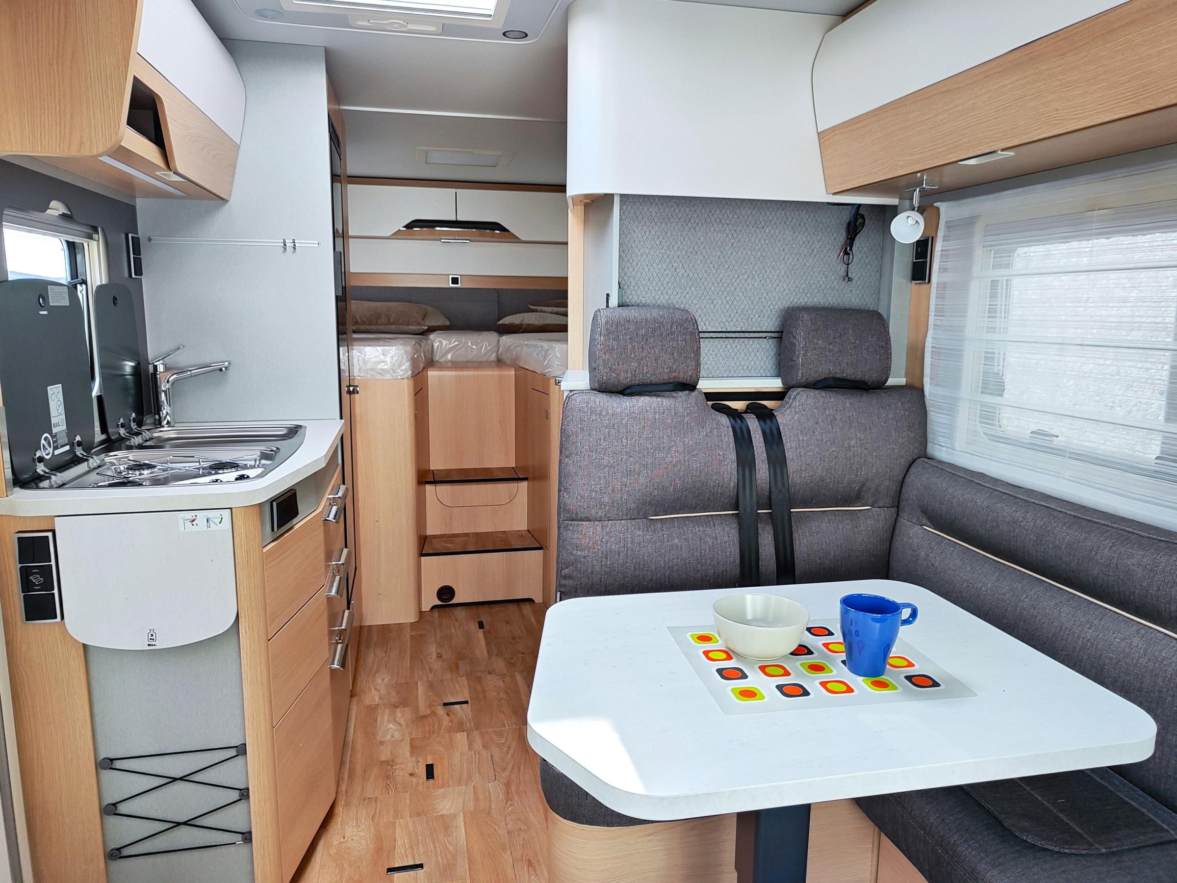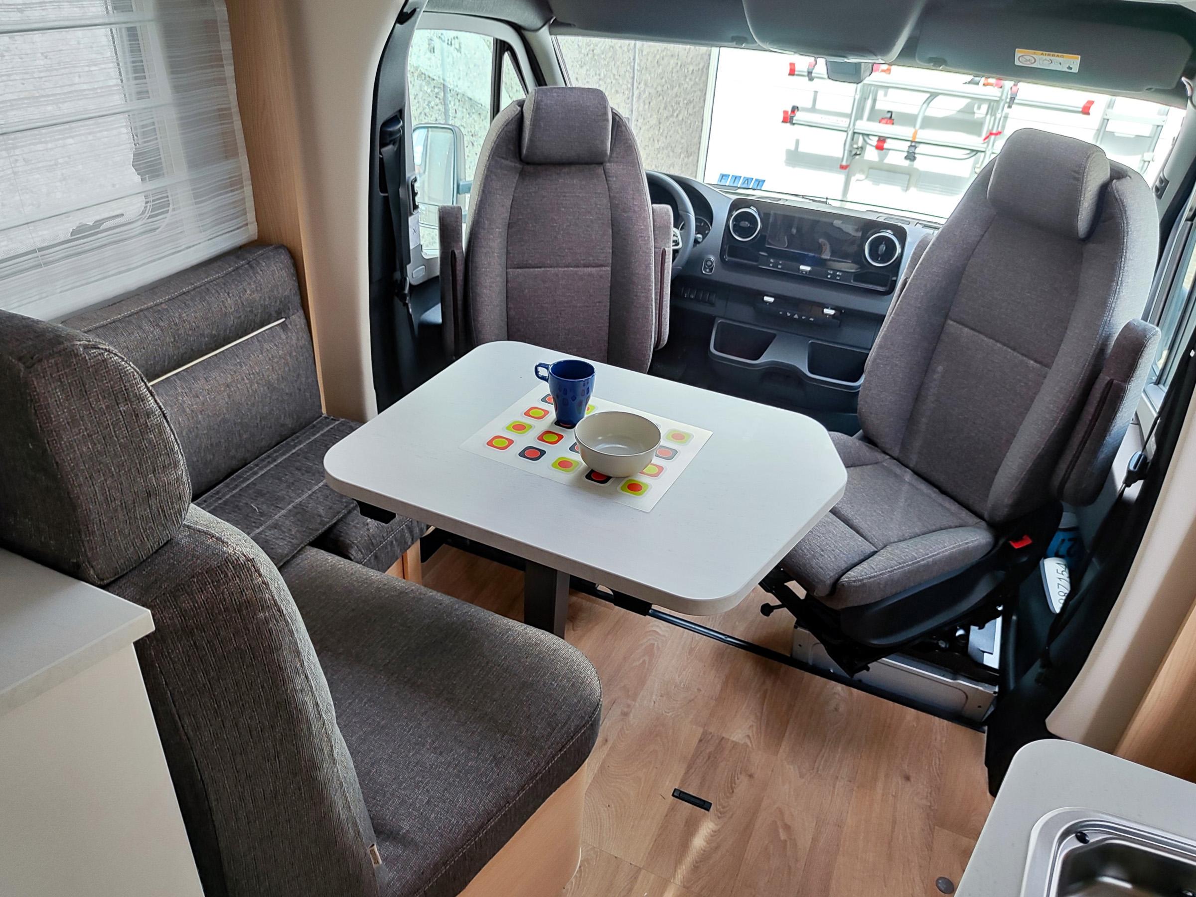 Dinette a L, tavolo traslabile nei due sensi e cinture di sicurezza integrate a 3 punti,