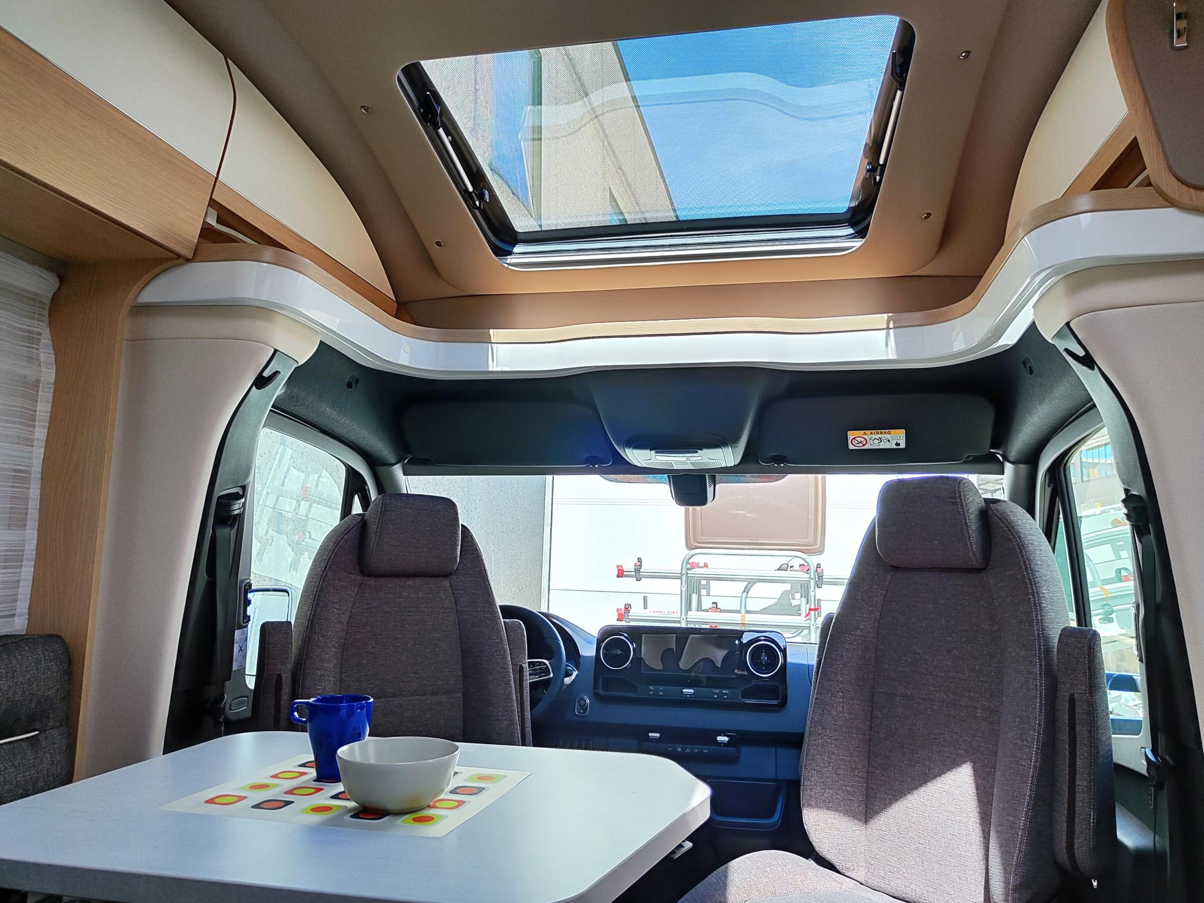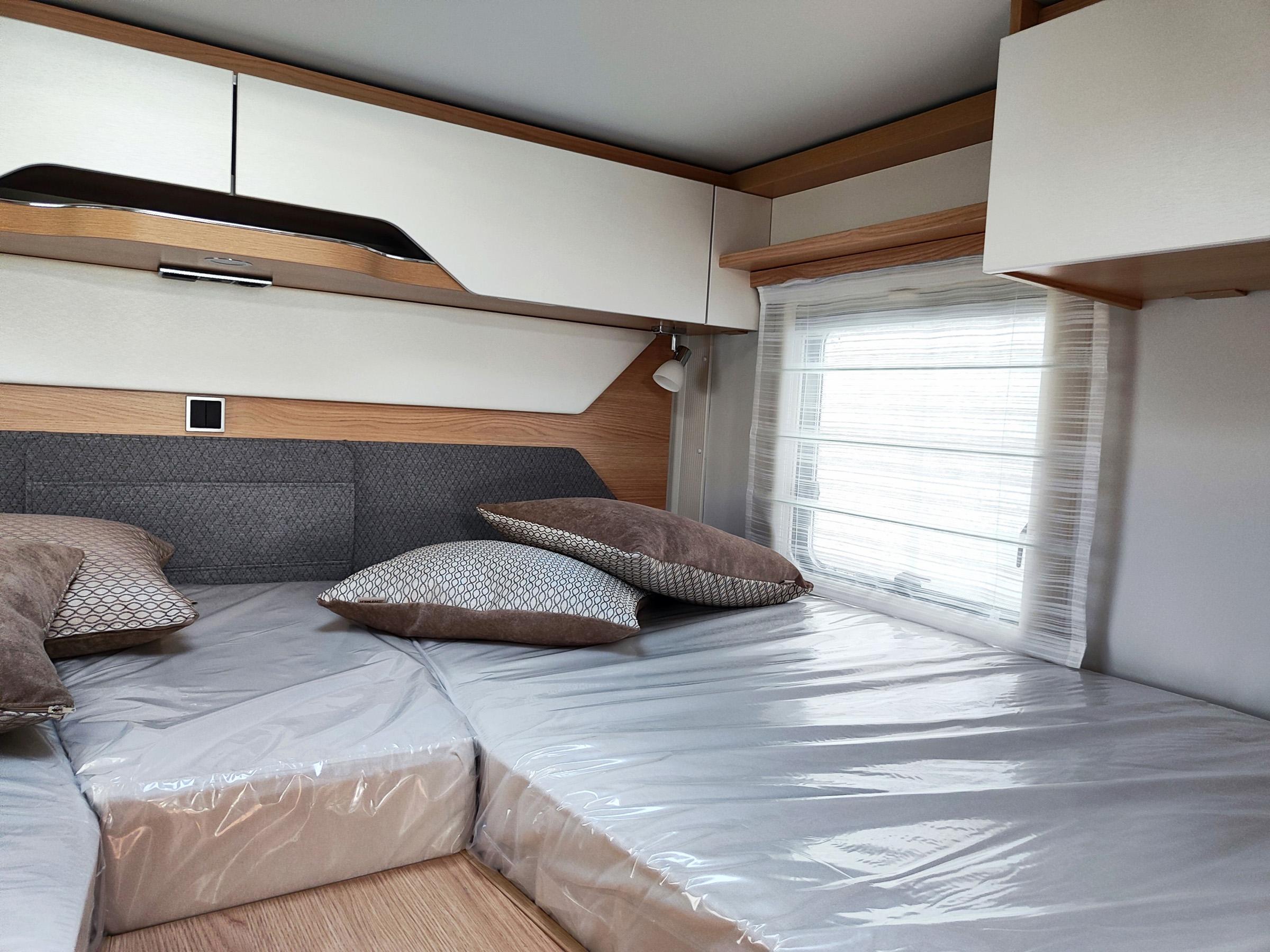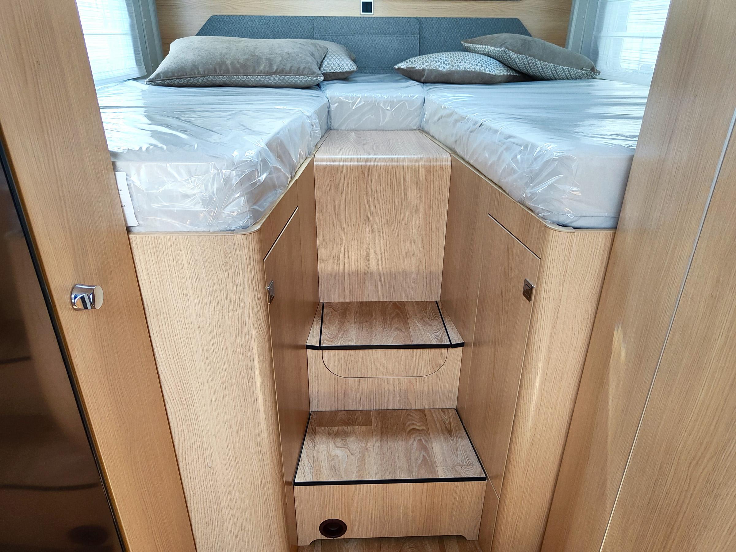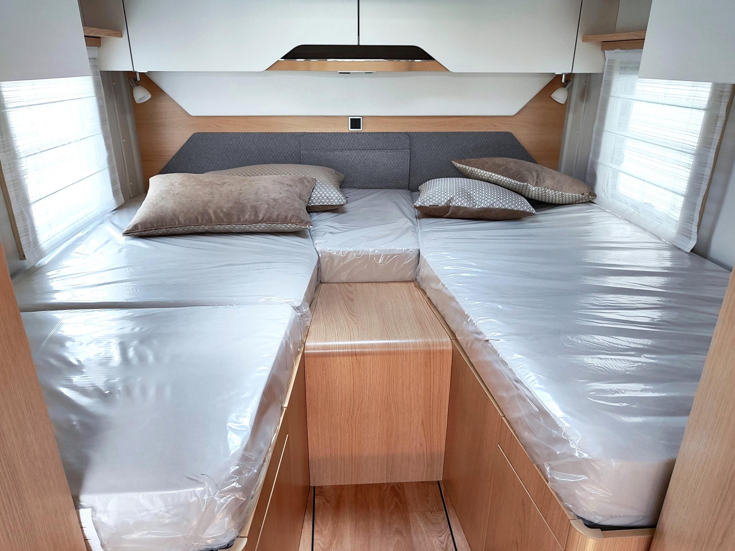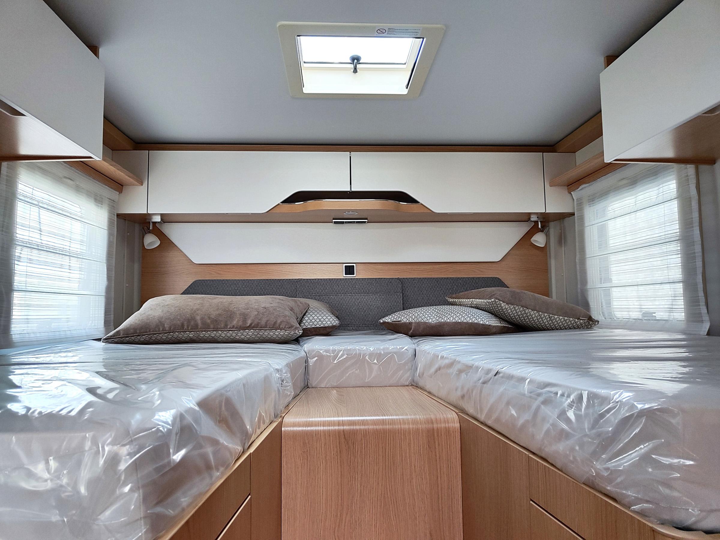 Camper nuovo con letti gemelli e dinette a L trasformabile in letto aggiuntivo. Garage con doppie porte. Su Mercedes-Benz 170 CV, con cambio automatico.