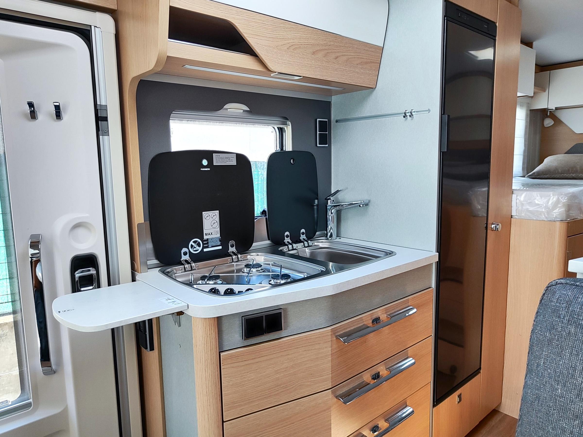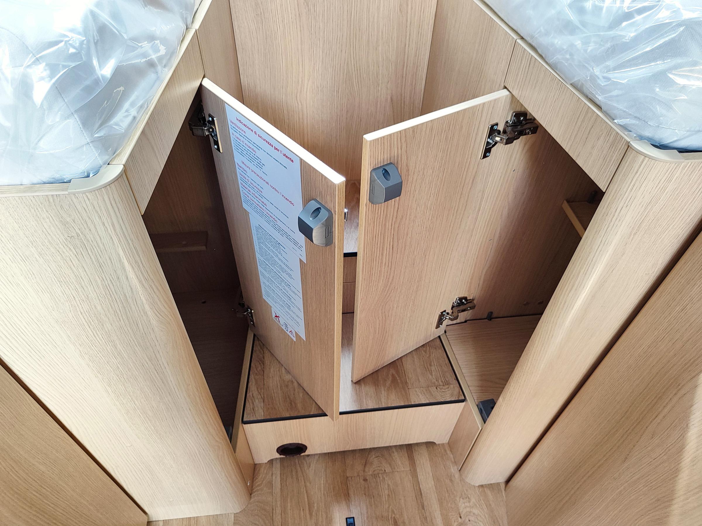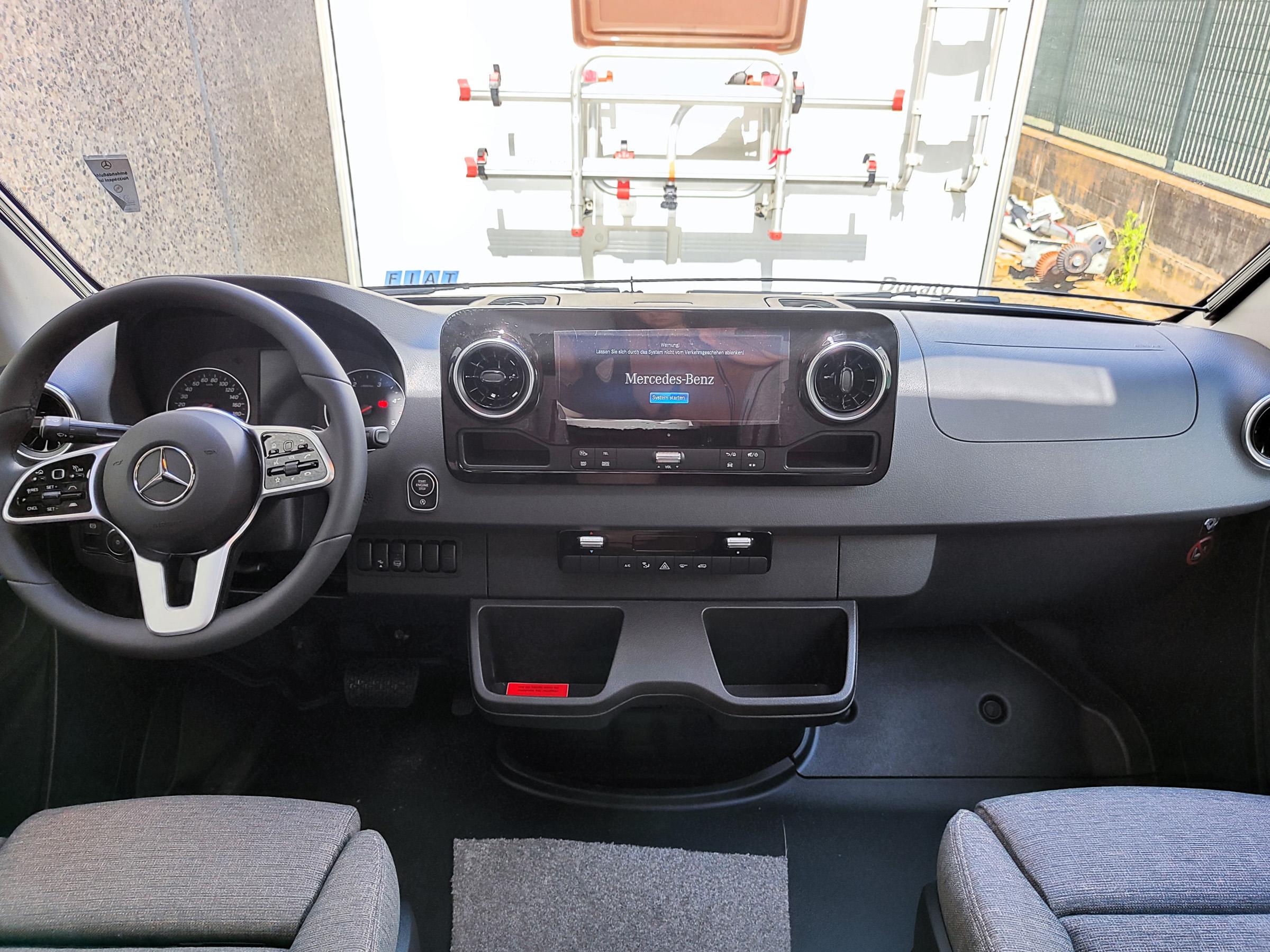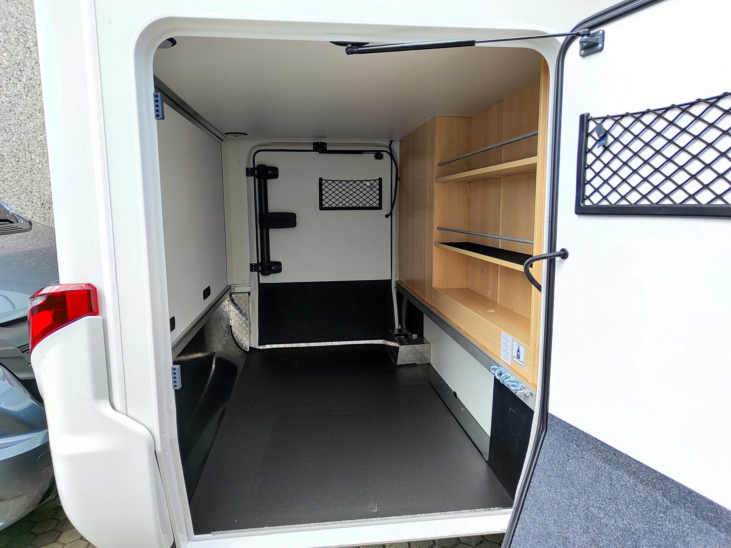 Camper nuovo con letti gemelli e dinette a L trasformabile in letto aggiuntivo. Garage con doppie porte. Su Mercedes-Benz 170 CV, con cambio automatico.