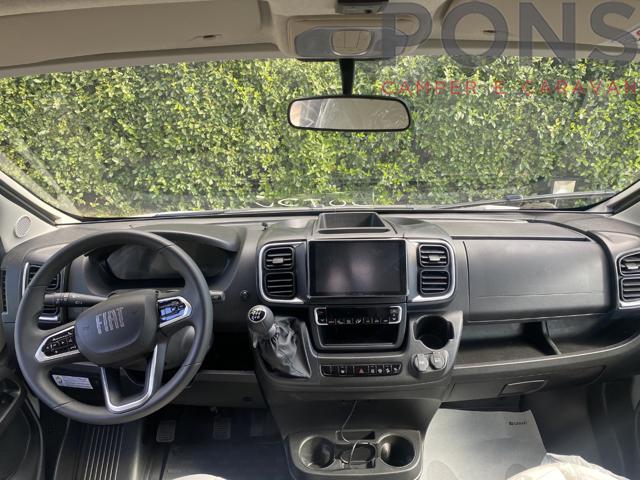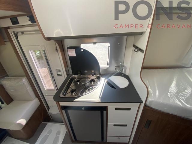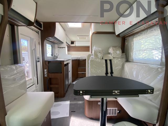 nonostante la sua lunghezza compatta di 6,60mt questo veicolo ospita una dinette confortevole grazie ai sedili guida girevoli e il tavolo con apertura a libro.