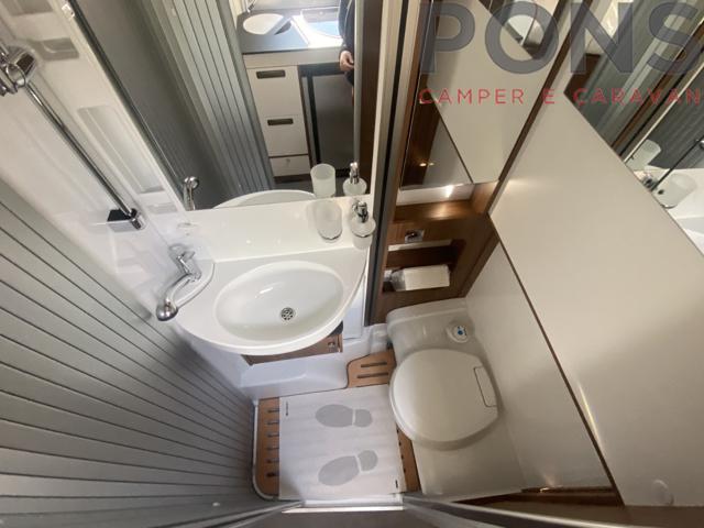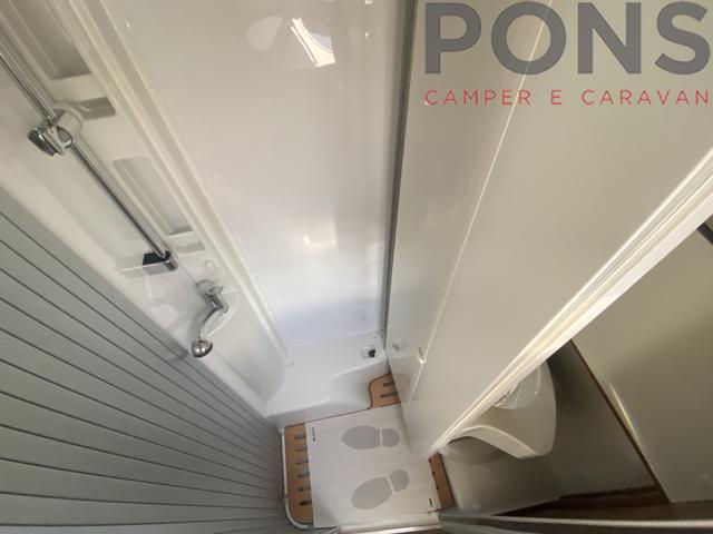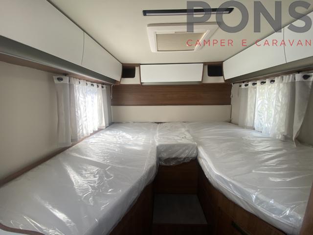 Letto basculante elettrico sopra la dinette e letti gemelli in coda. Bagno che ospita anche la doccia grazie alla parete varia.