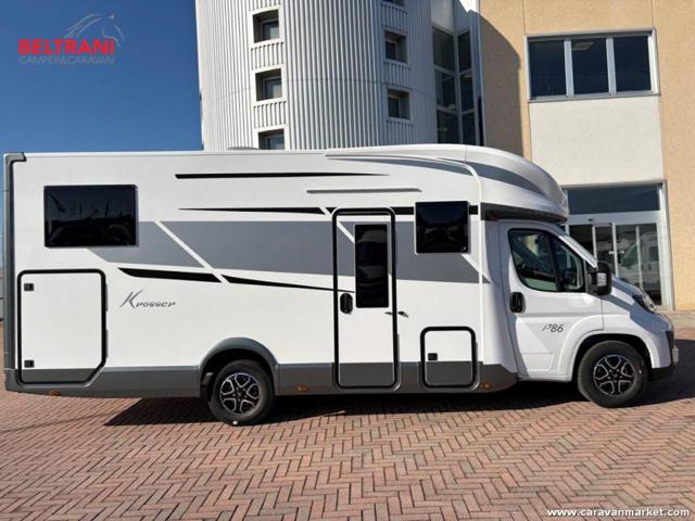 Mobilvetta Krosser P86 2026 | Automatico. Semintegrale con doppio pavimento tecnico e layout con letti gemelli posteriori, pensato per chi cerca comodità di alto livello e ampia capacità di stivaggio in ogni stagione, Il cambio automatico su Fiat Ducato 2.2 rende la guida fluida e sicura, mentre il living face?to?face con skydome, cucina centrale completa e toilette con doccia separata mettono a disposizione spazi luminosi e funzionali per la vita a bordo, Fari full LED, ampio garage passante collegato all?abitacolo e dotazioni moderne per 4 posti viaggio/letto completano un allestimento curato, ideale per viaggi lunghi con comodità, tecnologia e design in puro stile Mobilvetta