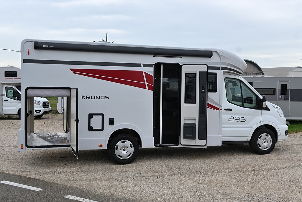 Pacchetto Kronos (Motorizzazione Ford Transit 350 2.0 TDCi 165 CV, pannello solare da 200 W, oscuranti plissettati in cabina, porta cellula XL con finestra e zanzariera, fanali High Series con luci statiche di svolta, paraurti anteriore verniciato in tinta con la carrozzeria, coprisedili cabina, sky-roof panoramico, pannello di controllo Truma CP Plus, rivestimenti interni cabina e plancia strumenti Trend), Pacchetto Open Air (Tendalino, doccetta esterna, presa gas esterna). Prezzo totale: € 68.580,00 Chiavi in mano