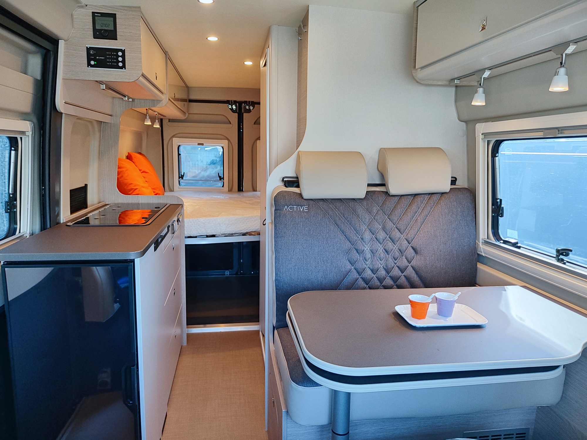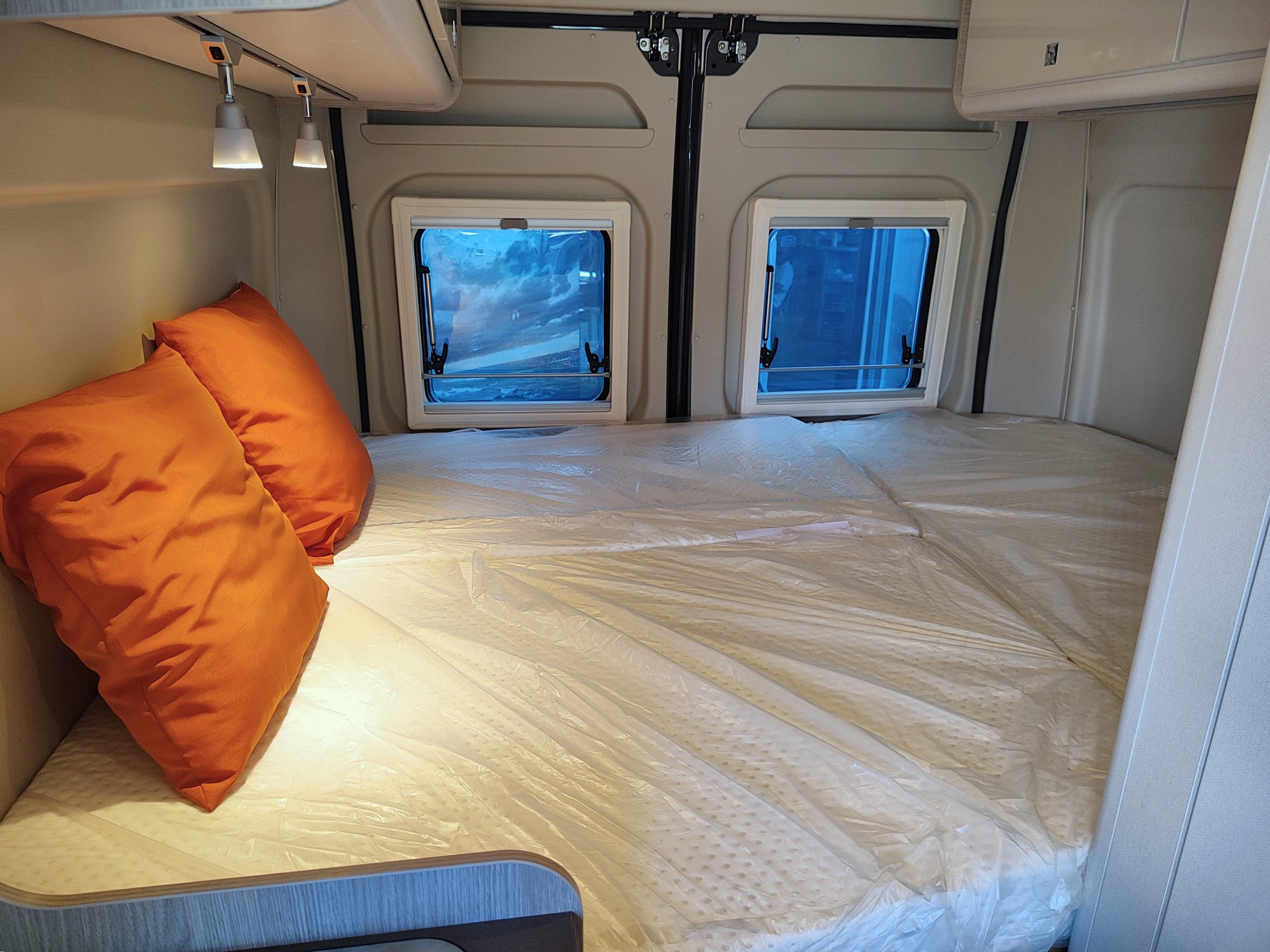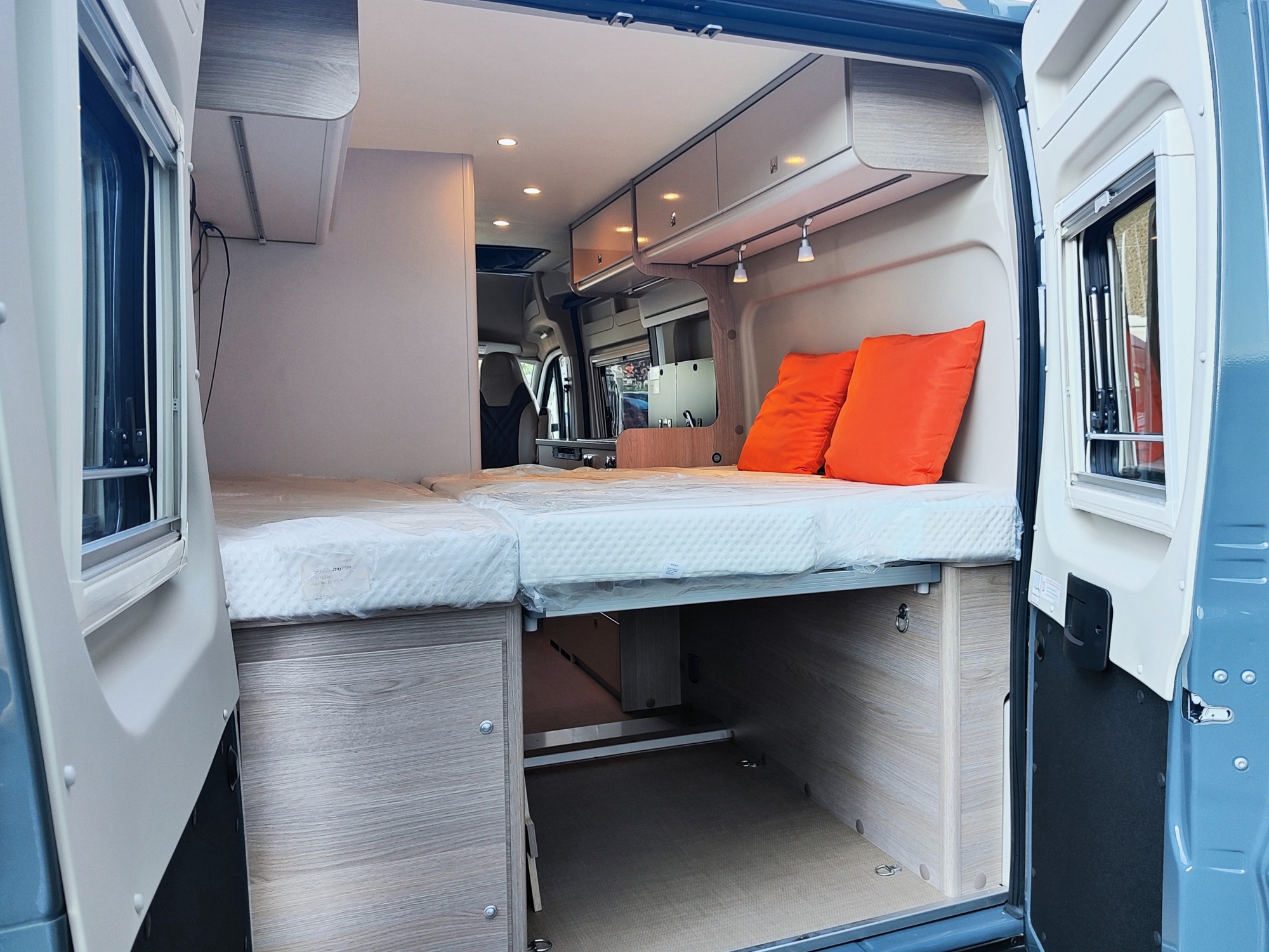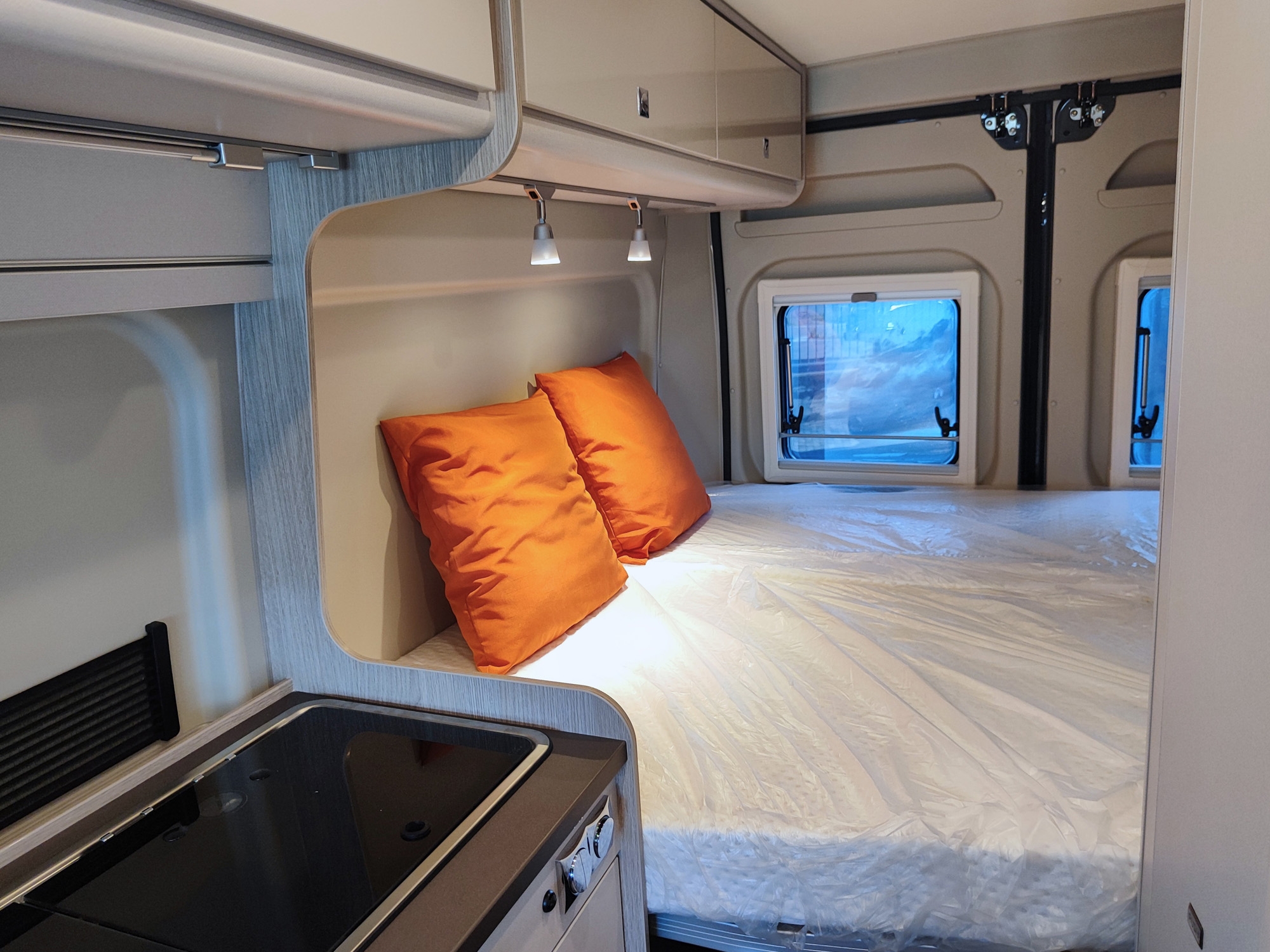 Camper furgonato nuovo 4 posti, con letto matrimoniale posteriore, dotato di cucina e toilette. Da VR Camper a Torino - Druento.