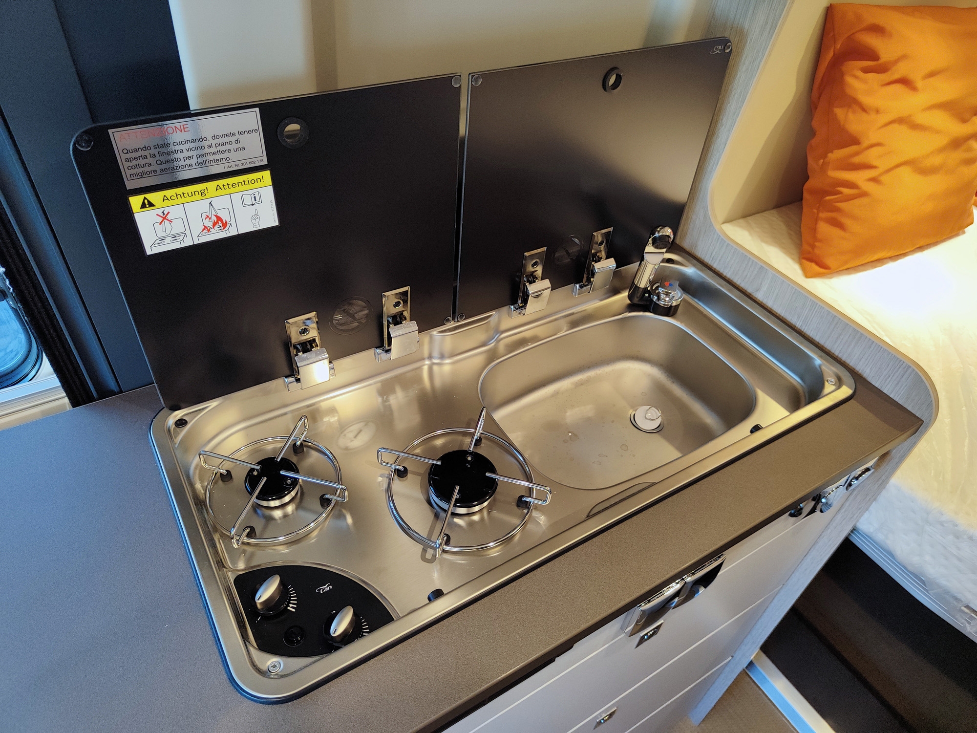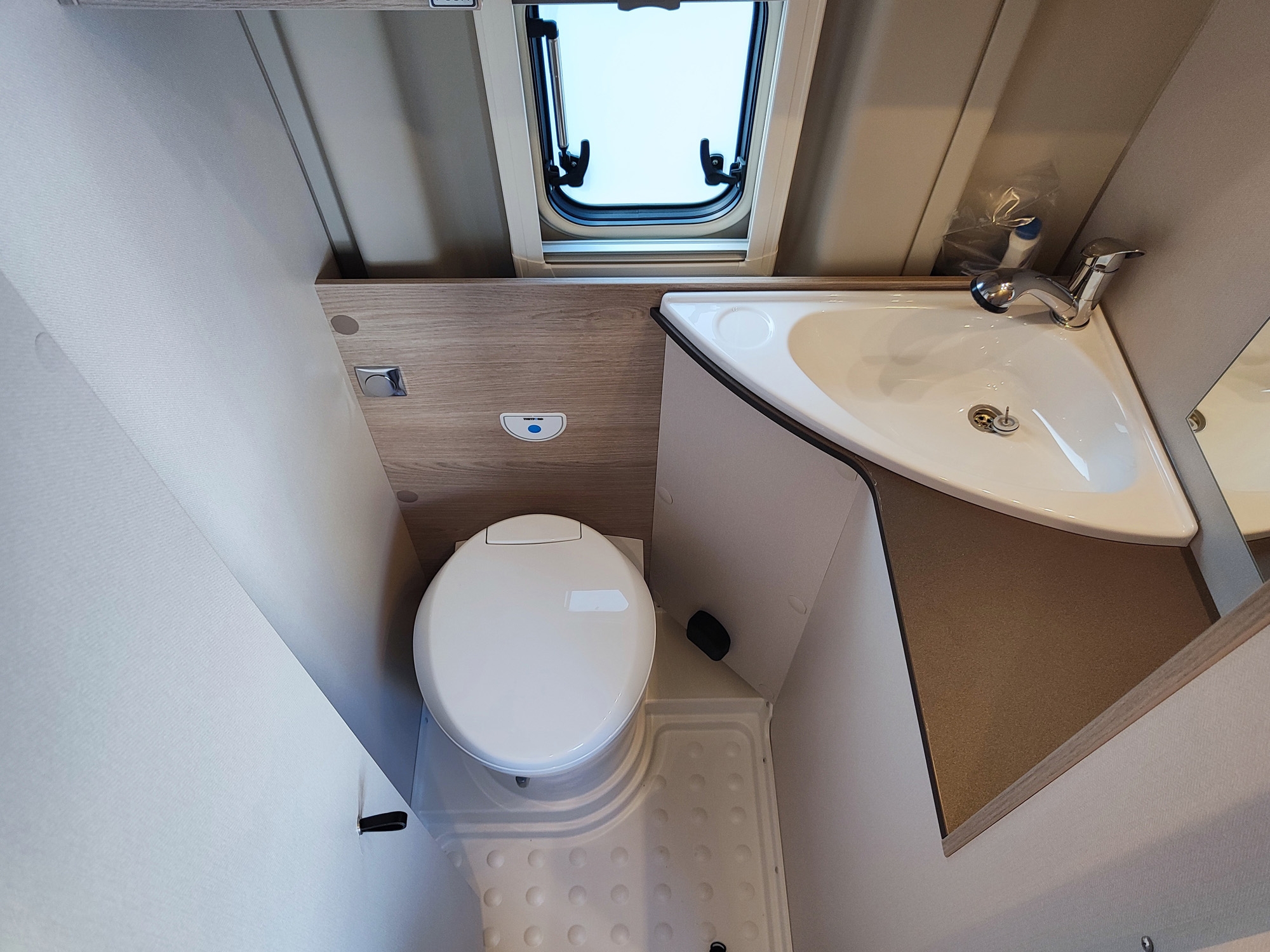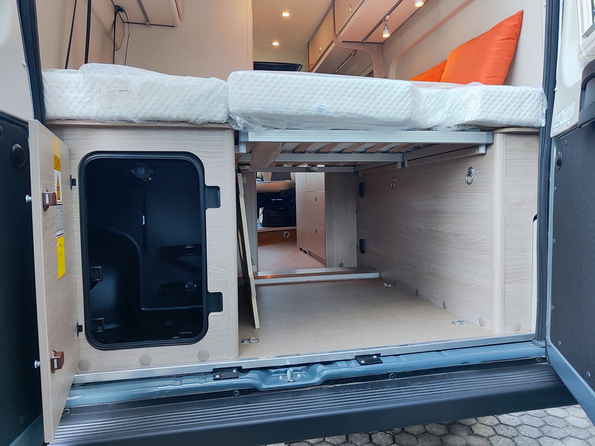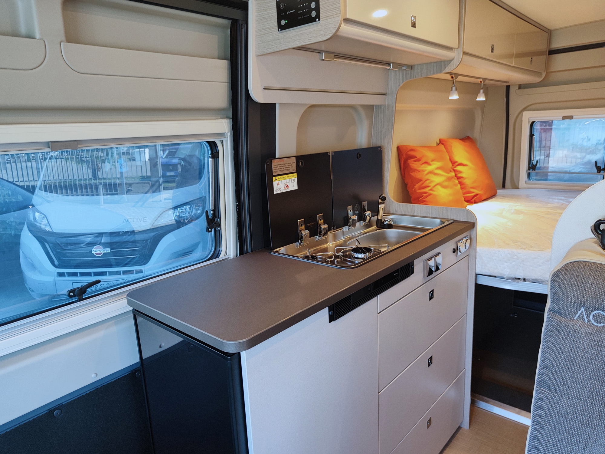 Camper furgonato nuovo 4 posti, con letto matrimoniale posteriore, dotato di cucina e toilette. Da VR Camper a Torino - Druento.