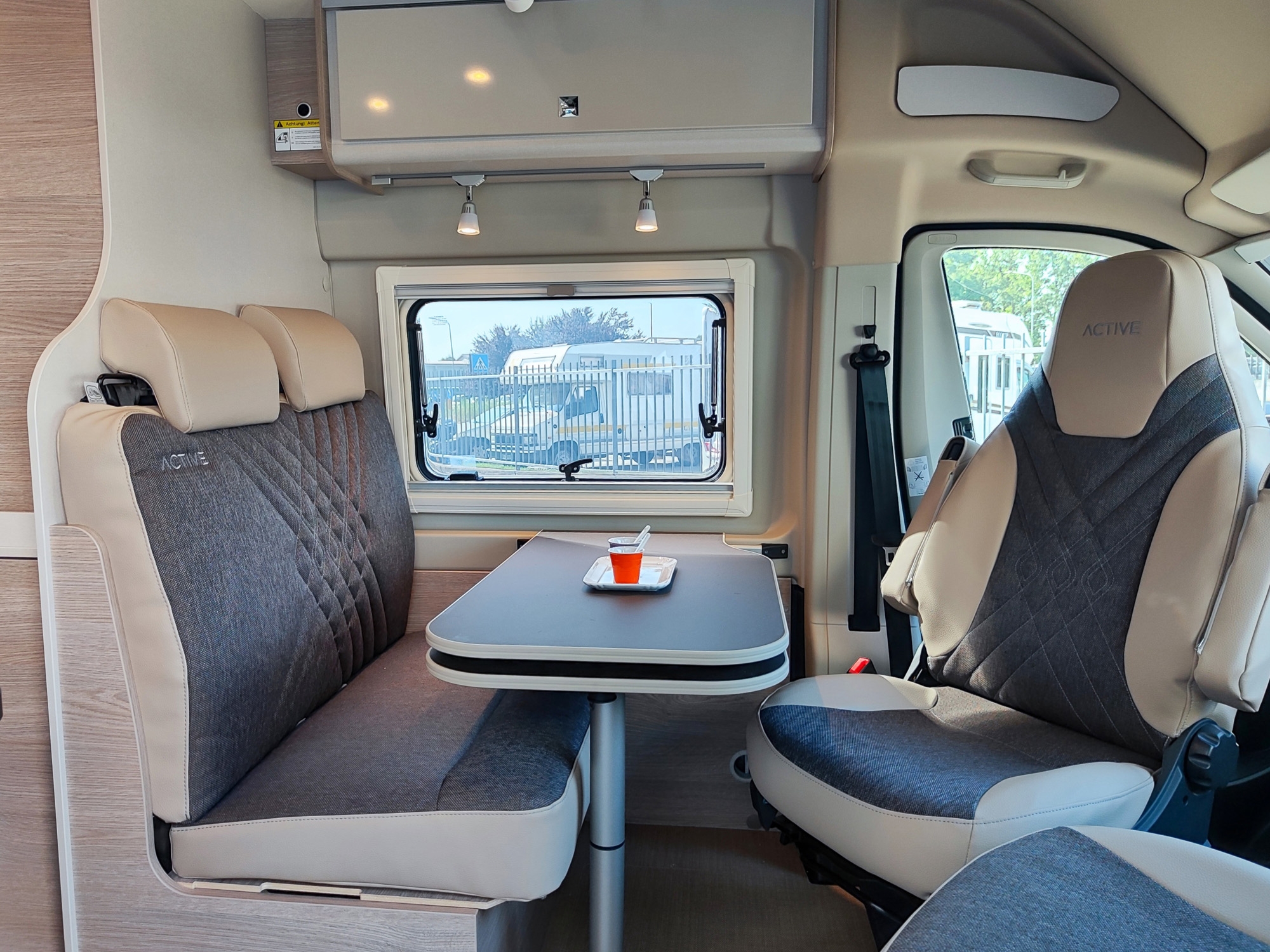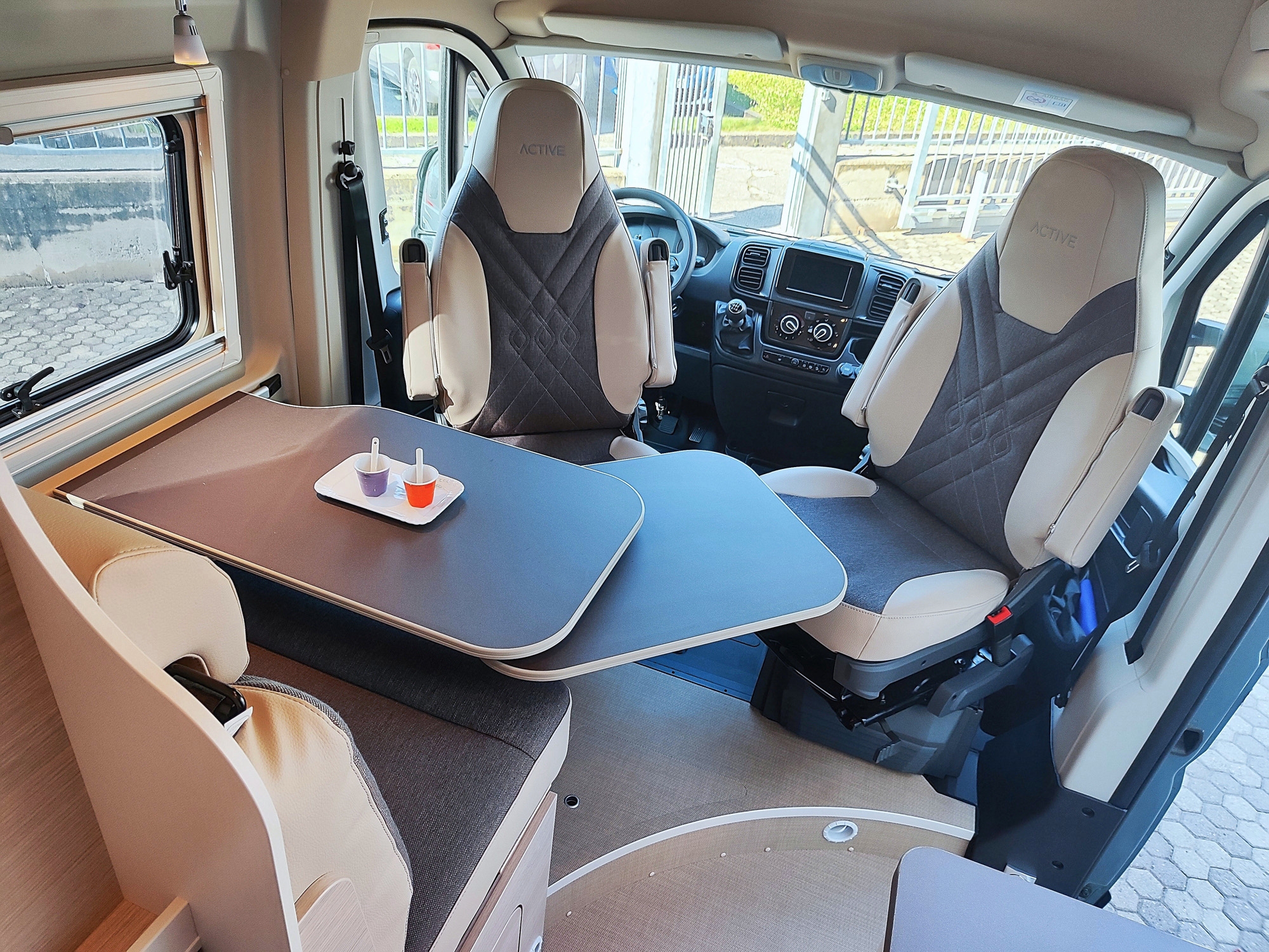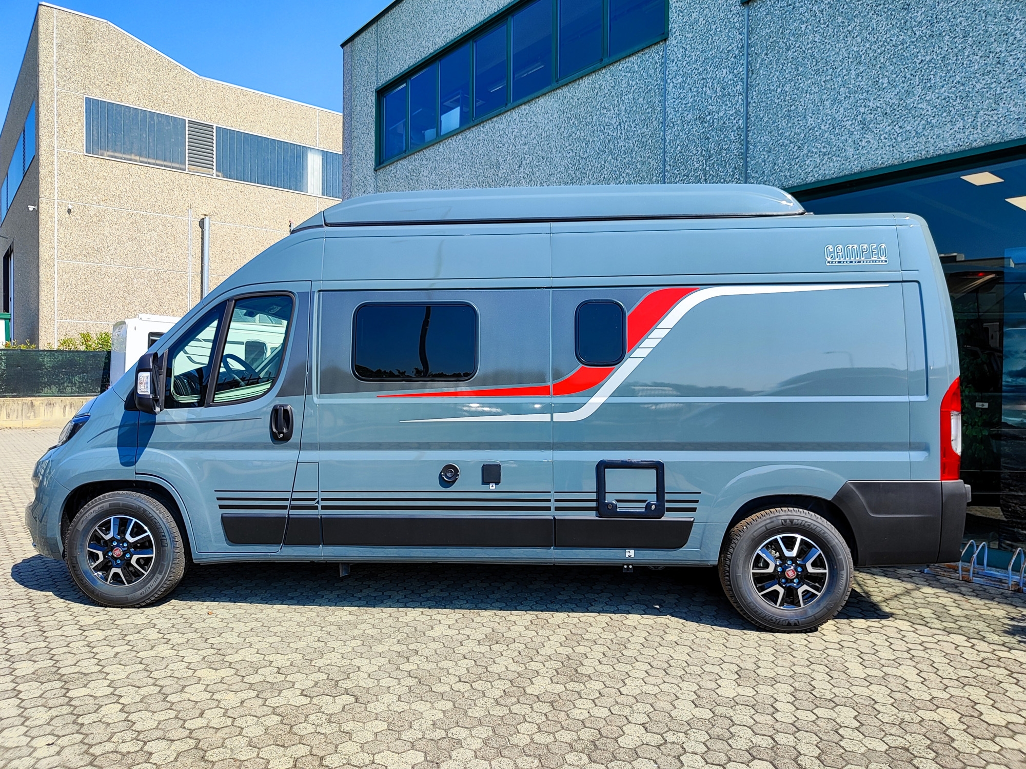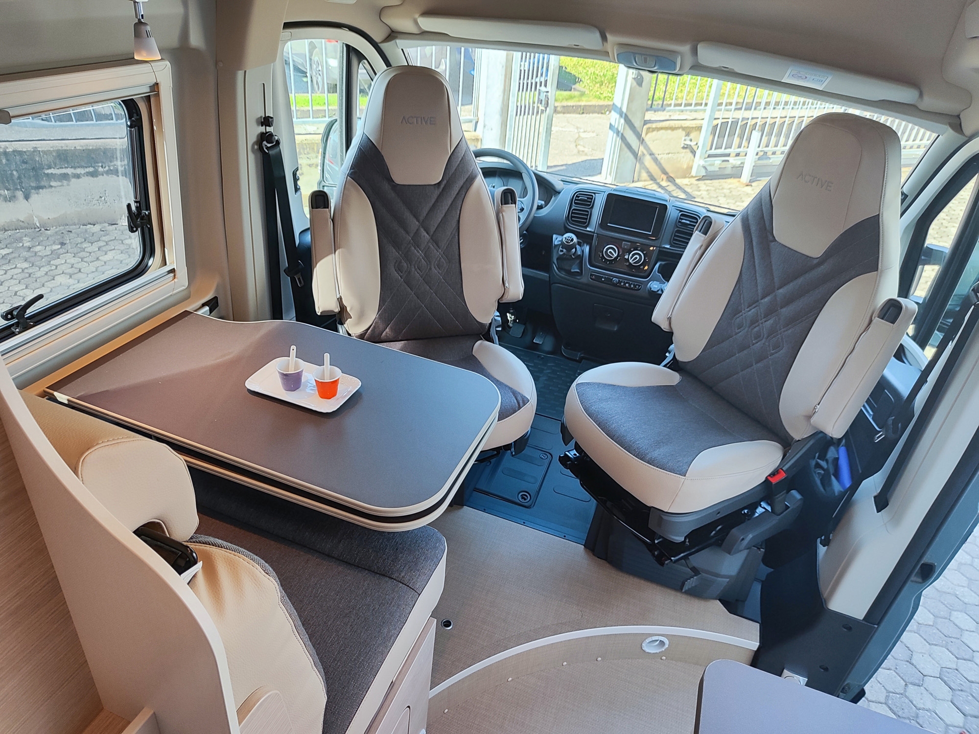 Pacchetto Campeo Fiat: ESP, Gradino d'ingresso elettrico, Oscuranti plissettati in cabina guida, Zanzariera sul portellone laterale, Spoiler frontale in tinta, Illuminazione indiretta sopra i pensili, Autoradio da 7", Videocamera di retromarcia, Fari anteriori con cornice nera, Griglia anteriore lucida.