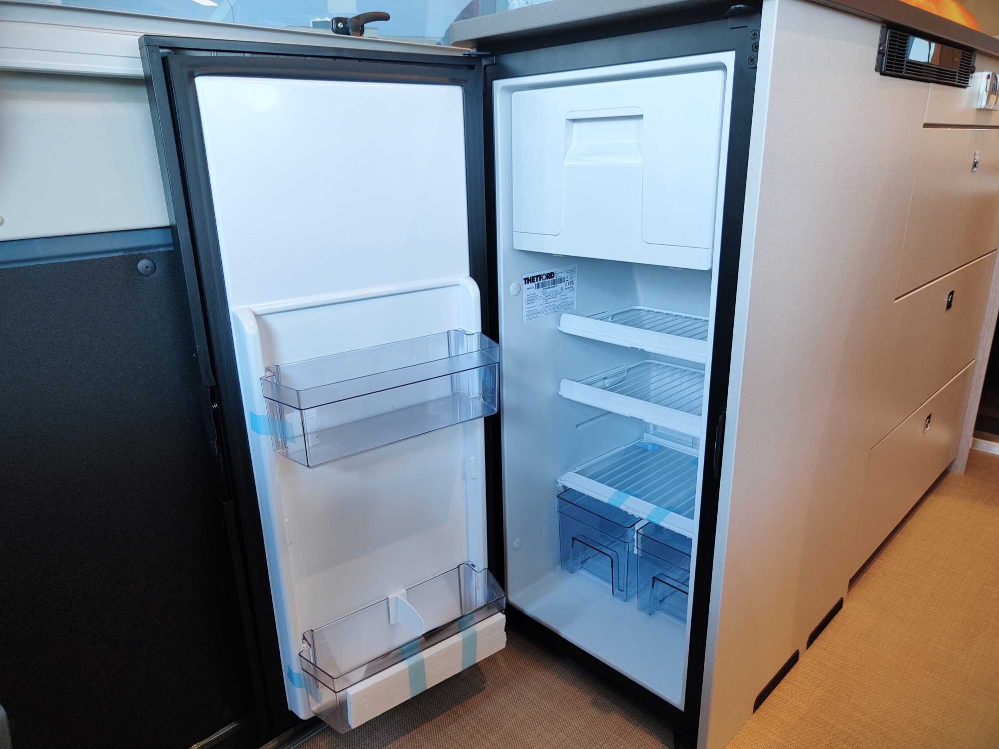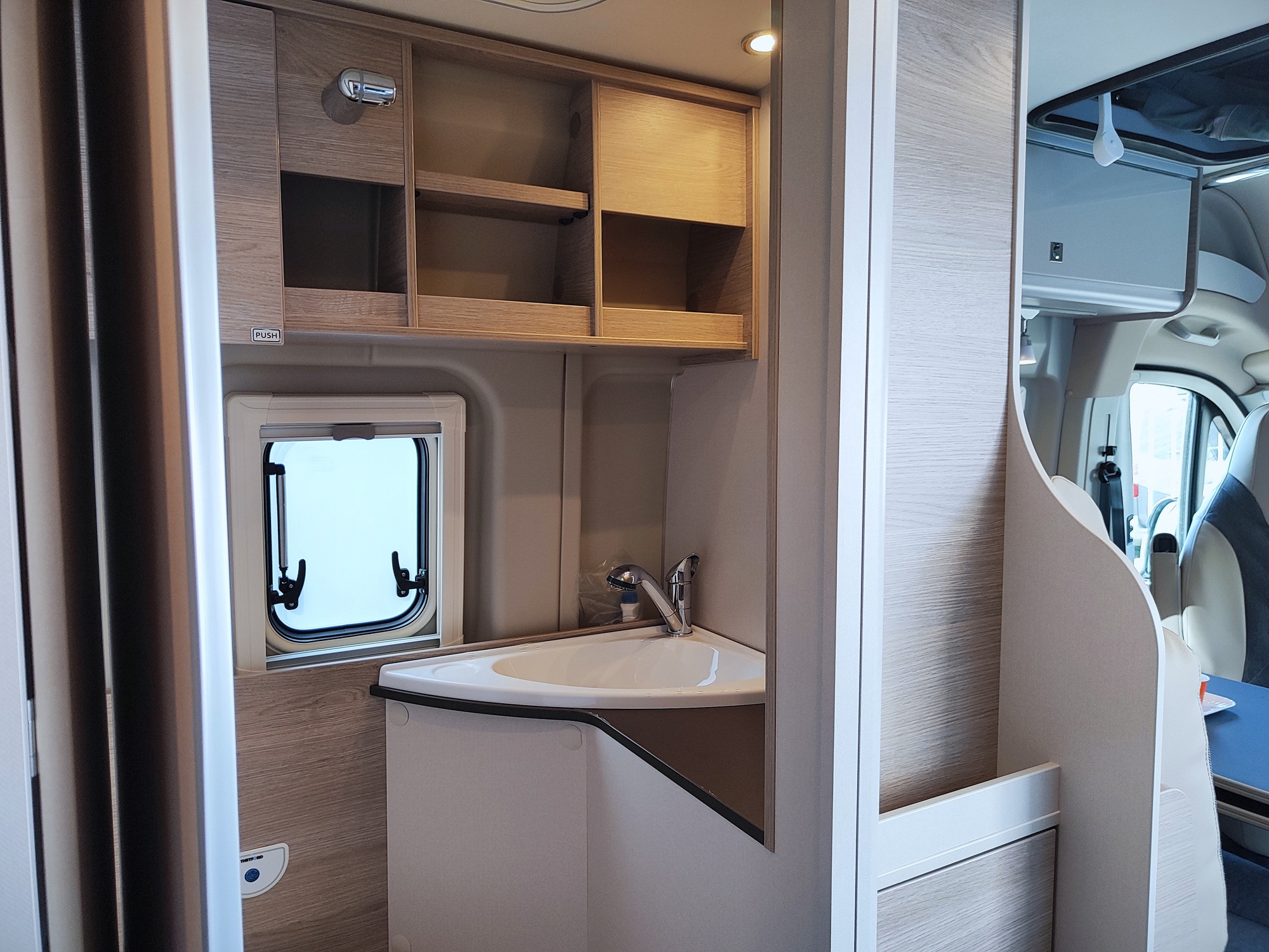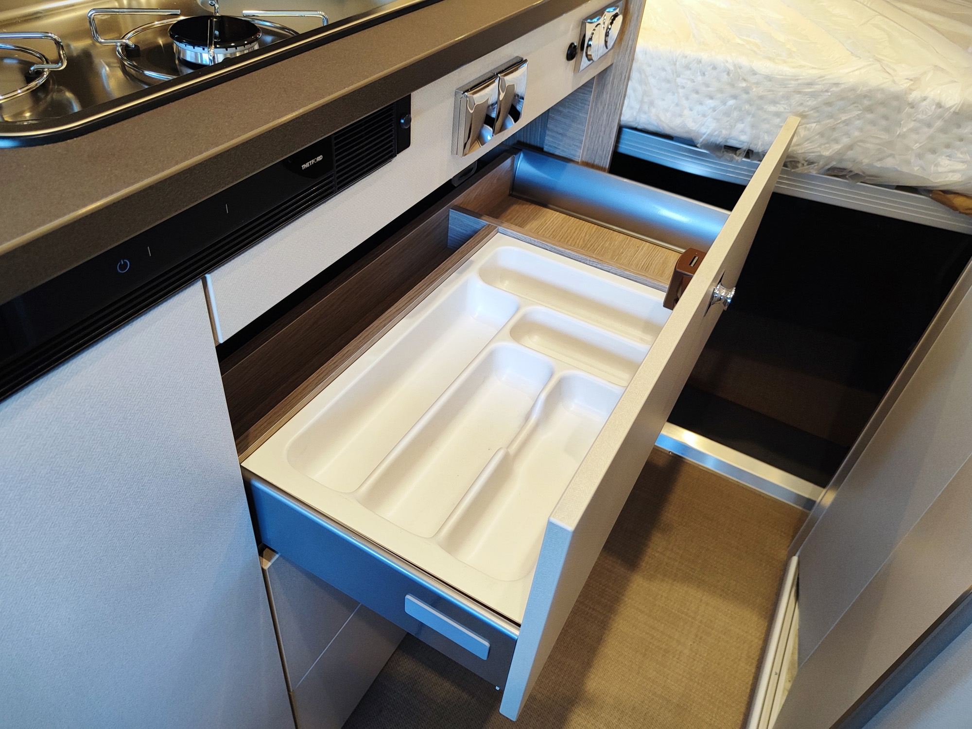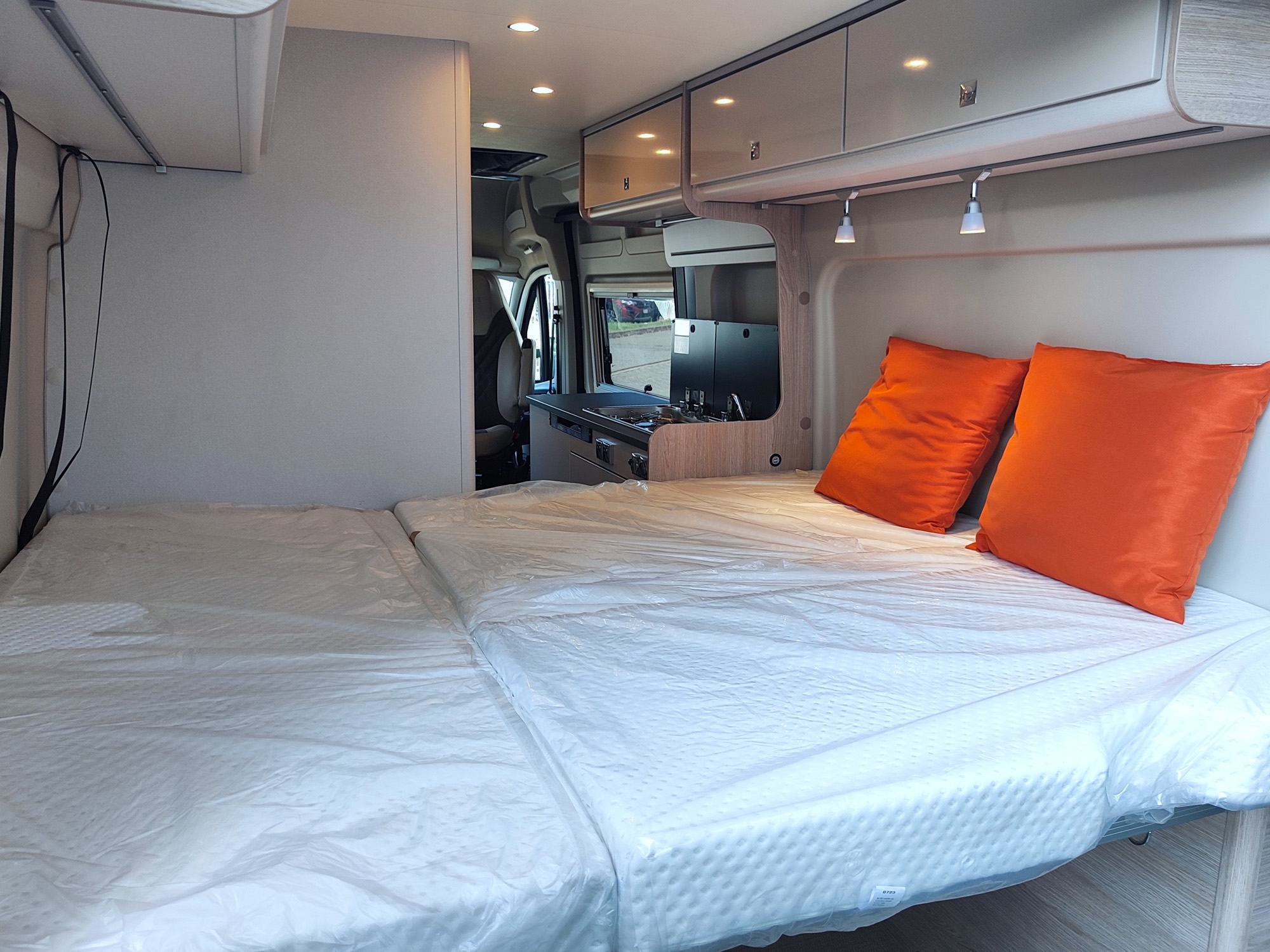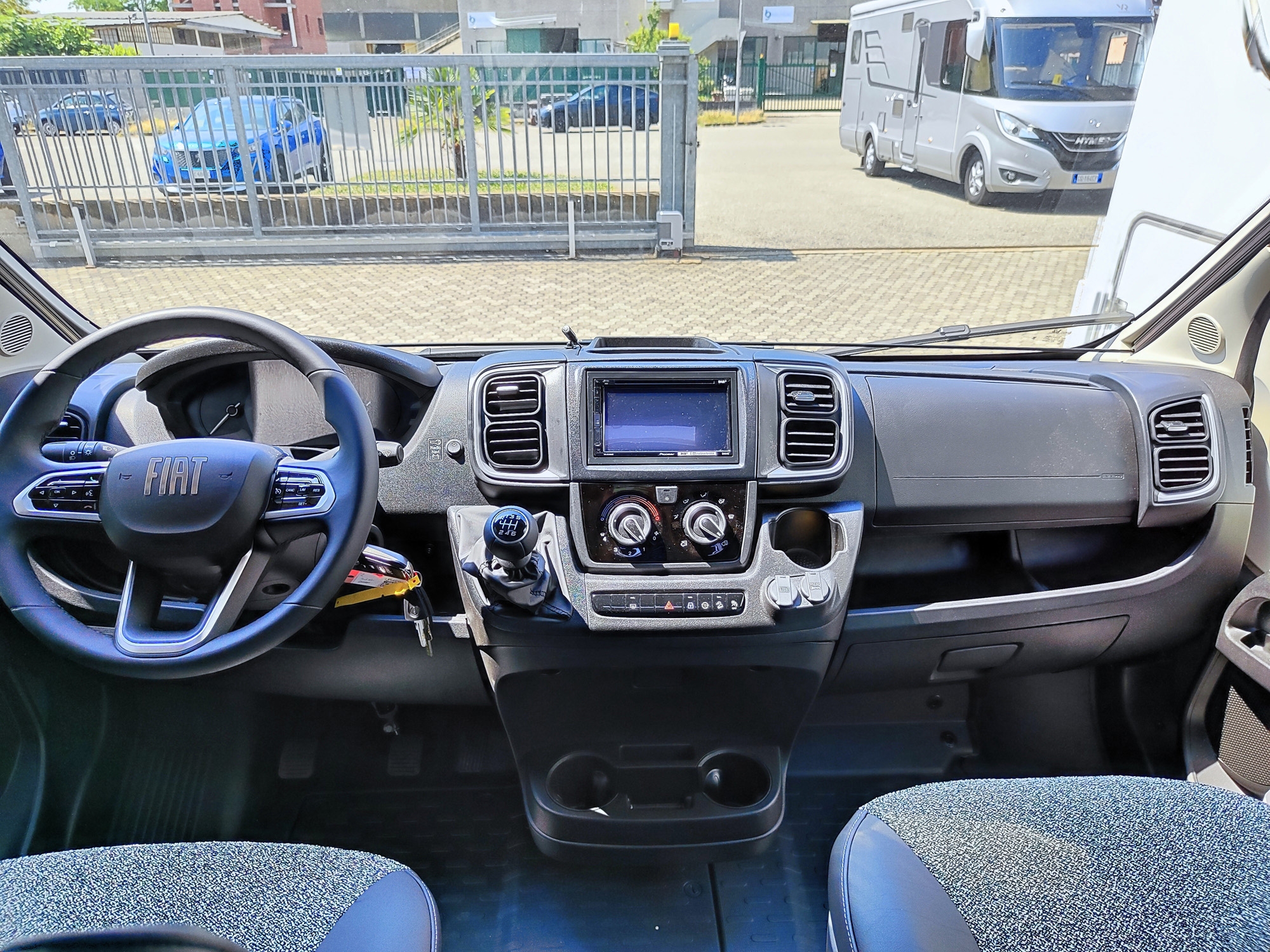Pacchetto Campeo Fiat: ESP, Gradino d'ingresso elettrico, Oscuranti plissettati in cabina guida, Zanzariera sul portellone laterale, Spoiler frontale in tinta, Illuminazione indiretta sopra i pensili, Autoradio da 7", Videocamera di retromarcia, Fari anteriori con cornice nera, Griglia anteriore lucida.