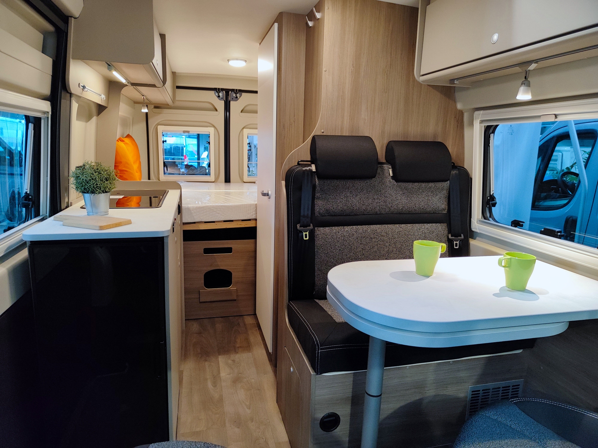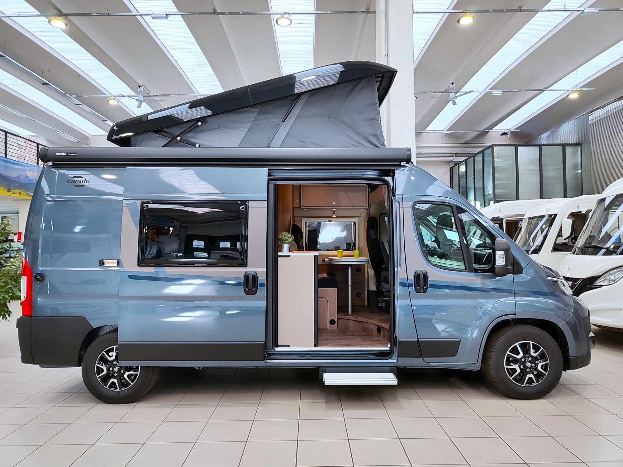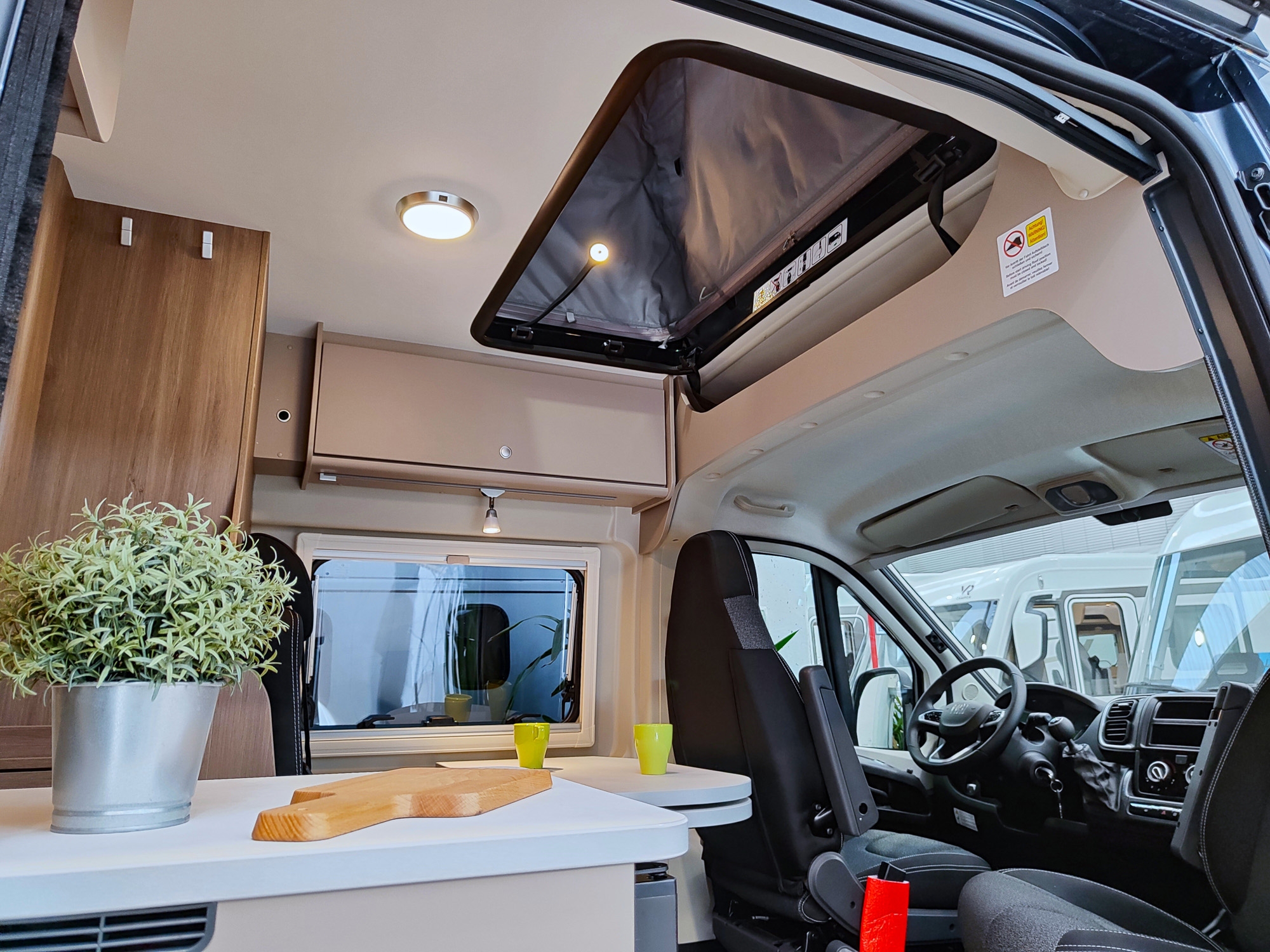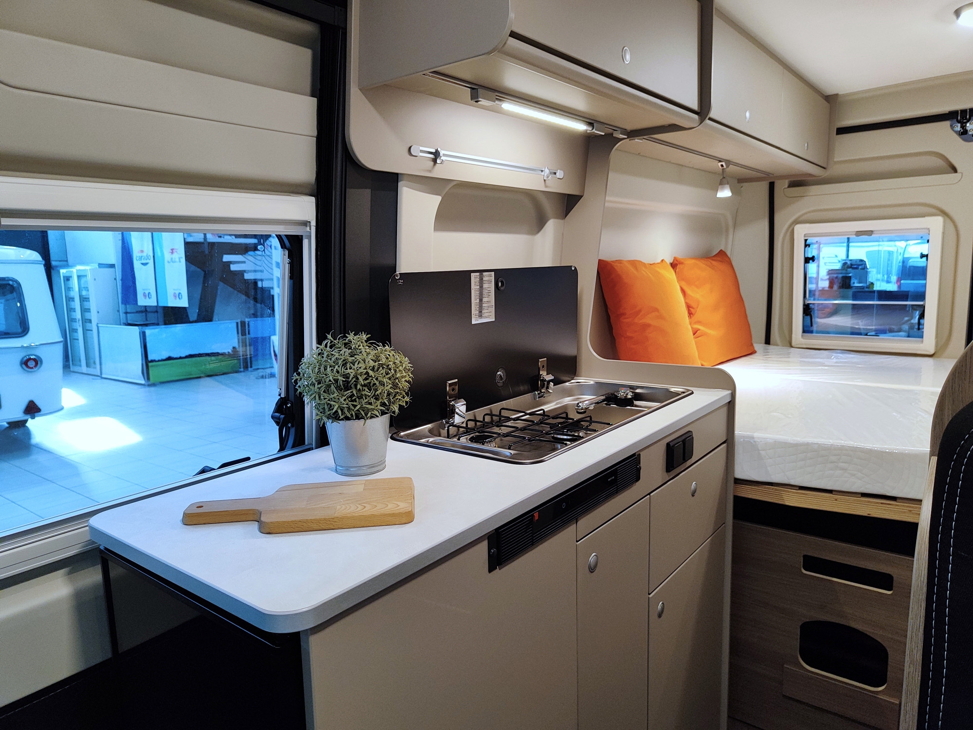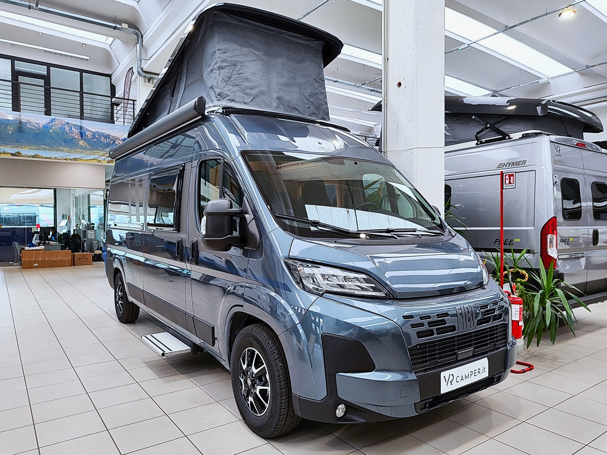 Camper furgonato nuovo con tetto sollevabile. Pratico per la vita quotidiana grazie alle misure compatte, ma sempre equipaggiato con tutto per le vacanze.