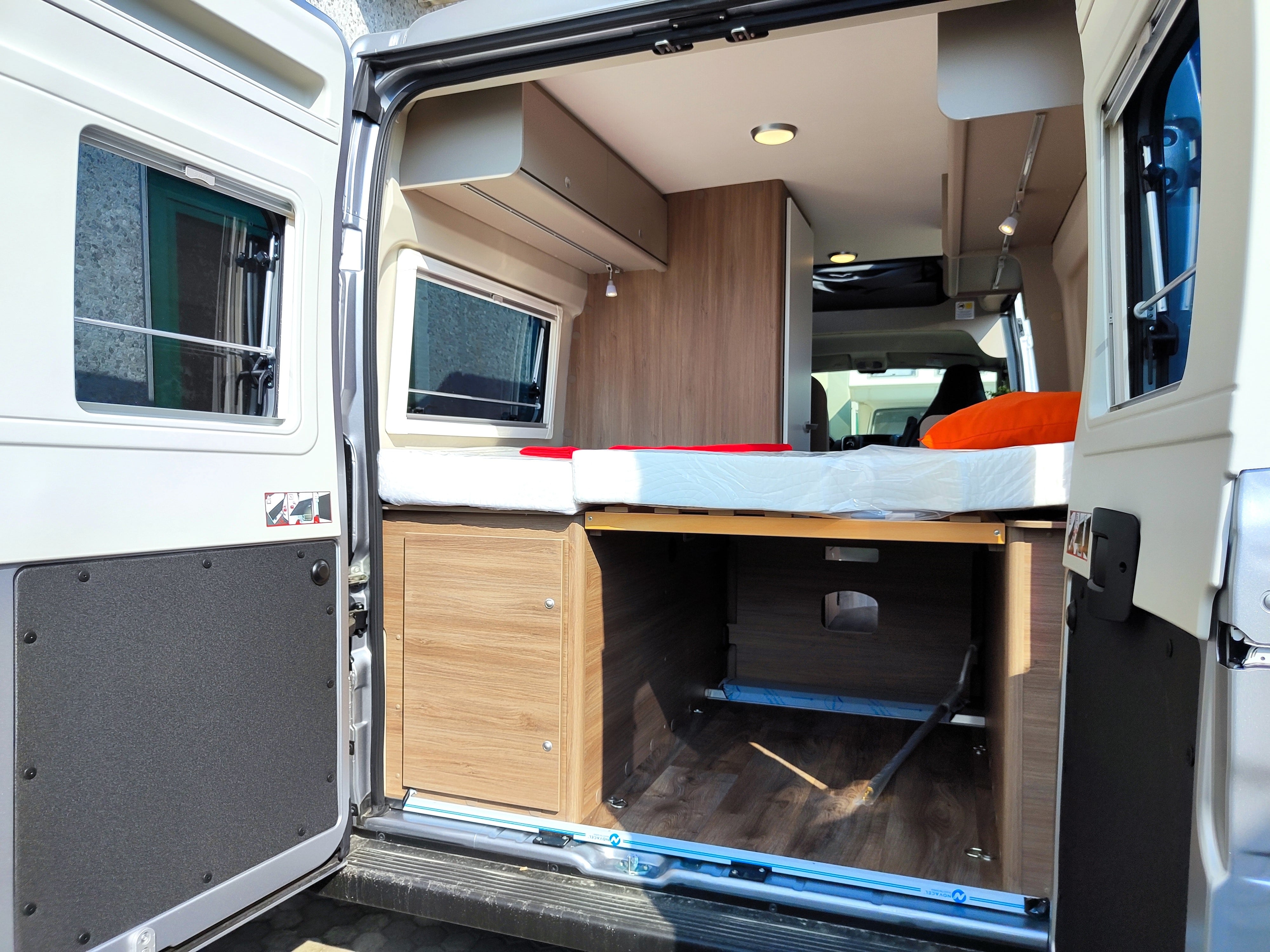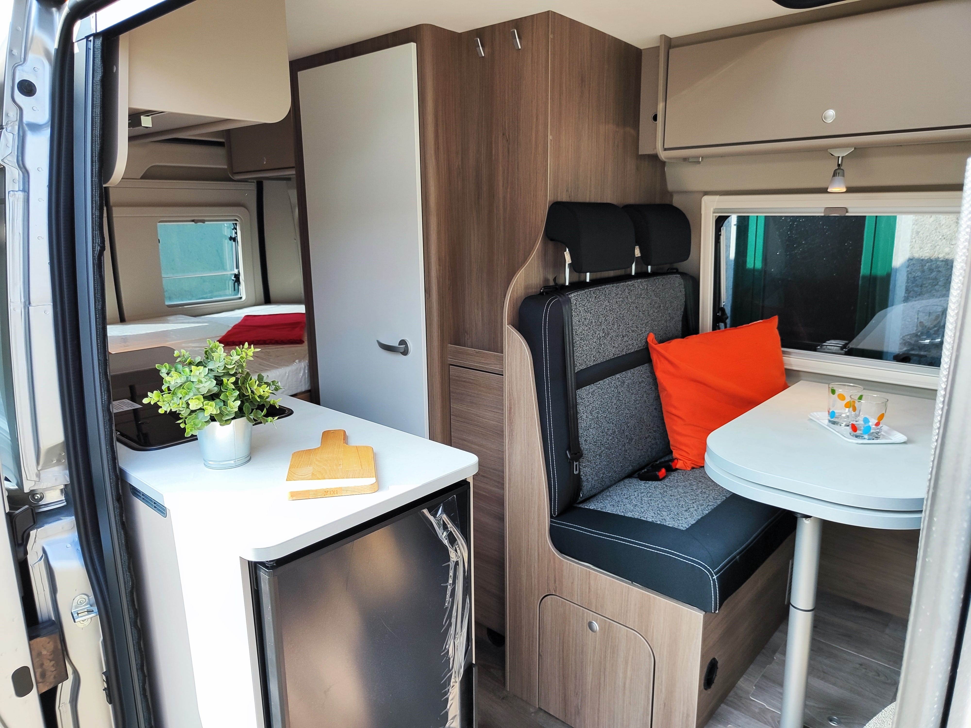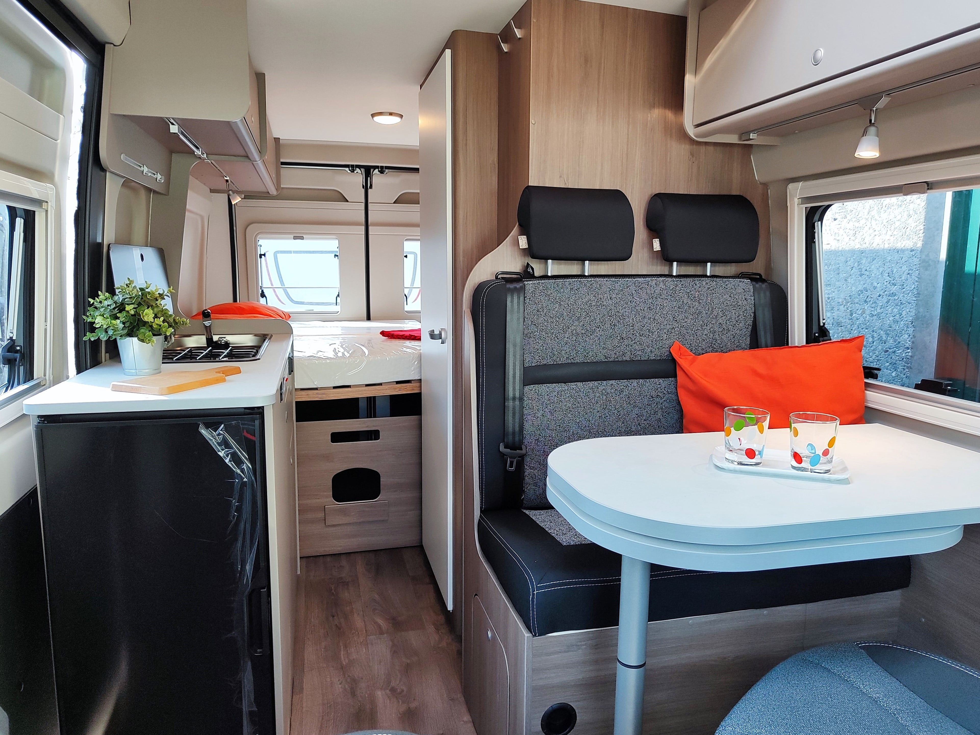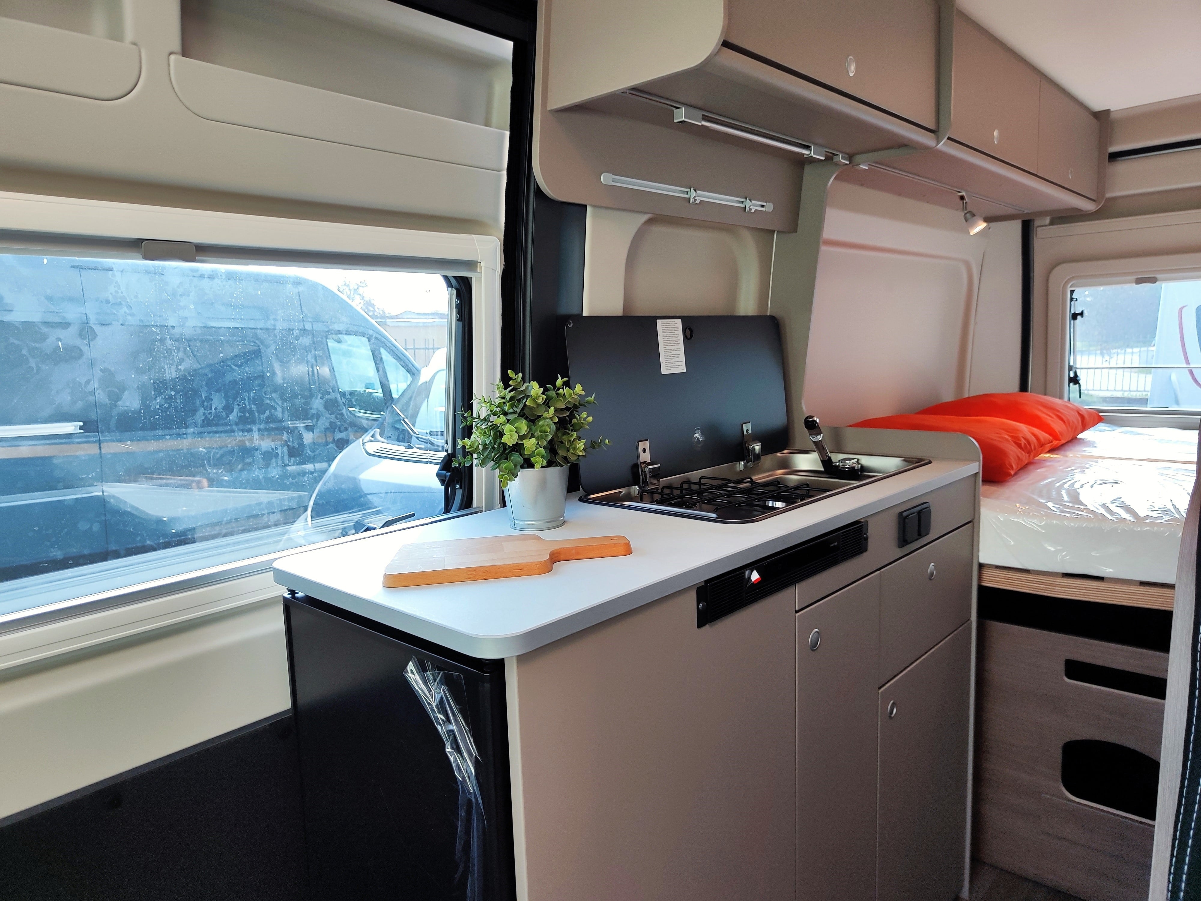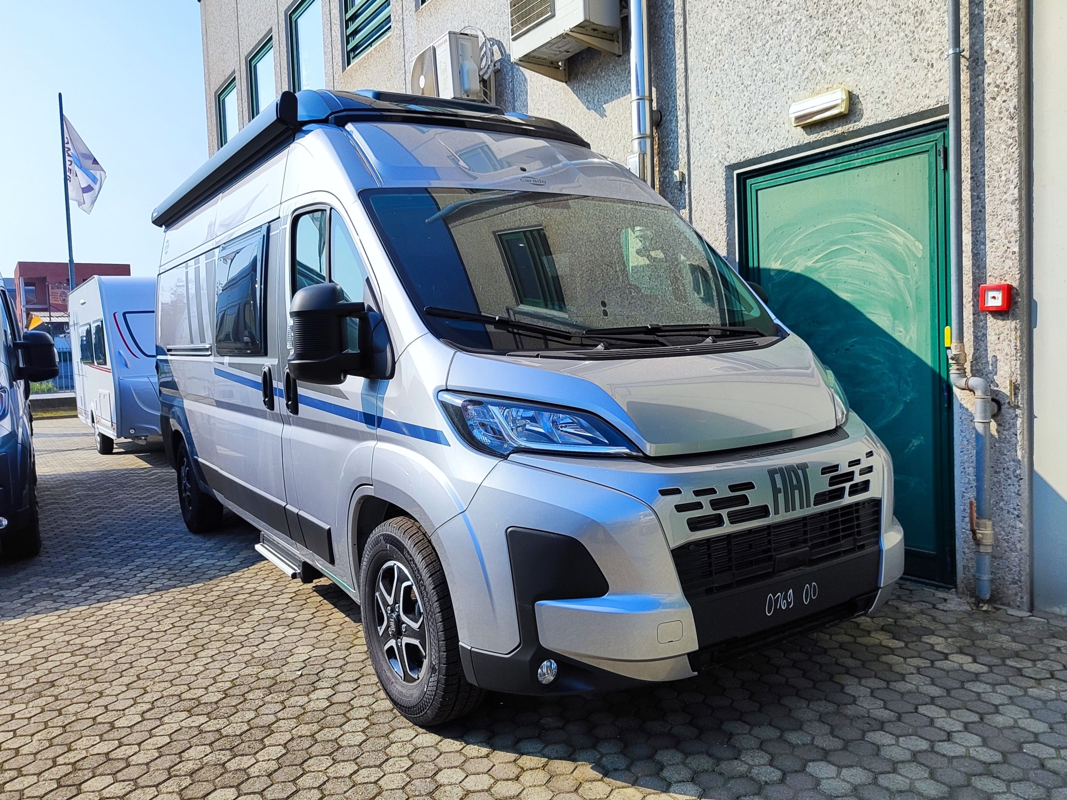 Camper furgonato nuovo con tetto sollevabile e 4 posti letto letto. Pratico e versatile, sempre equipaggiato con tutto per partire. Su Fiat Ducato 140 CV.