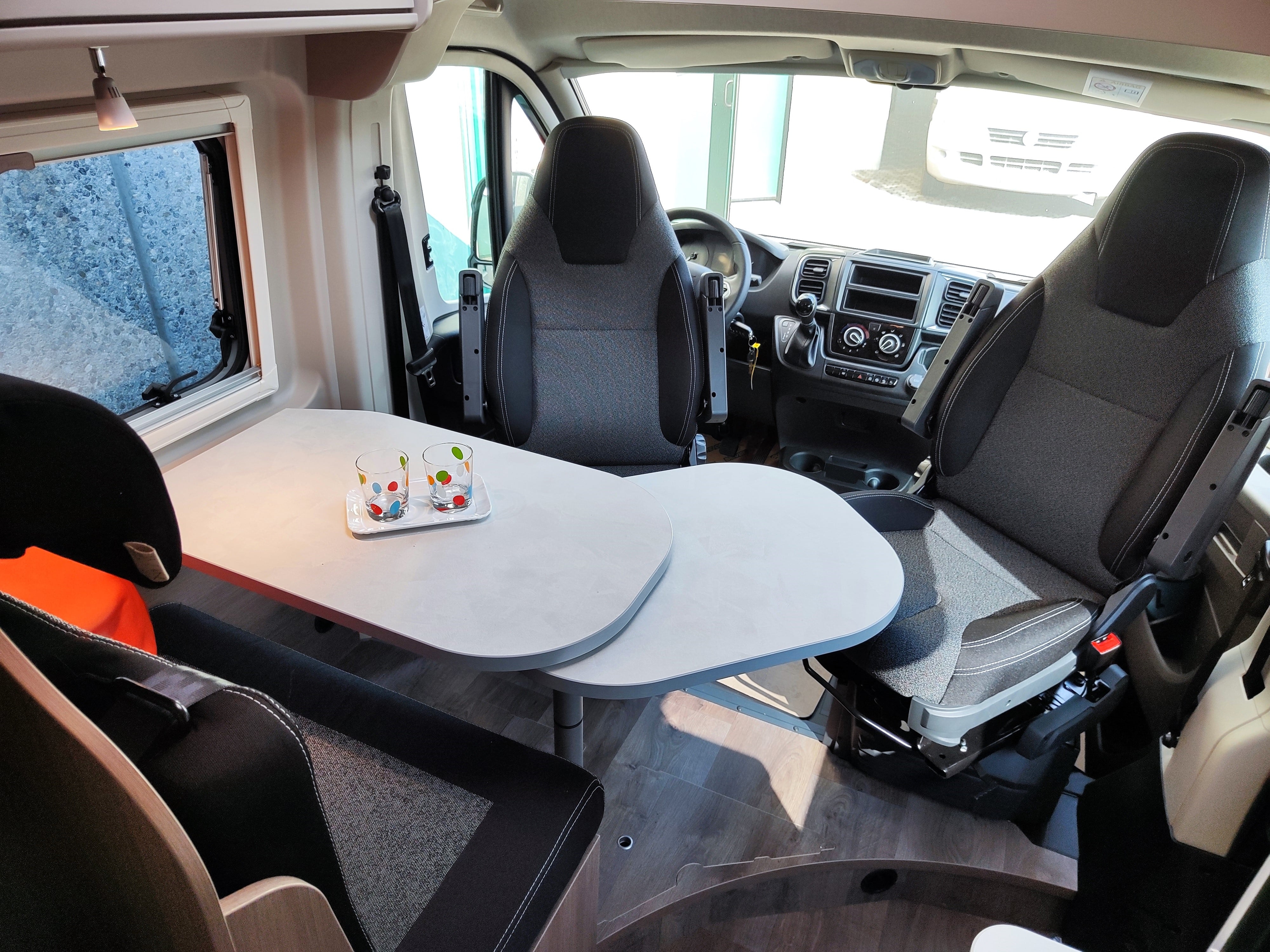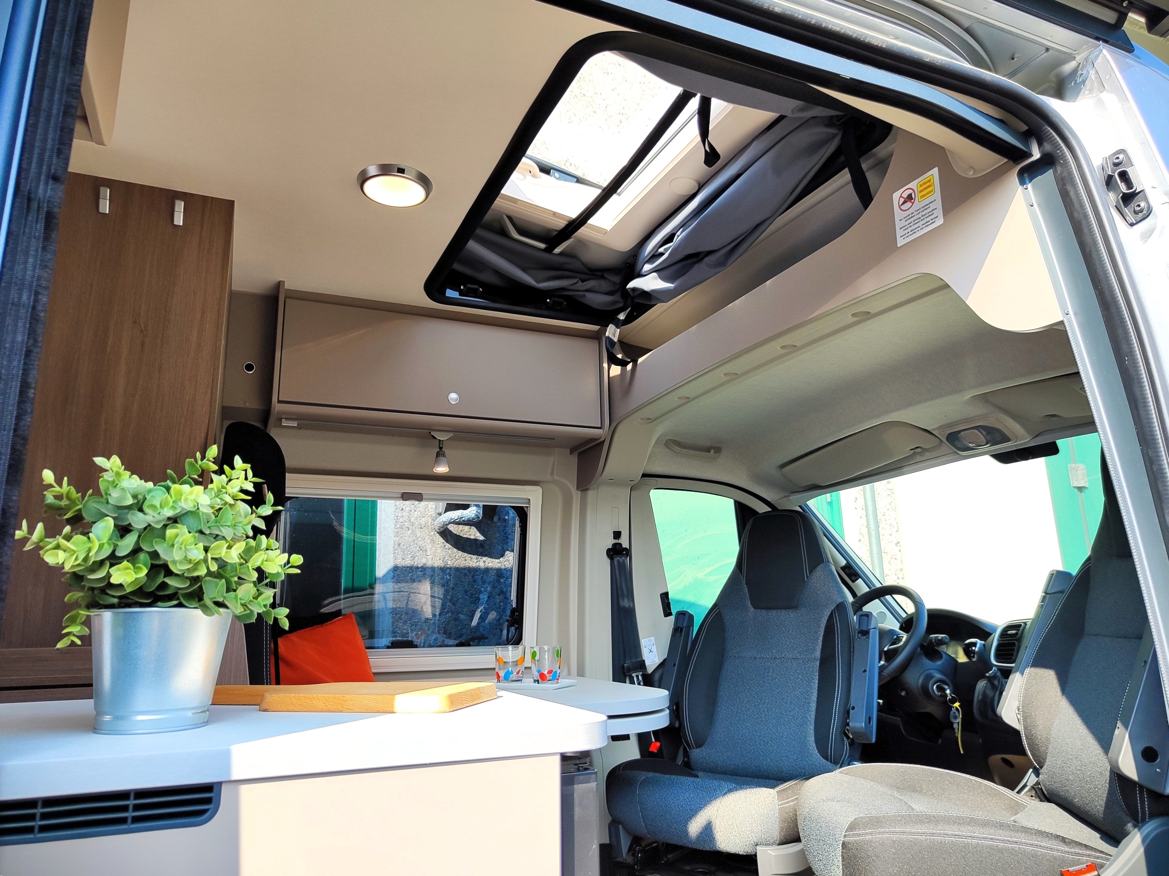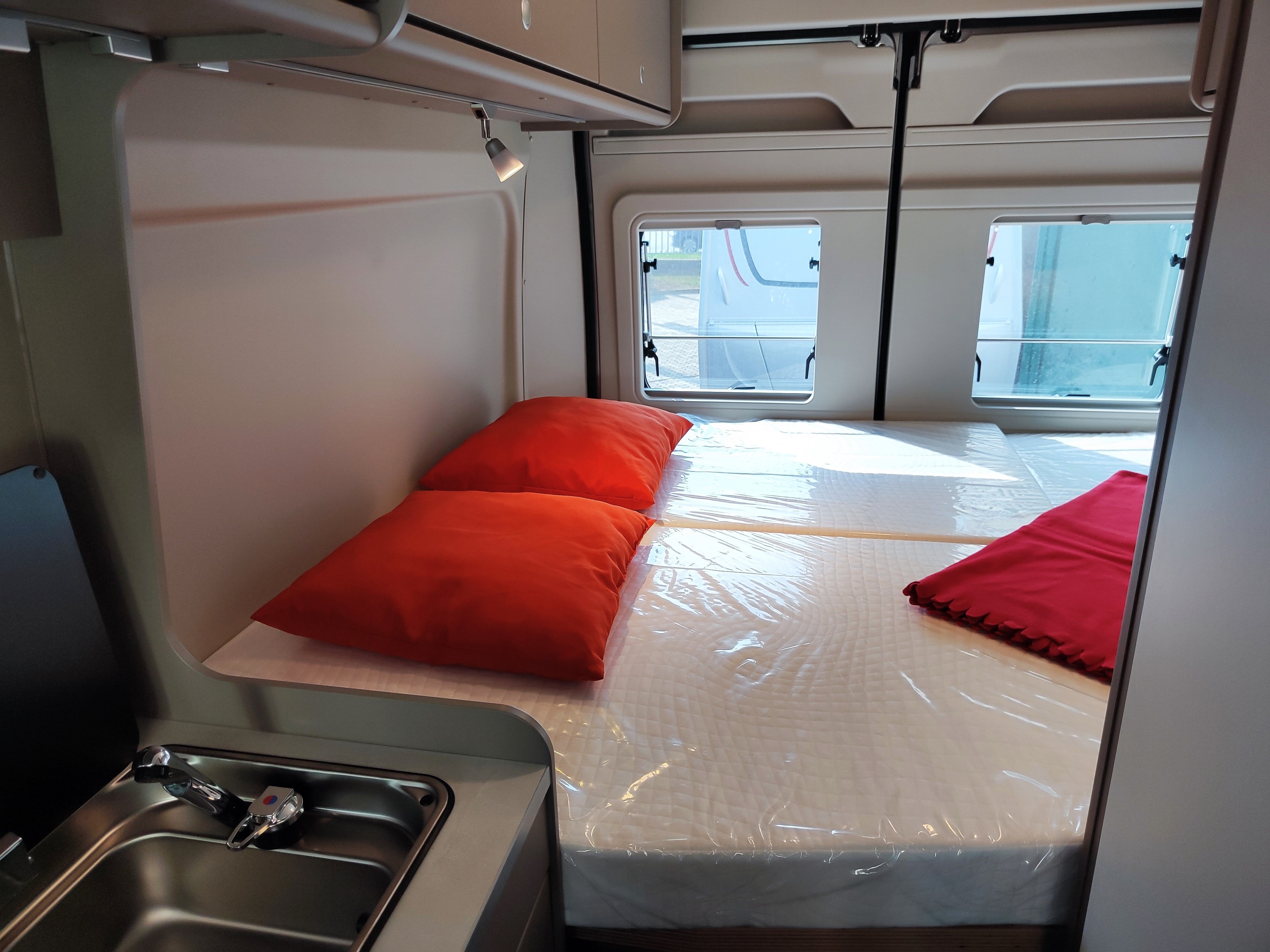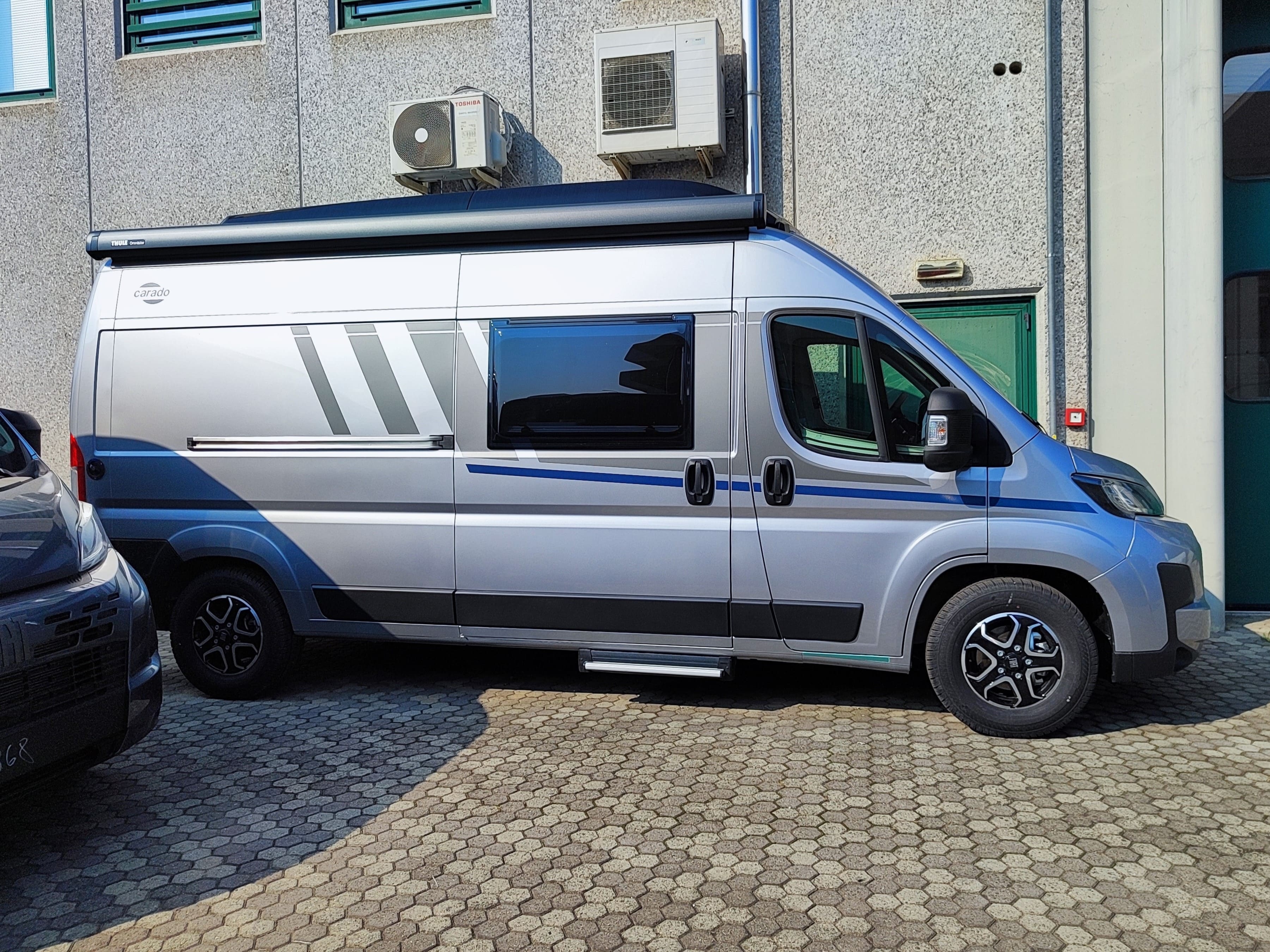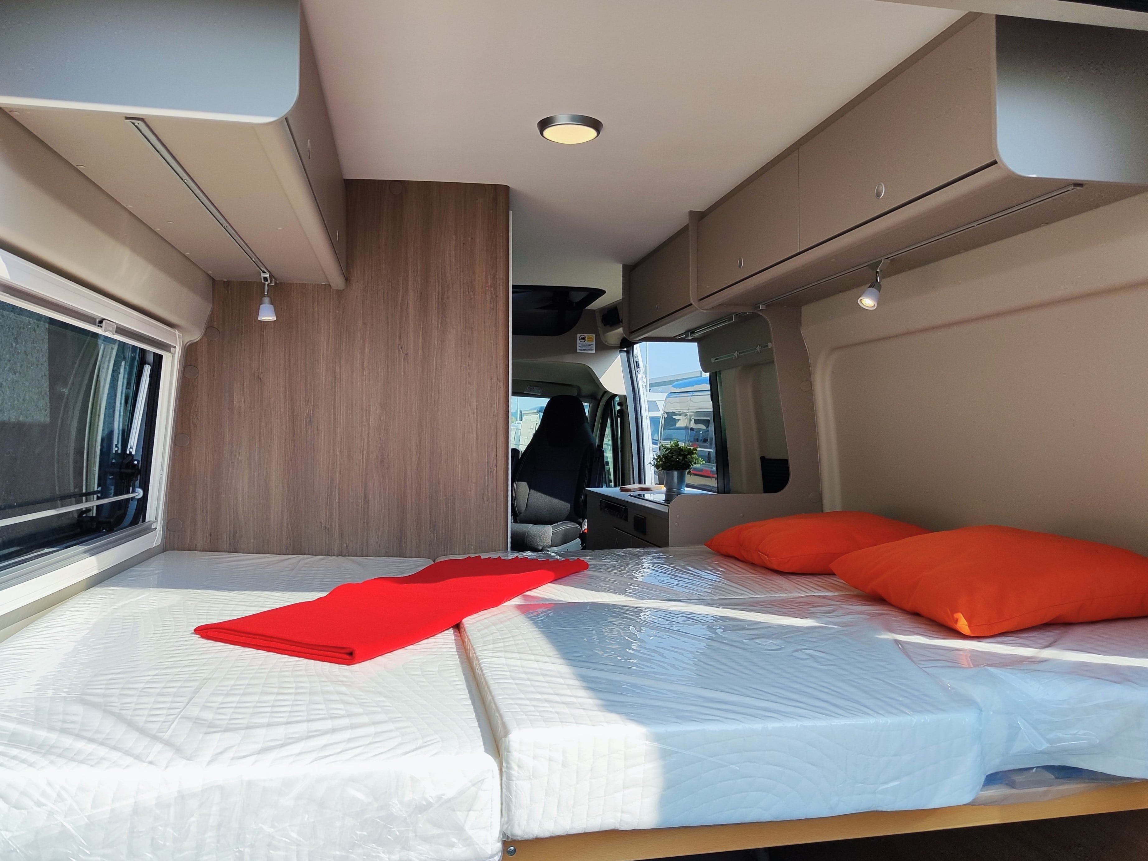 Camper furgonato nuovo con tetto sollevabile e 4 posti letto letto. Pratico e versatile, sempre equipaggiato con tutto per partire. Su Fiat Ducato 140 CV.