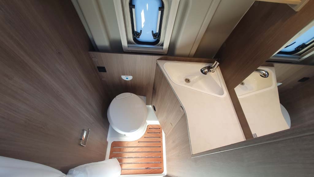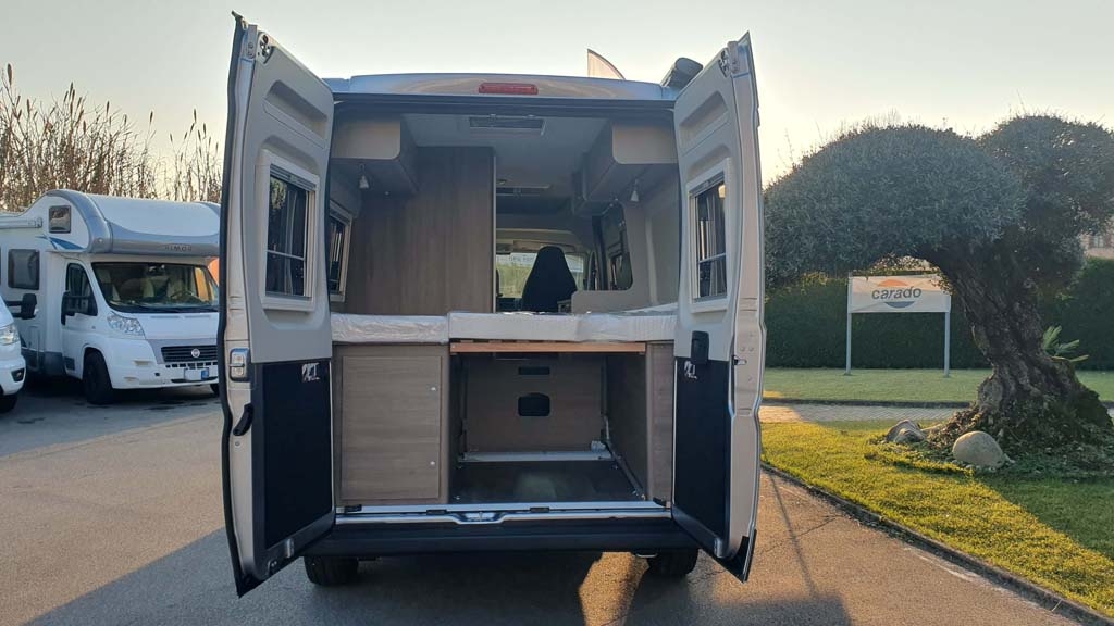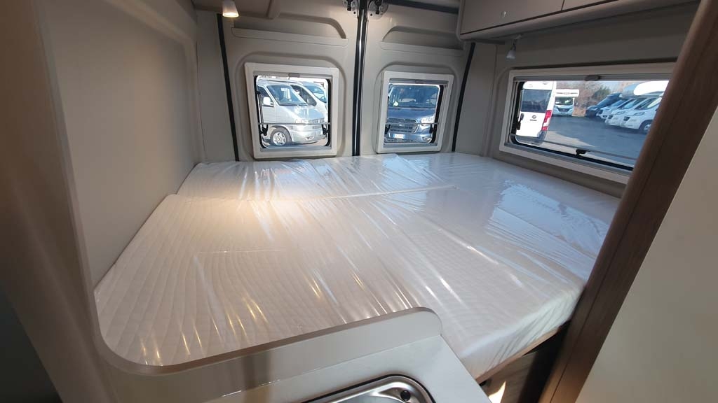 Il layout è il classico con un grande letto matrimoniale trasversale posizionato nella parte posteriore del camper, sopra ad un ampio garage utile per stivare tutto l’occorrente di cui avrete bisogno.