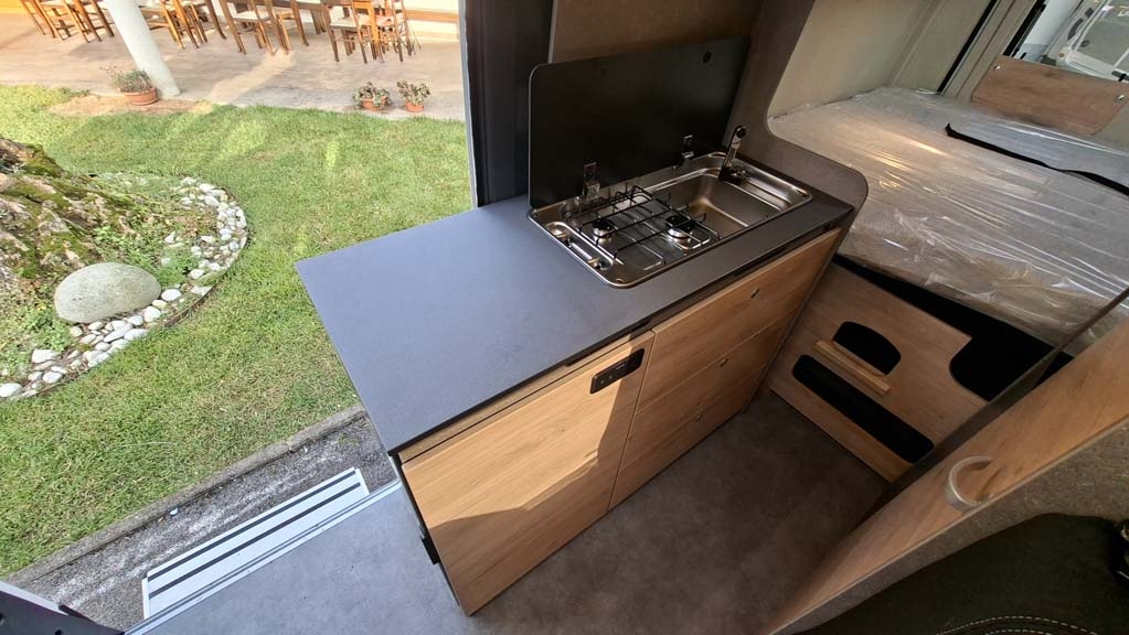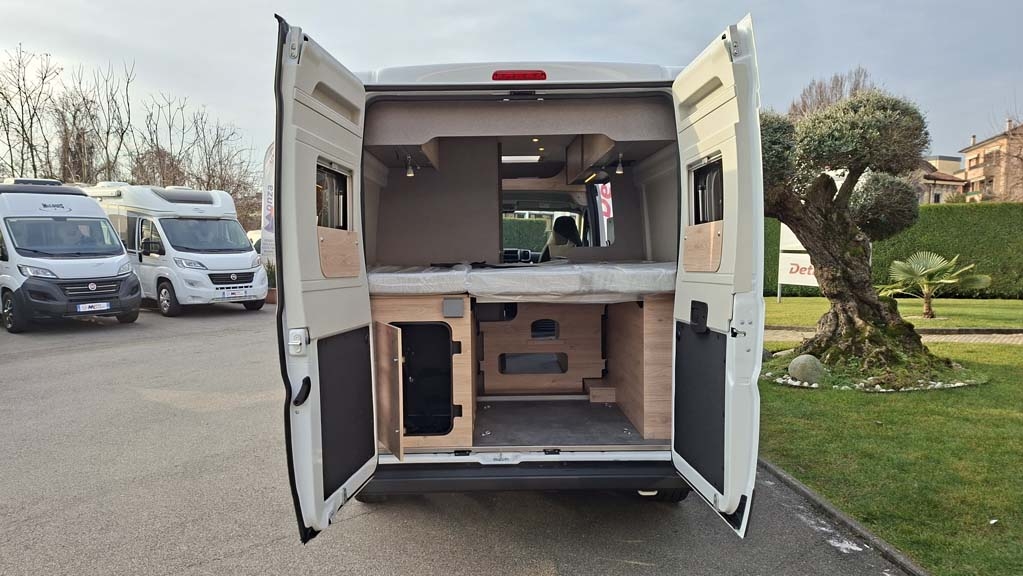 Omologato per 4 persone con 2 posti letto questo Dethleffs Globetrail Active 600 DS vi porterà lontano! Il layout è il classico con un grande letto matrimoniale trasversale posizionato nella parte posteriore del camper, sopra ad un ampio garage utile per stivare tutto l'occorrente di cui avrete bisogno. La zona giorno è composta dalla dinette e dalla cucina lineare a gas. Quest'ultima è fornita di 2 fuochi, lavandino, un ampio frigorifero a compressore da 90 Lt ed un utilissimo piano di appoggio. Il bagno si contraddistingue per la doccia con parete varia, molto comoda e spaziosa rispetto alla classica configurazione. L'acqua calda, così come il riscaldamento, sono dati dal sistema Truma Combi a gasolio 6D. Lungo meno di 6 metri, questo van è su base Fiat Ducato 140 Multijet Euro 6 con 140 cavalli e cambio manuale. Compreso nel prezzo troverete inoltre l'aria condizionata in cabina, oscuranti plissettati in cabina e zanzariera alla porta d'ingresso. Tra le altre dotazioni abbiamo: