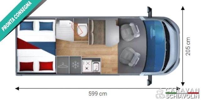 DOTAZIONI DI SERIE DI NELLA VERSIONE 60Be YOUNG : Veranda, CITROEN o PEUGEOT da 2.000 cc con 120cv, Portata 35Qli., Climatizzatore cabina manuale, Pneumatici M+S, 4 stagioni, Airbag guidatore e passeggero, ESP, traction Plus, Hill holder, Hill descent, Start & Stop, ABS, Cruise control, Predisposizione radio DAB, Cambio manuale 6 marce, Sedili cabina girevoli, Volante regolabile, Specchietti retrovisori elettrici e riscaldati, Comandi radio al volante, Stufa Combi Gas 4000, Comando Truma CP Plus, Attacchi ISOFIX, Cerchi 15',', in acciaio, Kit Oscurante isolante interno cabina, Predisposizione retrocamera, Chiusura centralizzata, Finestra Seitz, Predisposizione pannello solare, Predisposizione tv digitale/sat, Doghe sul letto posteriore.PUNTI DI FORZA= Letti posteriori sovrapposti (133×186 cm ? / 124×186 cm ?), Ampio piano cucina e frigorifero a compressore da 90L, Bagno con doccia separata 'VARIO' e sistema Truma Combi 4000. , , , , ,GIOTTIVAN 60 BE YOUNG è, il van perfetto per chi cerca uno stile di viaggio giovane, dinamico e senza rinunce. Con una lunghezza di 5,99 metri, offre una disposizione interna ottimizzata con letti matrimoniali a castello posteriori, cucina compatta e funzionale, e bagno con doccia integrata. La zona giorno è, luminosa e accogliente, pensata per condividere momenti di relax o pasti in compagnia. Gli spazi contenitivi sono ben distribuiti, ideali per chi viaggia con attrezzature sportive o bagagli al seguito. , ,NOVITA', 2026 , ,IN PRONTA CONSEGNA , , , , , , , , ,.