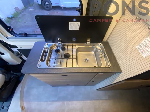 Cucina attrezzata con piano cottura a 2 fuochi, frigorifero a colonna e ampi spazi di stivaggio. Bagno con doccia, e una comoda dinette con tavolo dotato di prolunga ruotabile e sedili cabina girevoli.