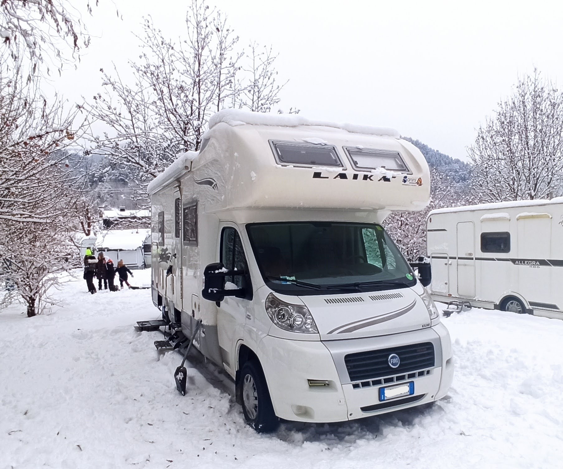 Avendo questo modello la stufa in coda, soffre la zona anteriore nei climi più rigidi. Problema risolto con un cinebasto all'anteriore