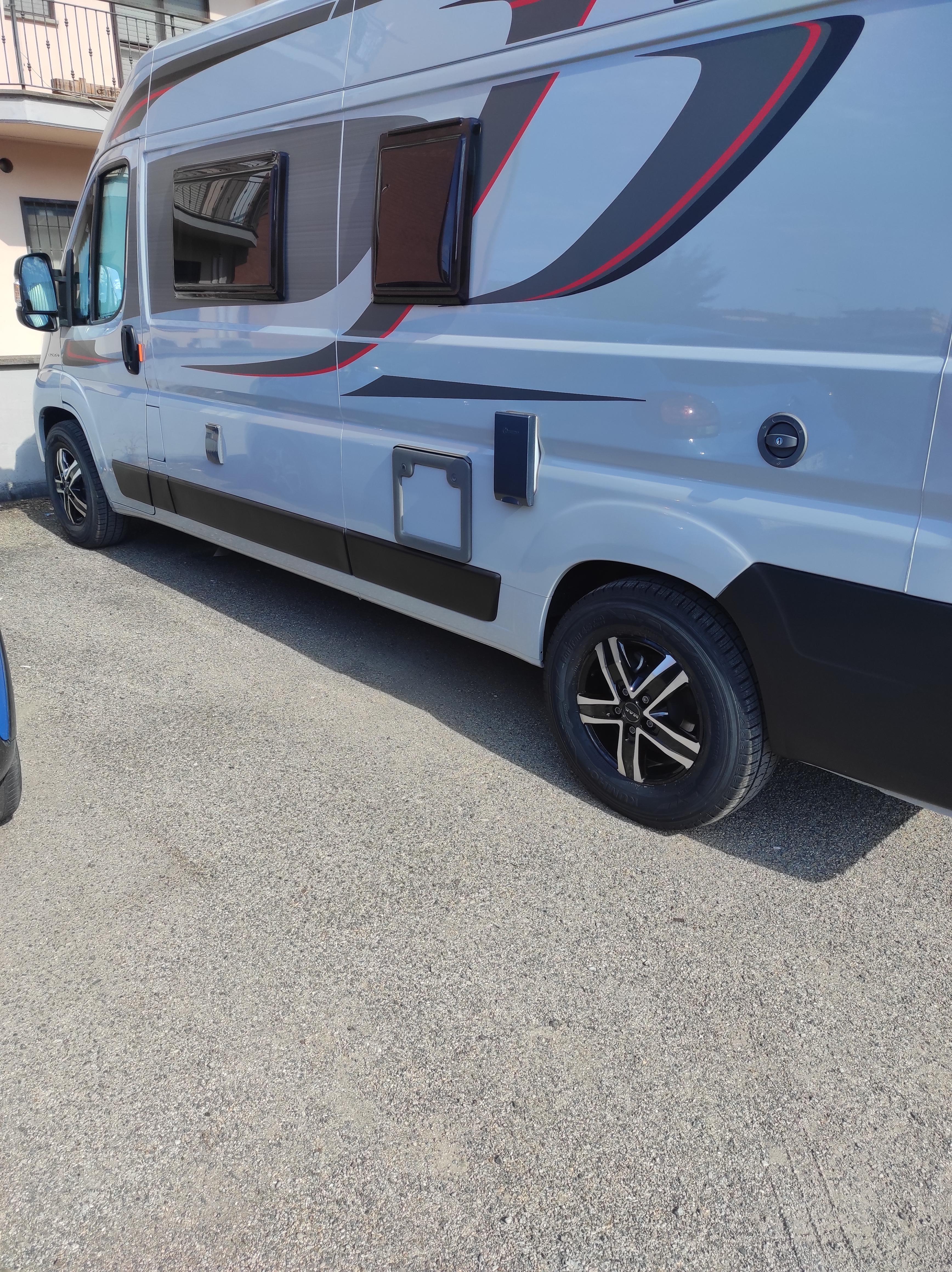 Ha già di serie pannello, veranda, oscuranti remis, telecamera. Aggiunti antifurto, luce esterna, portabici, ruote da 16" e maxxfan zona letto